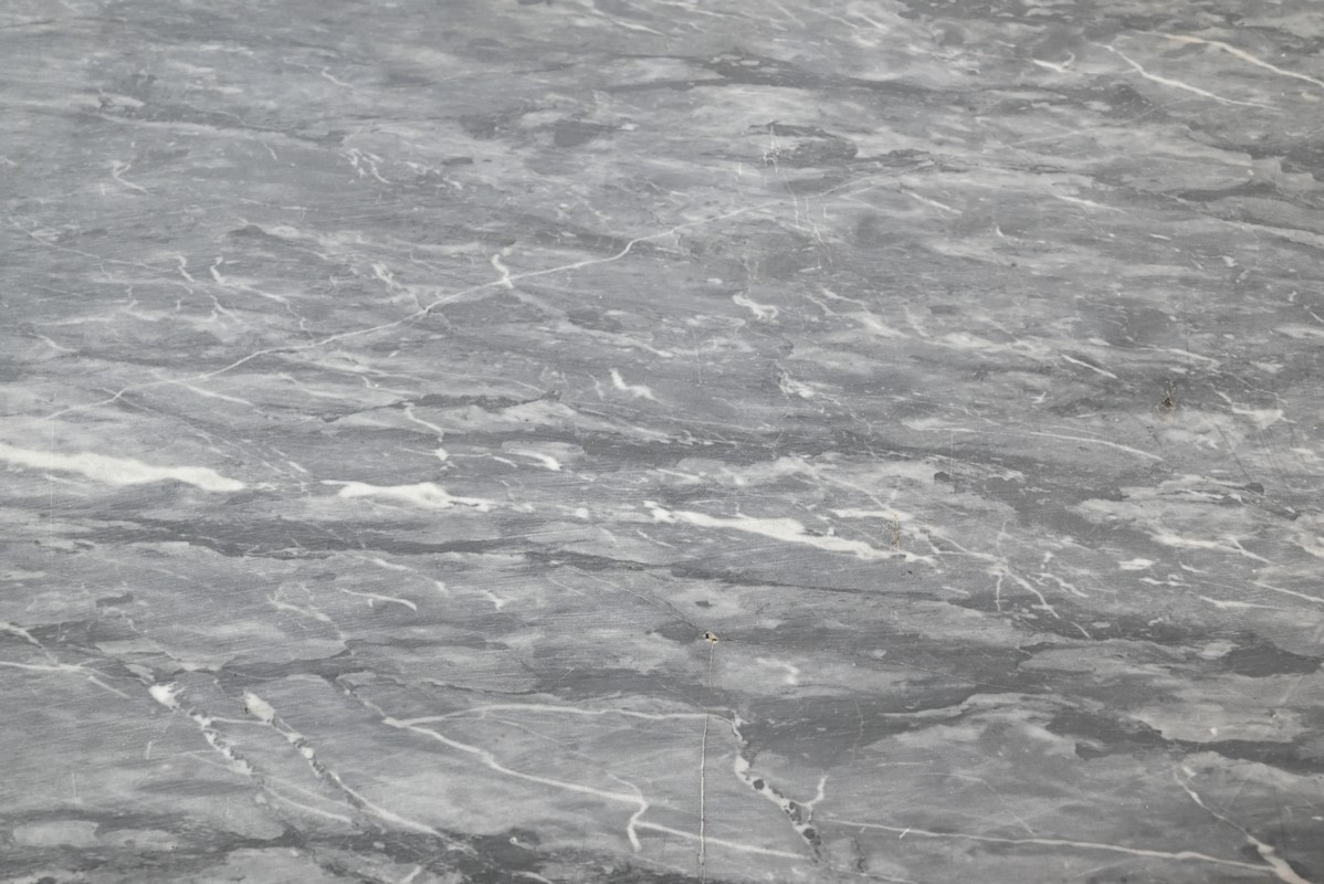 Le dessus présente un marbre gris encastré souligné par un cadre à coupes d’onglet mouluré en dessous sur les trois faces visibles.