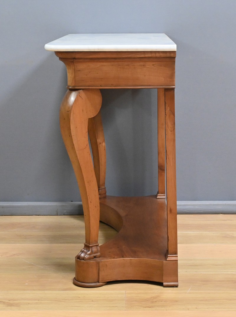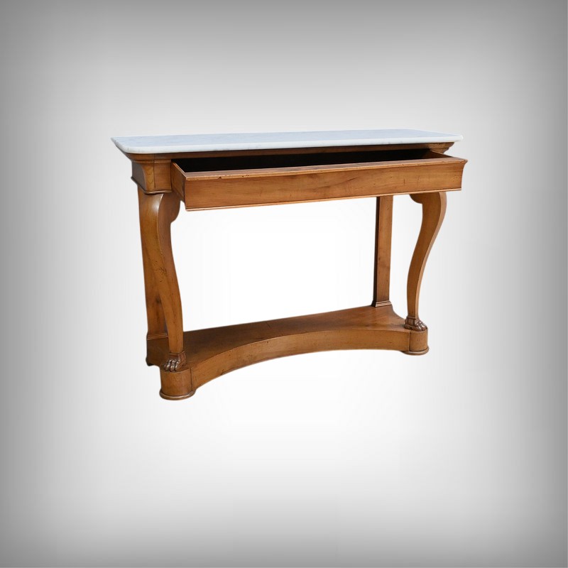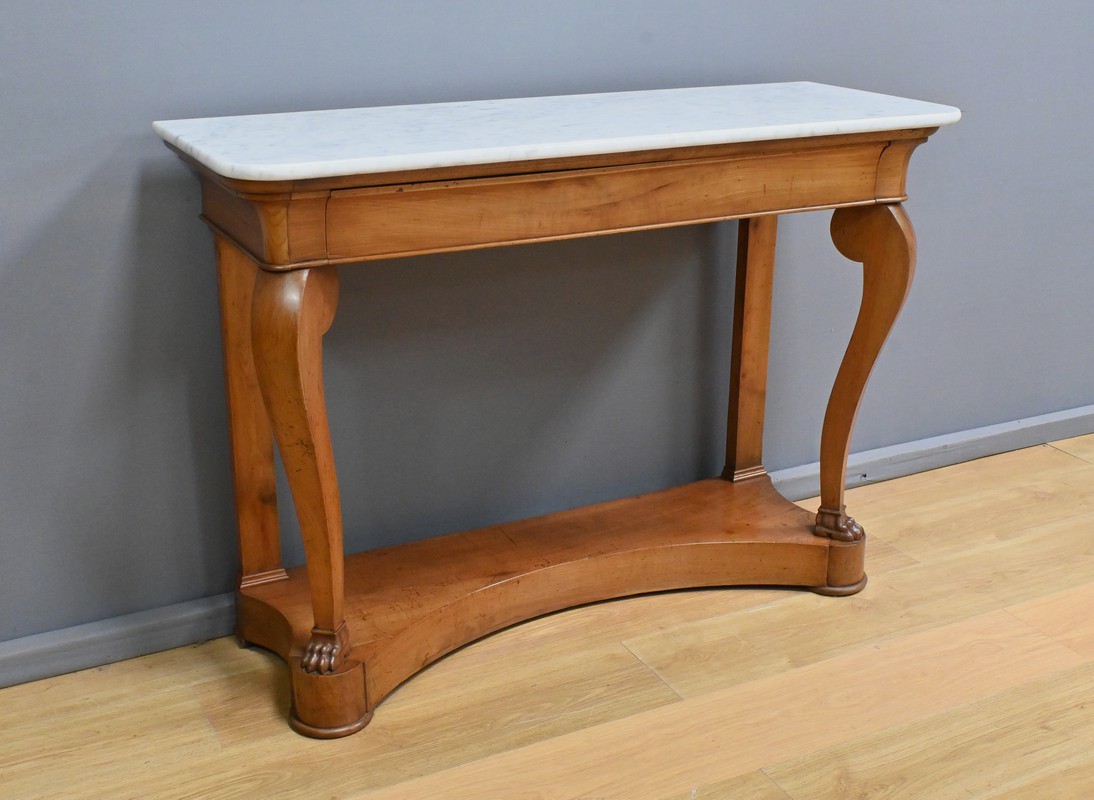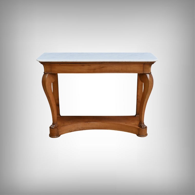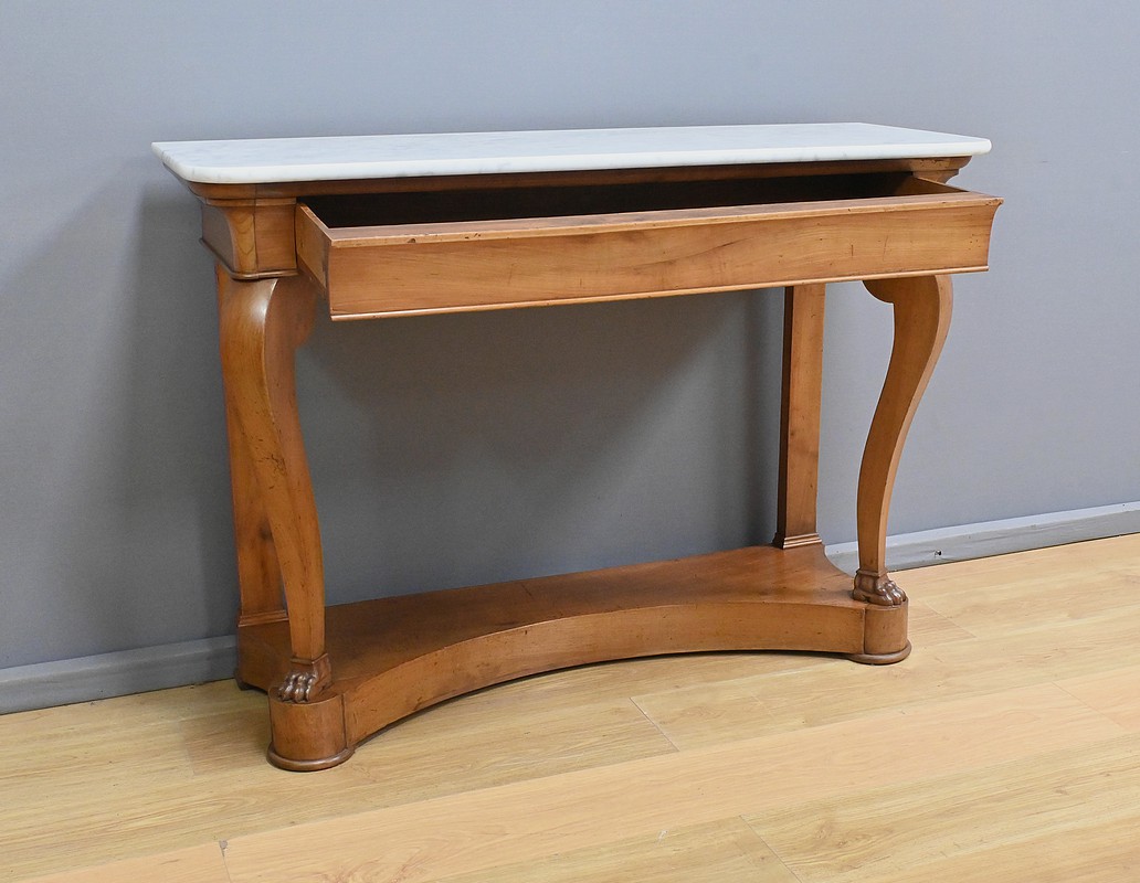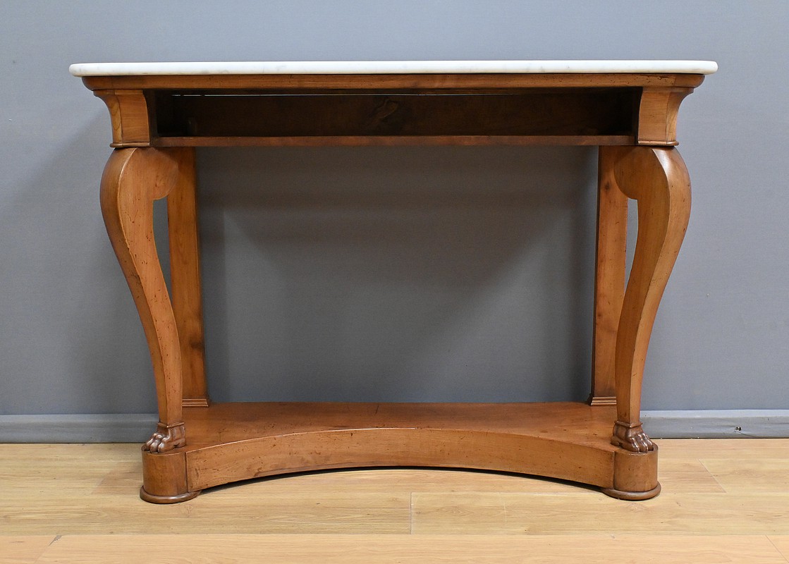 Cette console datant du début du XIXe siècle incarne le raffinement du mobilier d’époque Restauration. Elle se distingue par son placage en merisier chatoyant et son marbre blanc de carrare au contour adouci et aux angles antérieurs arrondis. Cette pièce de mobilier ouvre par un tiroir dissimulé en ceinture s’intégrant harmonieusement à l’ensemble. Cette console possède à l’avant des pieds galbés en volute qui lui confèrent une silhouette gracieuse et équilibrée. Chacun d’entre eux se termine par des griffes de lion, symbole de puissance et de majesté dans l’art décoratif du XIXe siècle. Enfin, l’ensemble repose sur un socle concave assurant stabilité et robustesse. Elle s’impose comme un élément décoratif de choix pour les amateurs de mobilier ancien.