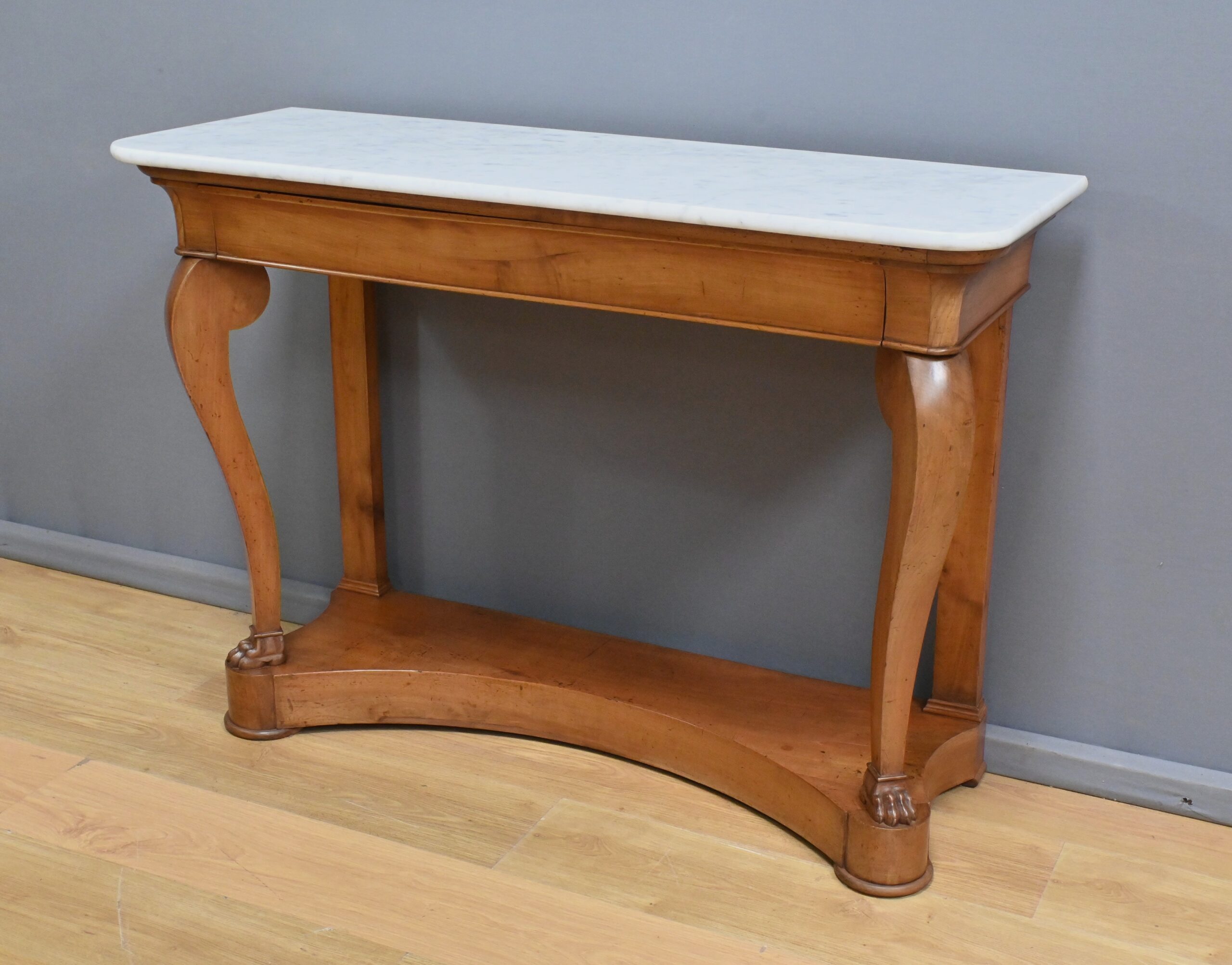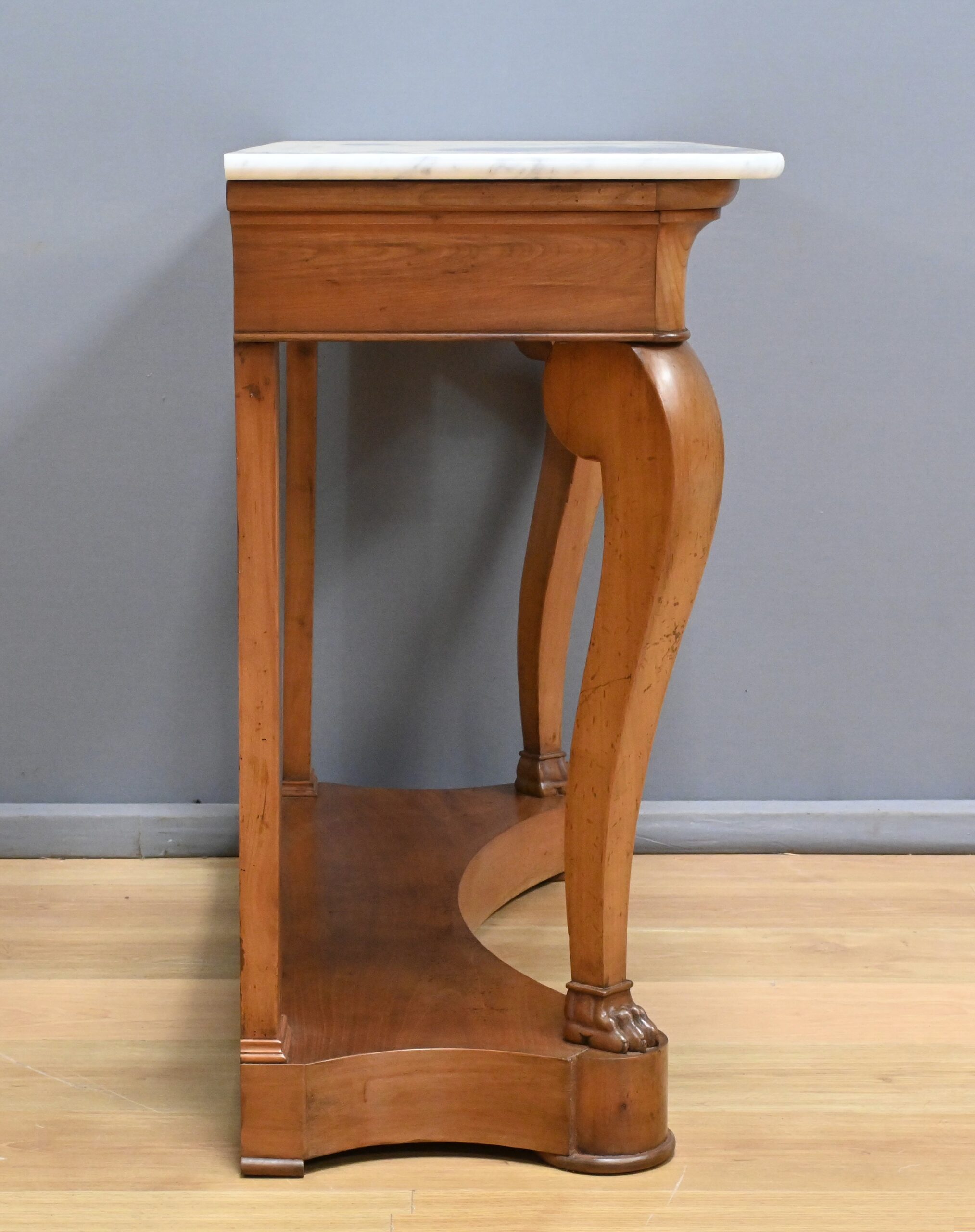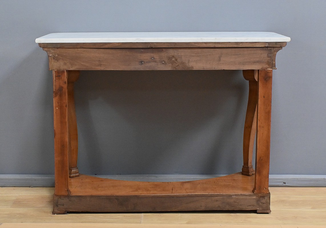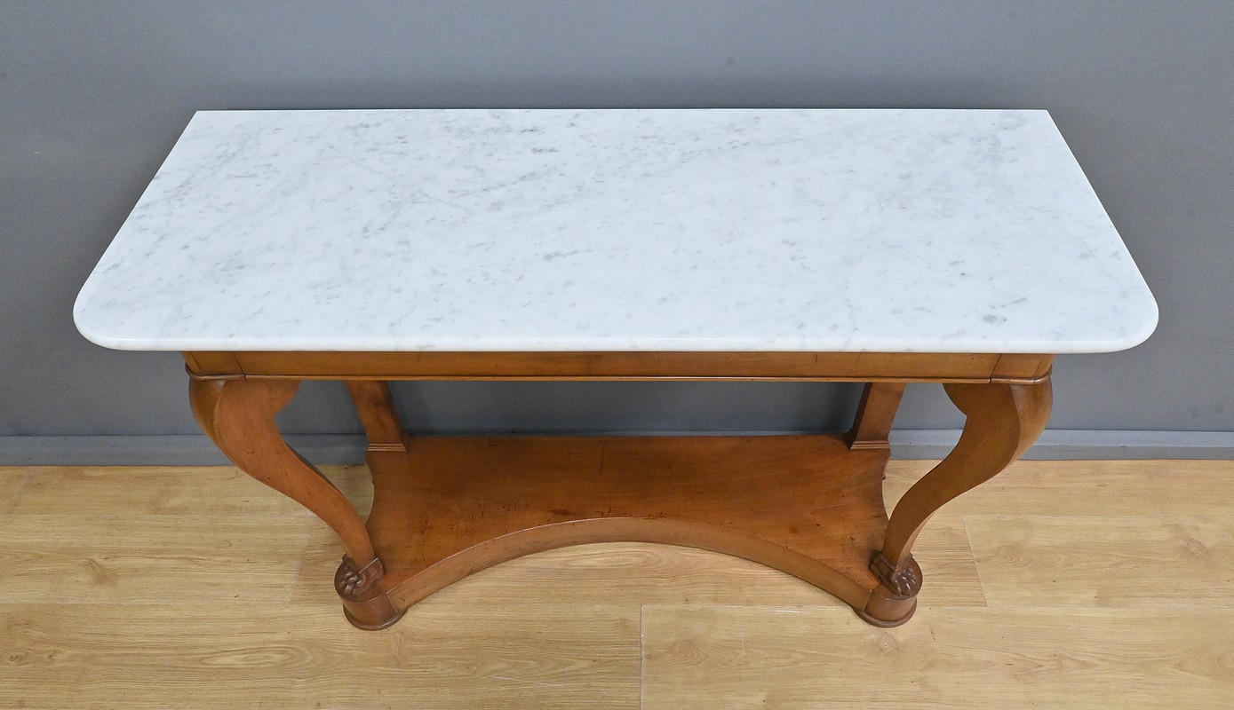 Cette console datant du début du XIXe siècle incarne le raffinement du mobilier d’époque Restauration. Elle se distingue par son placage en merisier chatoyant et son marbre blanc de carrare au contour adouci et aux angles antérieurs arrondis. Cette pièce de mobilier ouvre par un tiroir dissimulé en ceinture s’intégrant harmonieusement à l’ensemble. Cette console possède à l’avant des pieds galbés en volute qui lui confèrent une silhouette gracieuse et équilibrée. Chacun d’entre eux se termine par des griffes de lion, symbole de puissance et de majesté dans l’art décoratif du XIXe siècle. Enfin, l’ensemble repose sur un socle concave assurant stabilité et robustesse. Elle s’impose comme un élément décoratif de choix pour les amateurs de mobilier ancien.
