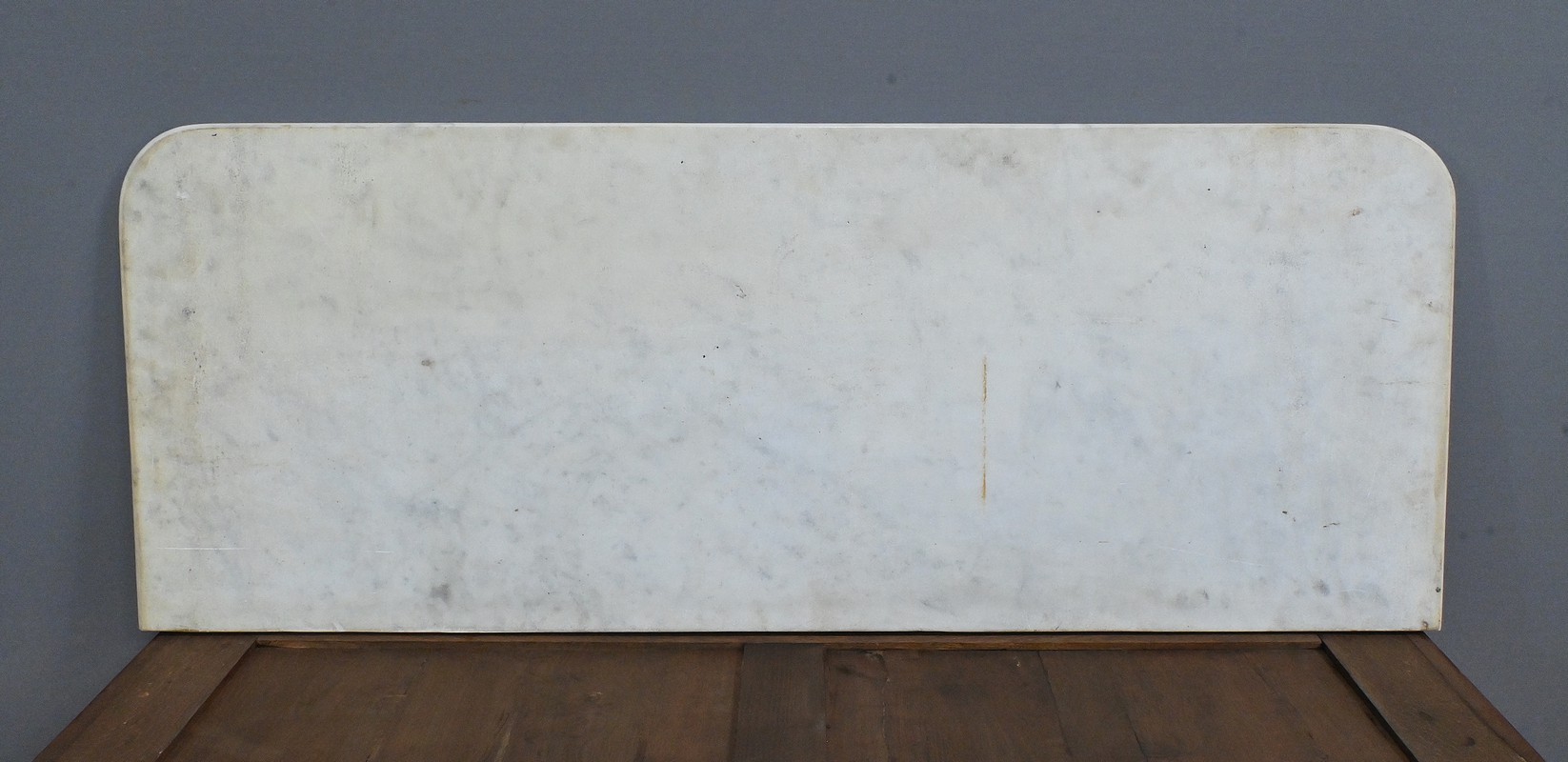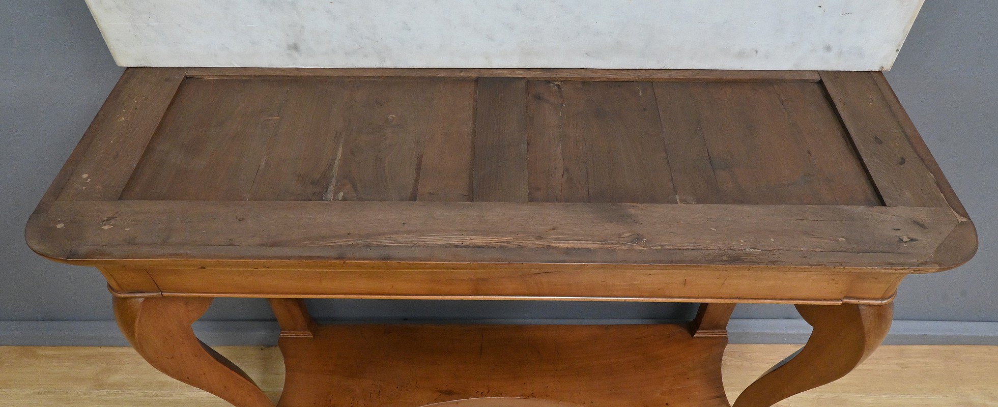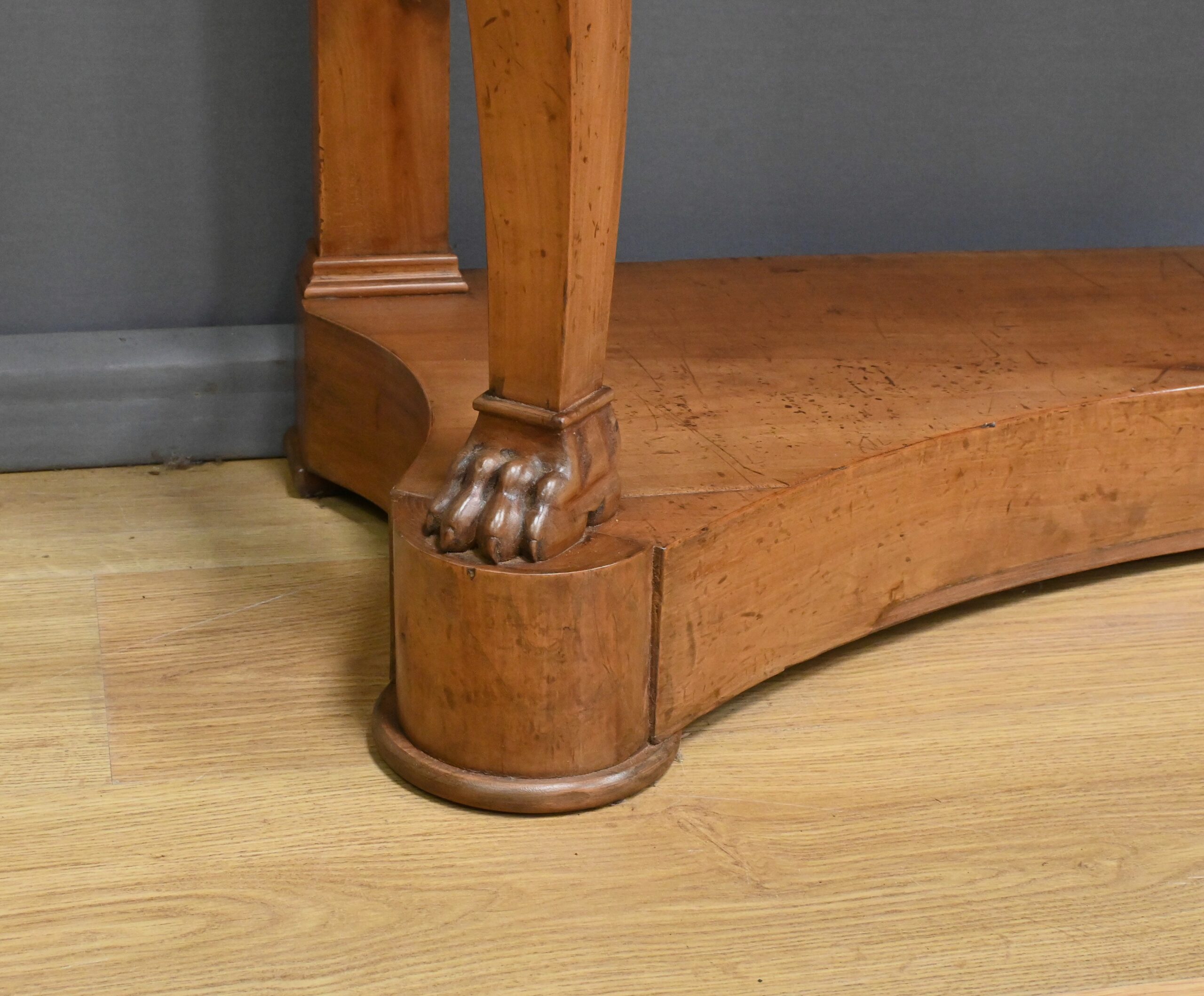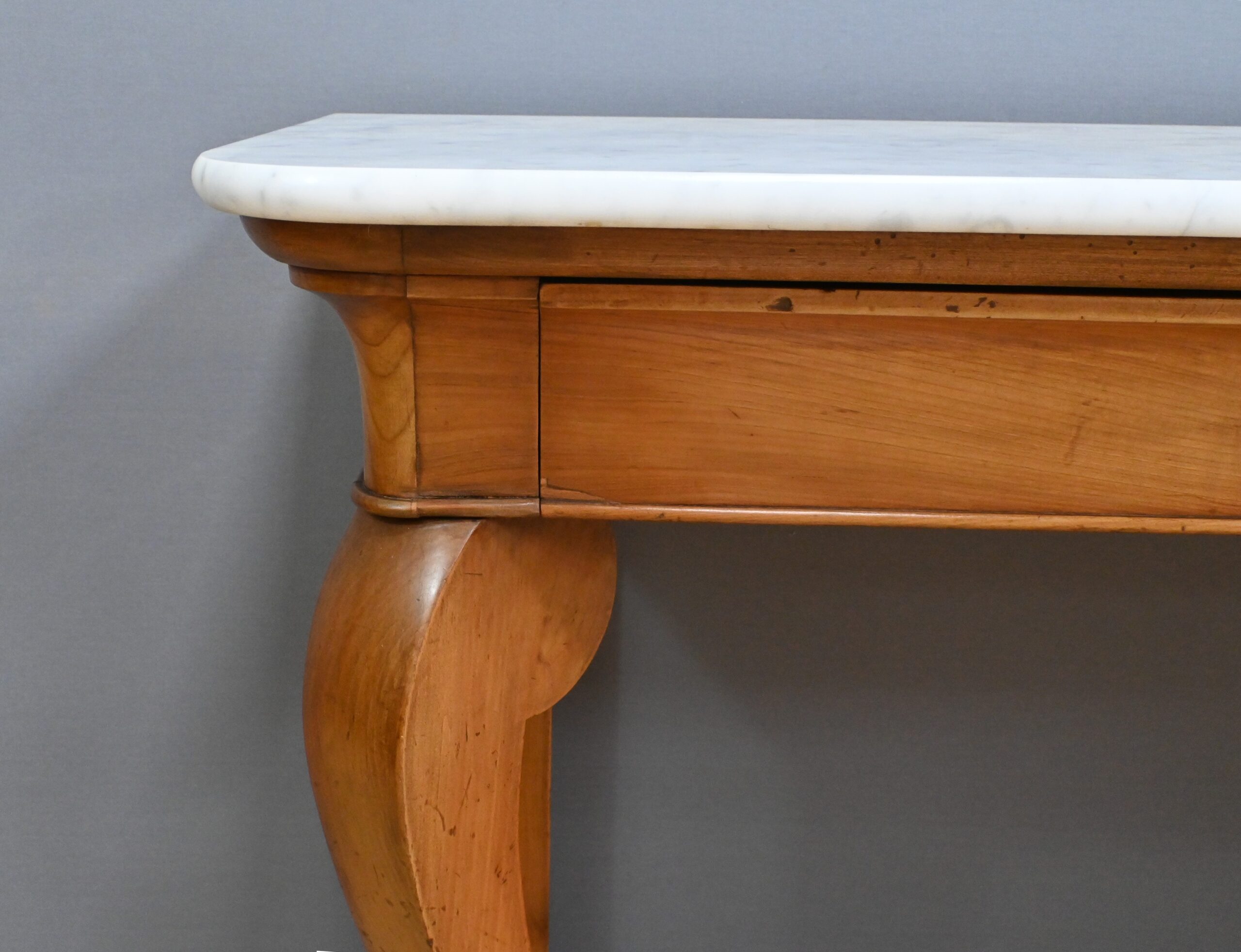 Cette console datant du début du XIXe siècle incarne le raffinement du mobilier d’époque Restauration. Elle se distingue par son placage en merisier chatoyant et son marbre blanc de carrare au contour adouci et aux angles antérieurs arrondis. Cette pièce de mobilier ouvre par un tiroir dissimulé en ceinture s’intégrant harmonieusement à l’ensemble. Cette console possède à l’avant des pieds galbés en volute qui lui confèrent une silhouette gracieuse et équilibrée. Chacun d’entre eux se termine par des griffes de lion, symbole de puissance et de majesté dans l’art décoratif du XIXe siècle. Enfin, l’ensemble repose sur un socle concave assurant stabilité et robustesse. Elle s’impose comme un élément décoratif de choix pour les amateurs de mobilier ancien.