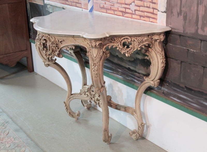 Console de style Louis XV en bois naturel. Elle est sculptée de branches fleuries et de rocailles. Ses pieds cambrés sont entretoisés. Dessus de marbre blanc mouluré.