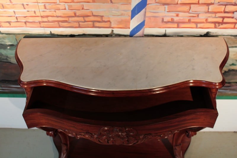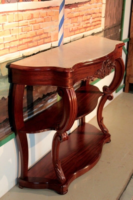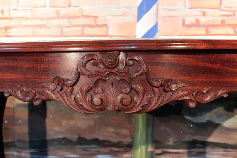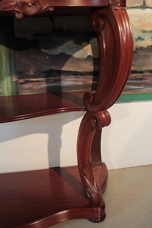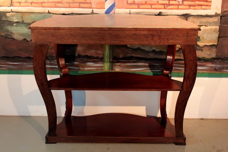 Console NAPOLÉON III en acajou et placage d’acajou, avec dessus en marbre blanc (léger fêle recollé et repoli). Elle ouvre par un grand tiroir dans le bandeau dont la façade est ornée d’une sculpture de rinceaux et de fleurs. Les pieds à volutes sont réunis par une étagère d’entretoise et reposent sur une console.