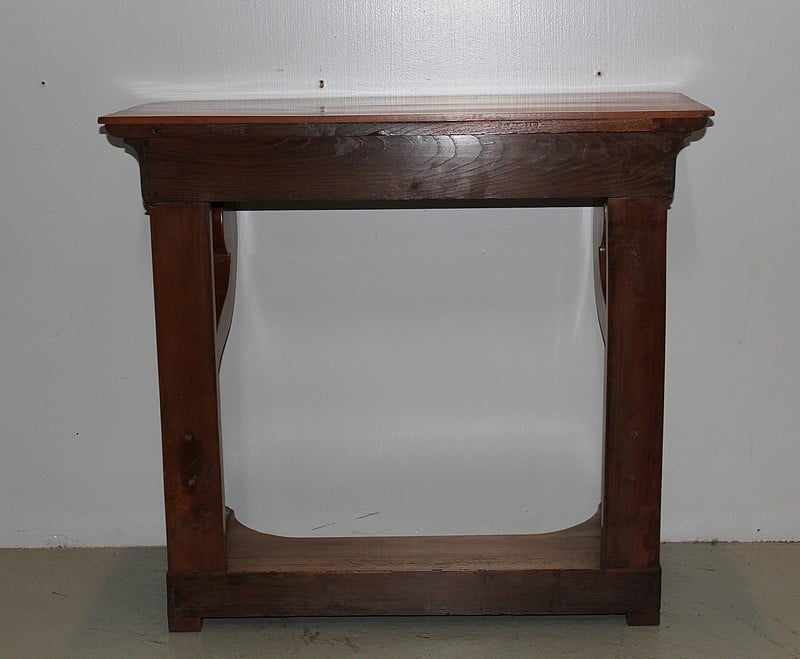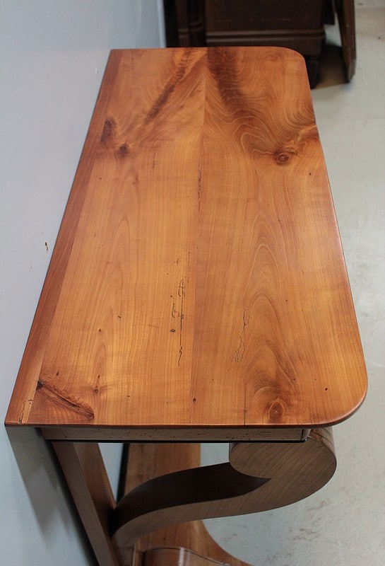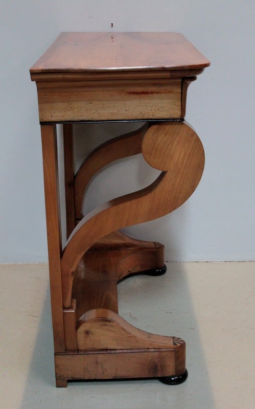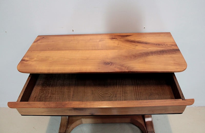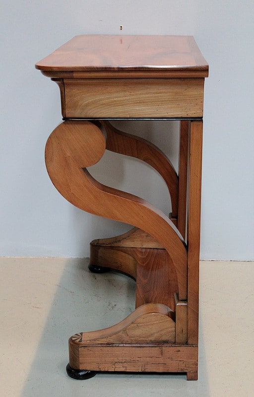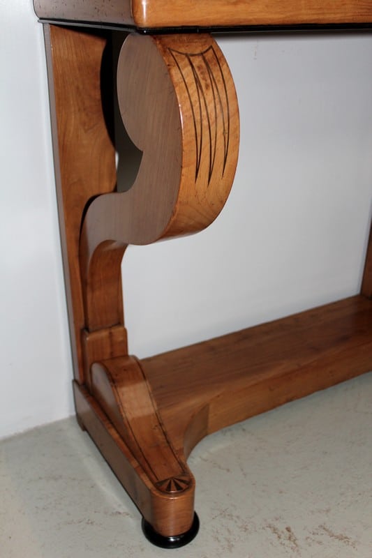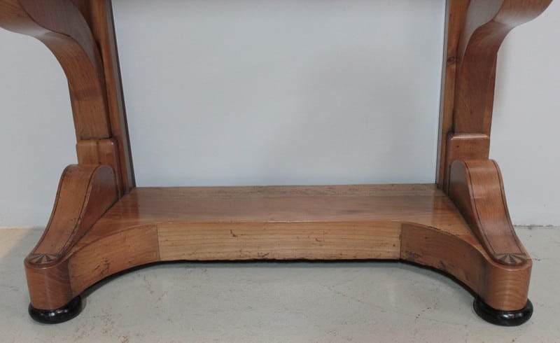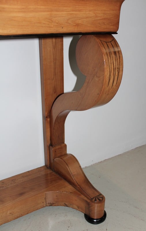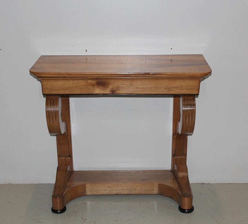 Petite console Restauration en merisier blond – dessus bois – avec incrustations de filets et de motifs en amarante.