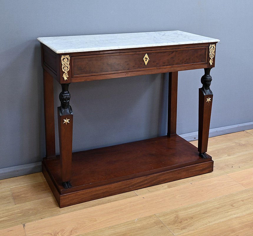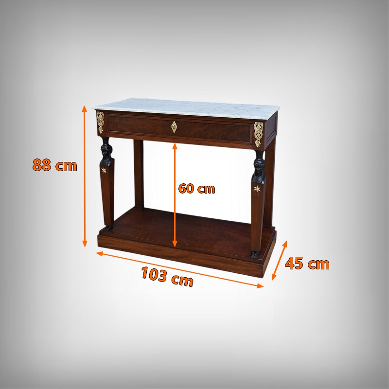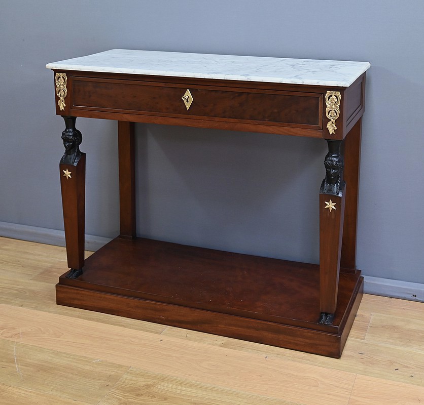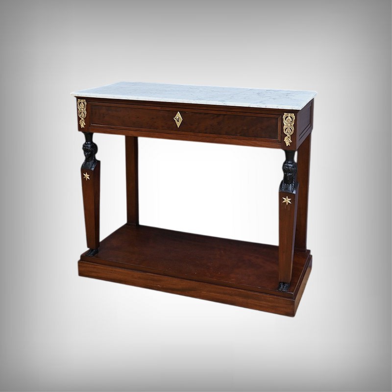 Cette somptueuse console en acajou et placage d’acajou, datant du début du XIXe siècle, incarne toute la grandeur du style Empire et l’influence du goût pour l’Égypte antique qui marqua cette époque. Elle constitue une pièce rare, à la fois décorative et historique.