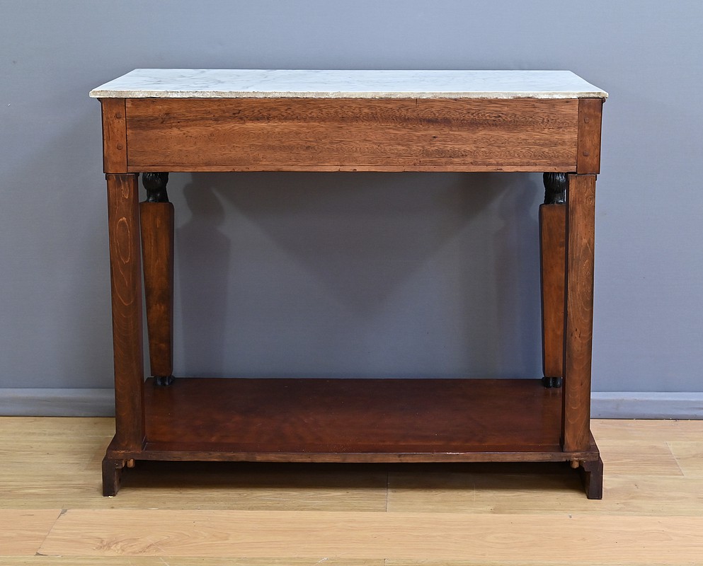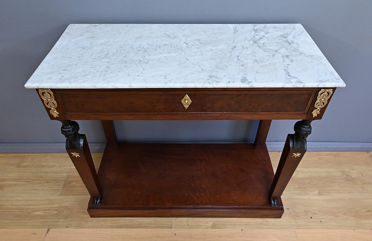 La console est couronnée d’un superbe plateau en marbre blanc de Carrare, dont la luminosité contraste magnifiquement avec la chaleur profonde de l’acajou.
