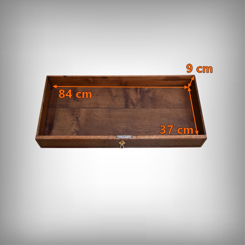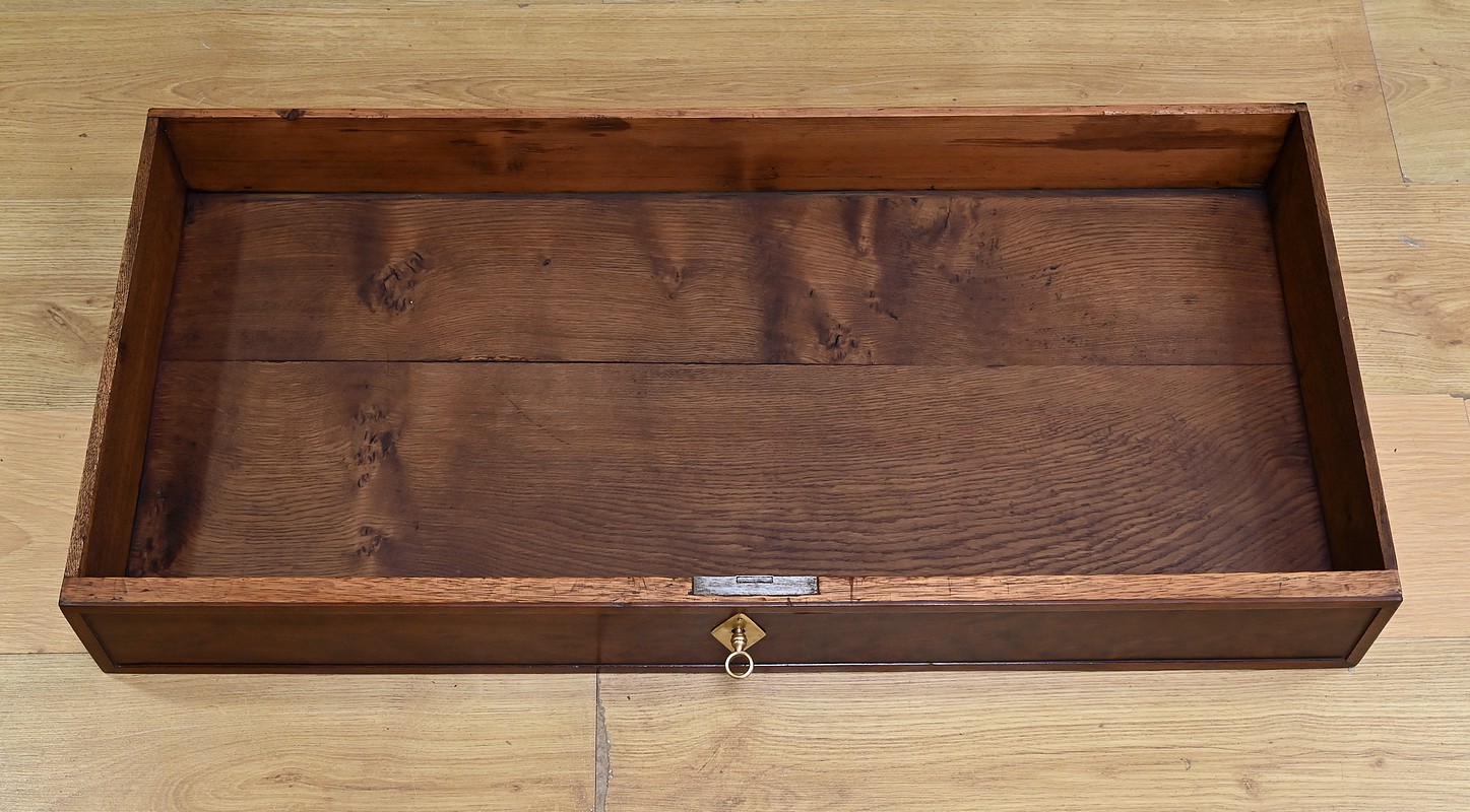 Le tiroir en ceinture est orné d’une entrée de serrure en forme de losange. Cette dernière est accompagnée d’une clé, avec une serrure parfaitement fonctionnelle. Aux angles supérieurs, des garnitures en bronze viennent enrichir l’ensemble de détails raffinés.