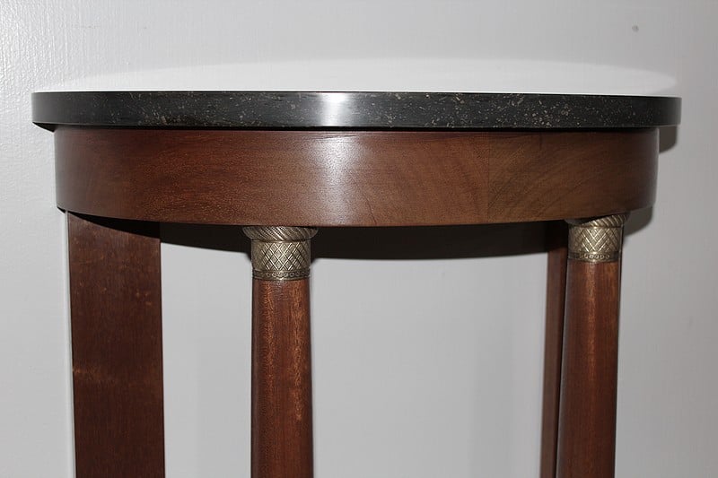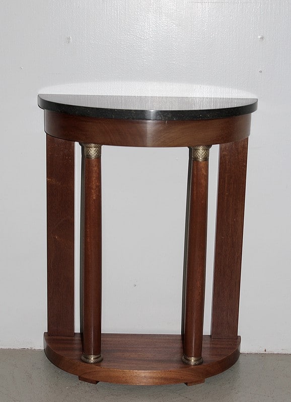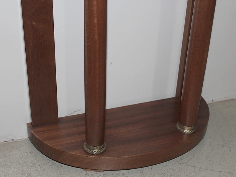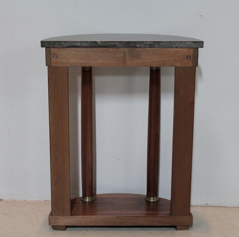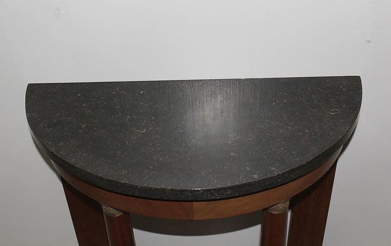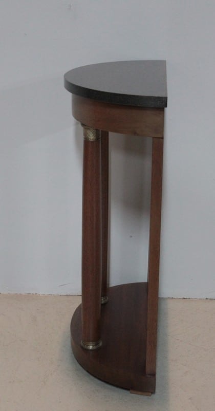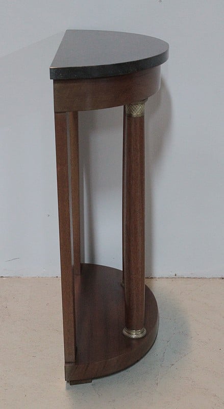 Petite console de style EMPIRE de forme demi-lune en acajou massif, dessus de marbre noir, reposant sur deux colonnes baguées et deux montants arrières plats.