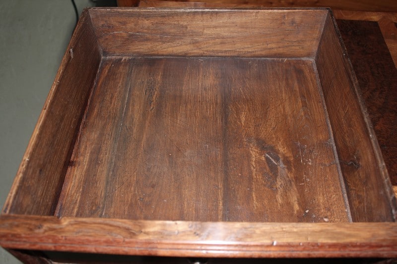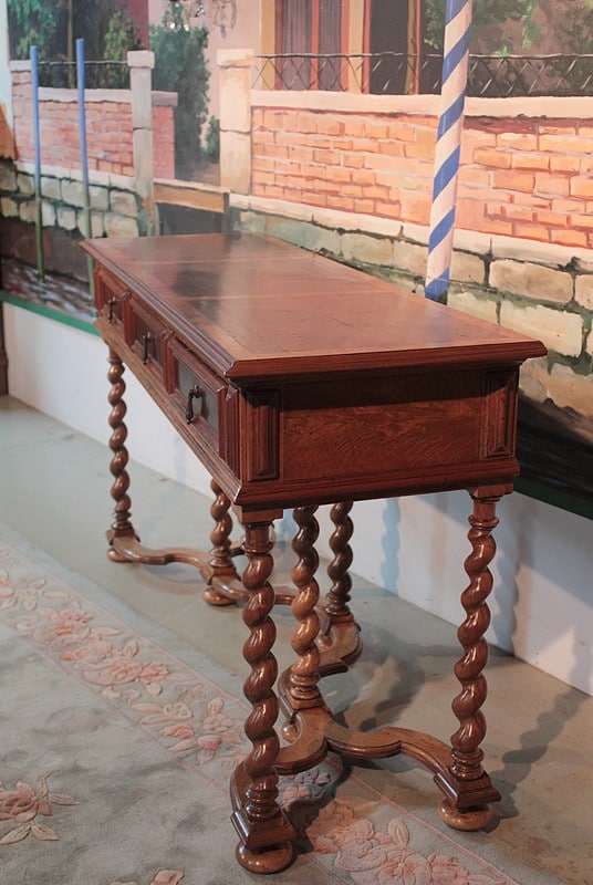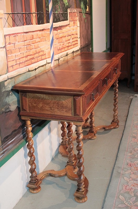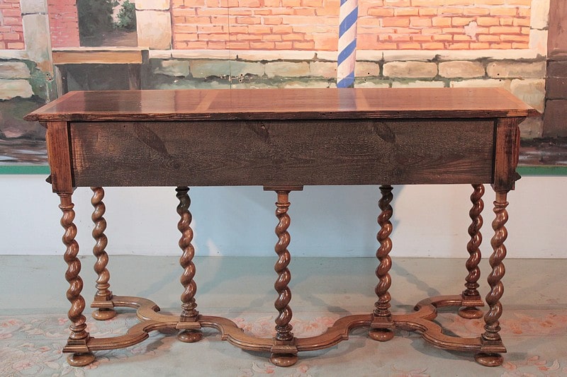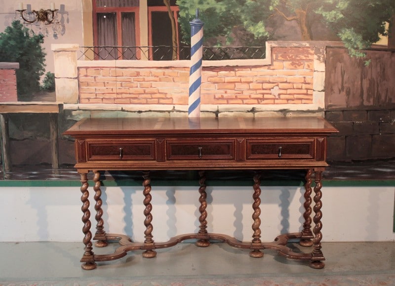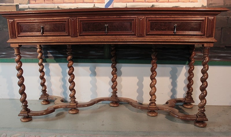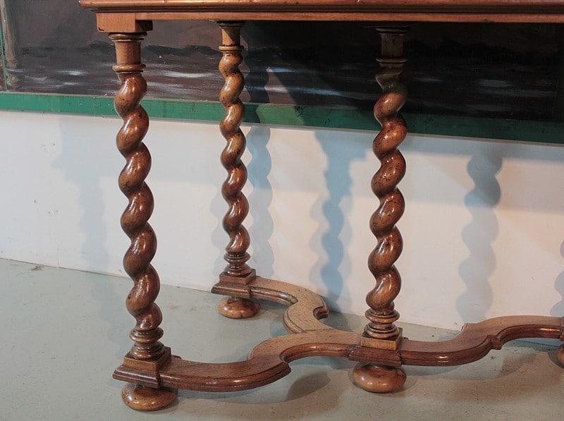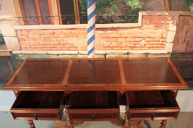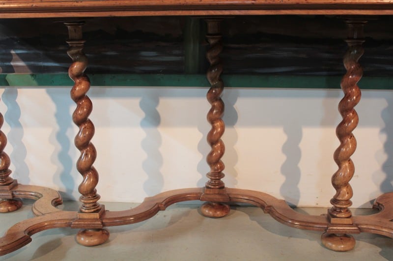 Crédence en noyer et ronce de noyer pour le dessus et la façade des tiroirs. Elle ouvre par 3 tiroirs dans la ceinture et repose sur 7 pieds torsadés reliés par une entretoise mouvementée. Angleterre.