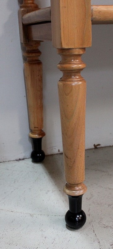 L’ensemble repose sur quatre pieds, dont la partie supérieure est tournée, façonnée ‘en Bobines’, tandis que celle du bas est plus Sobre. Ils sont reliés à mi hauteur par un plateau d’entretoise pouvant faire office de tablette de réception. Chacun de ces montants est terminé par un pied noirci, en Boule, rappelant l’époque Napoléon III et donnant une subtile particularité à ce meuble relativement atypique.