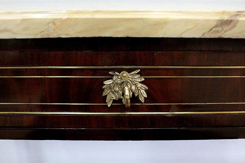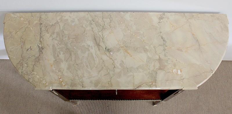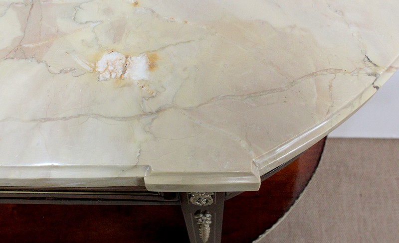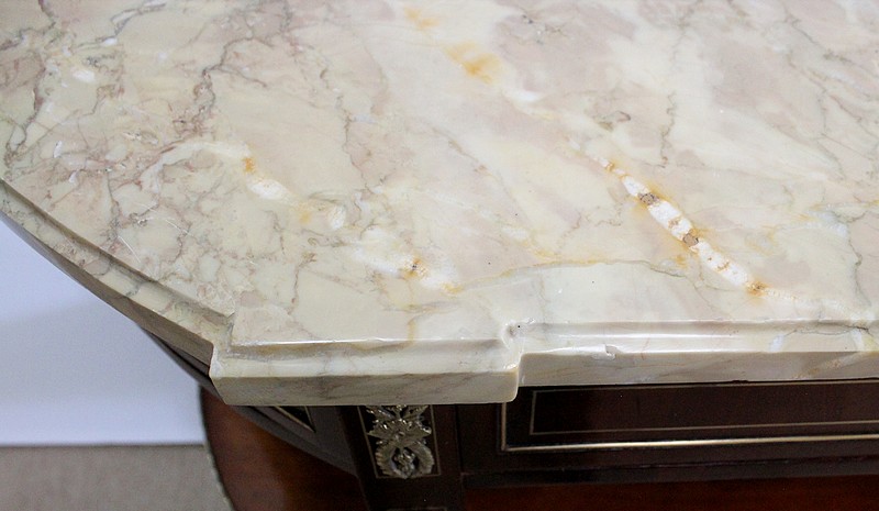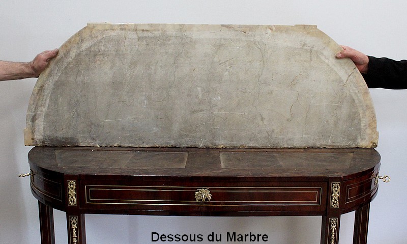 Ce Marbre d’Origine présente en son pourtour une Gorge et une Forme avec Ressauts qui épouse les lignes de ce Meuble chargé d’Histoire.