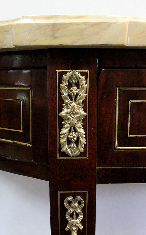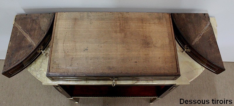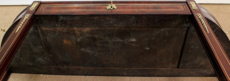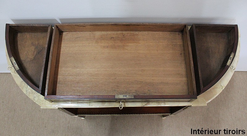 La Ceinture ouvre par un grand Tiroir en façade et deux plus petits aux formes arrondies sur les côtés. Ils bénéficient d’un placage de Ronce d’Acajou avec Incrustations de Filets de Laiton, et sont chacun muni d’Entrées et de Serrures d’Origine en état de fonctionnement, accompagnées de leurs Clés rapportées.