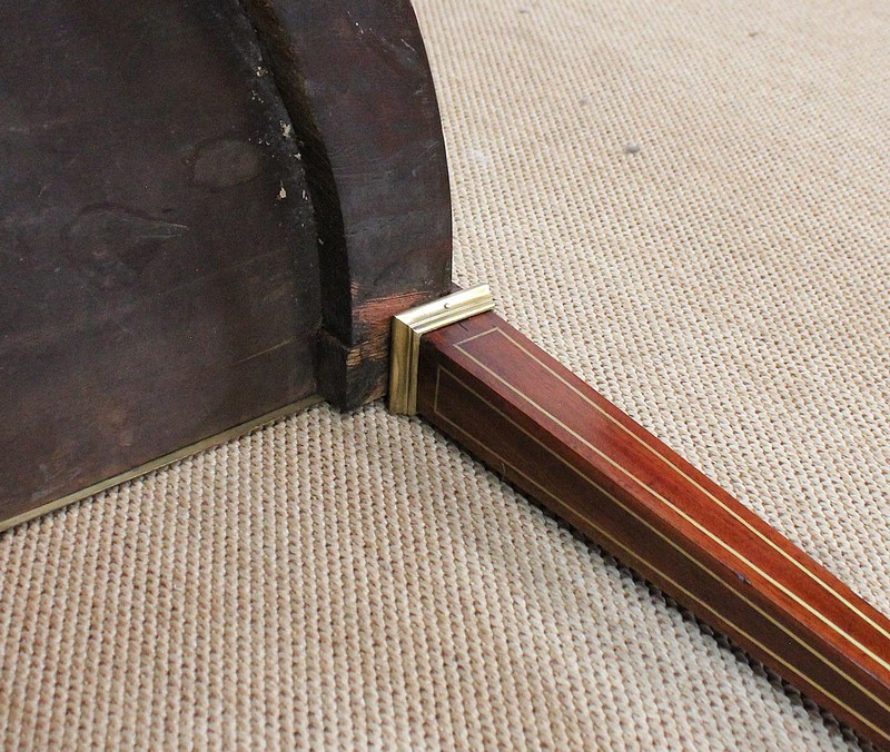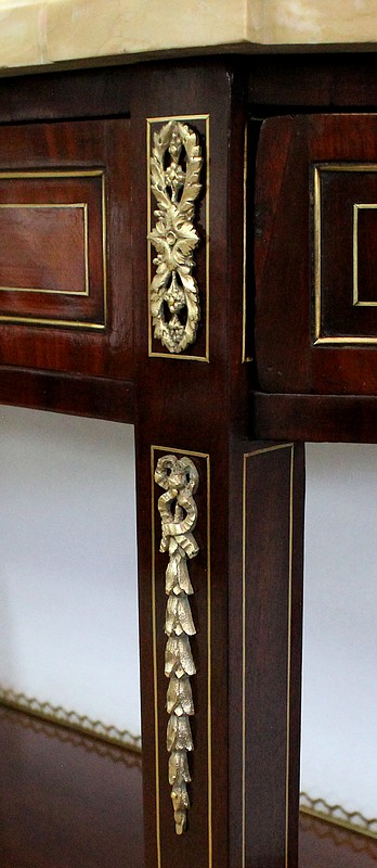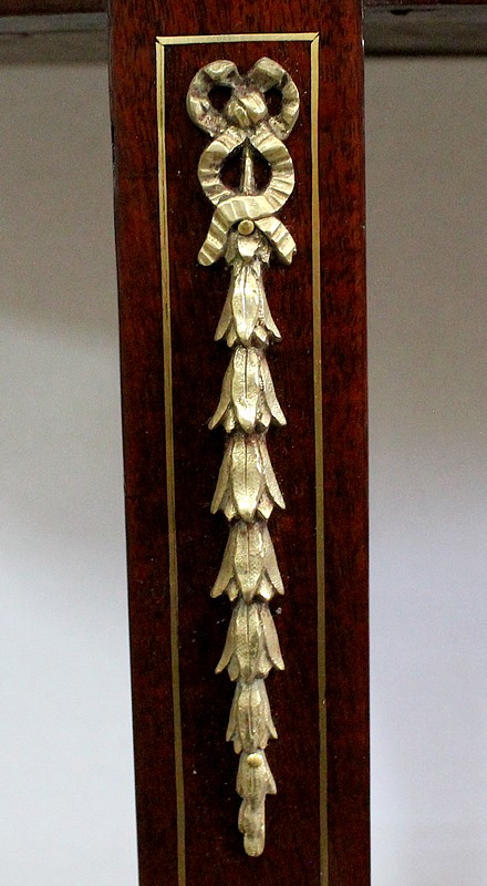 En partie inférieure, les Pieds sont entourés d’une Bague en Bronze, puis se profilent en Gaine sur les quatre faces ornées d’incrustation de Filet, et se terminent par des Sabots en Laiton.