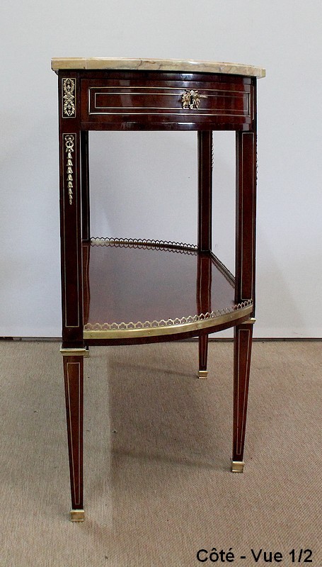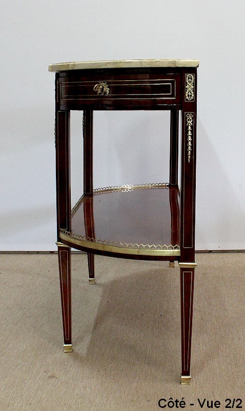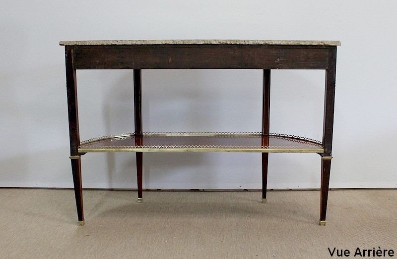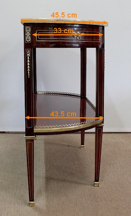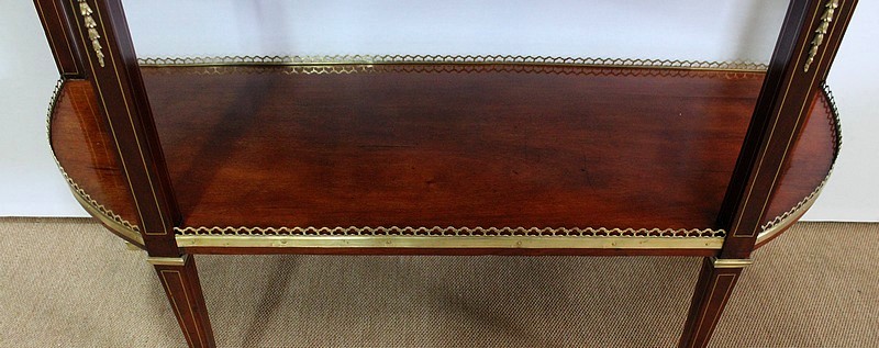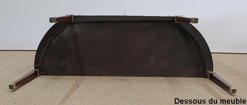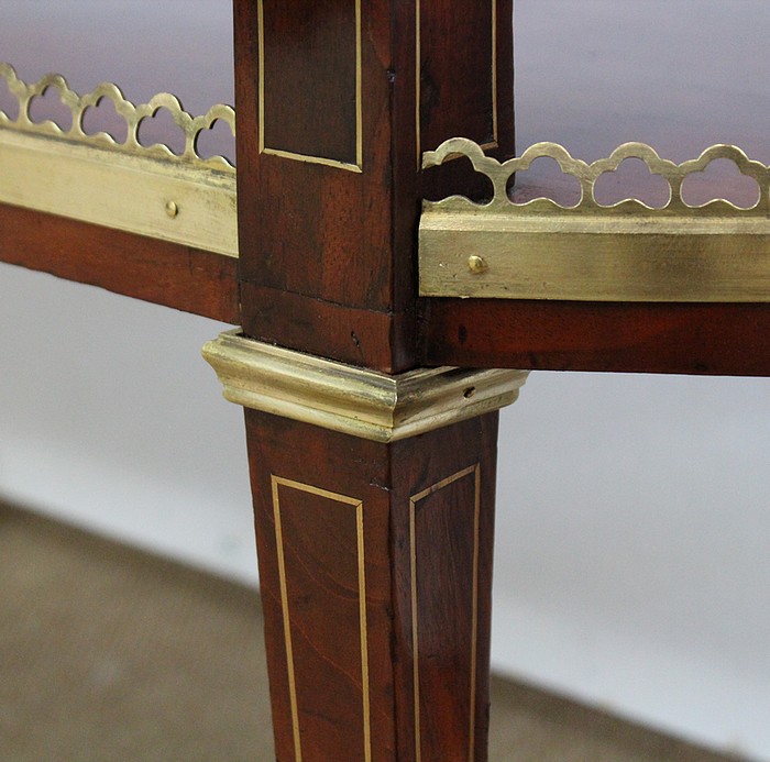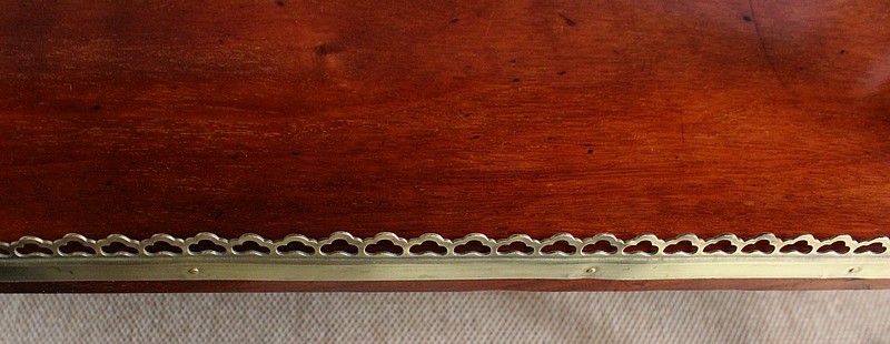 Ce Mobilier bénéficie d’une Tablette en Acajou agrémentée dans son pourtour d’une Galerie Laiton finement travaillée dans sa partie supérieure.
