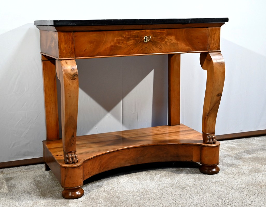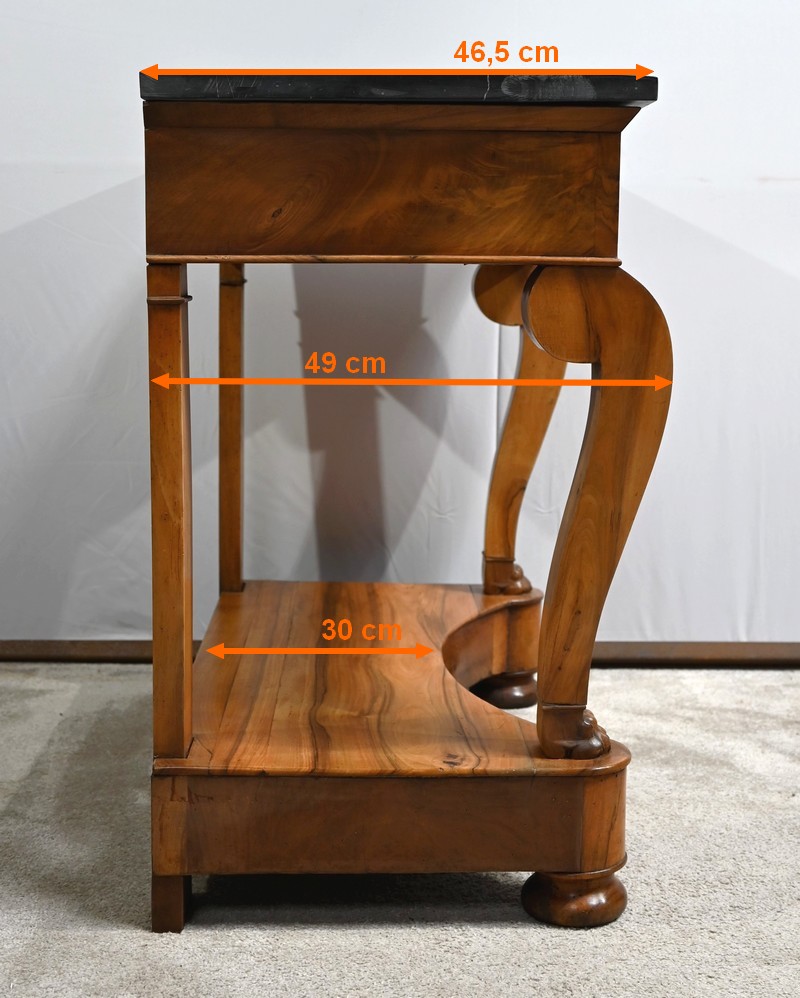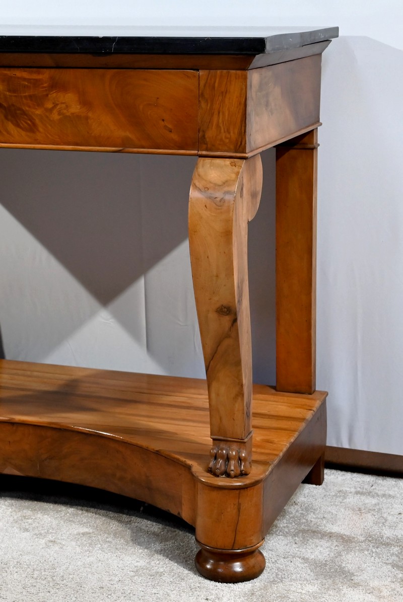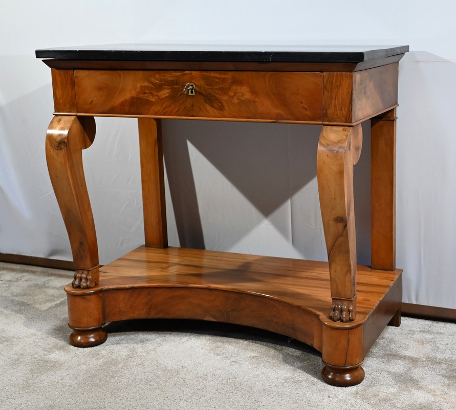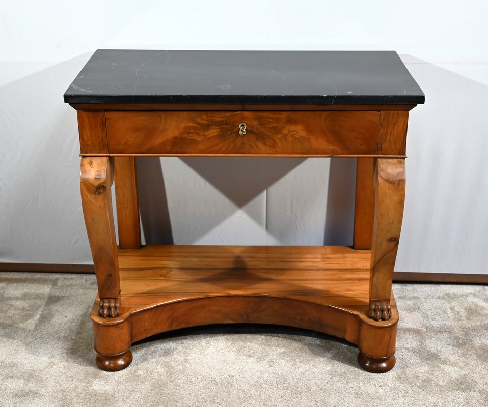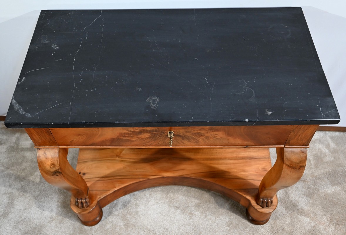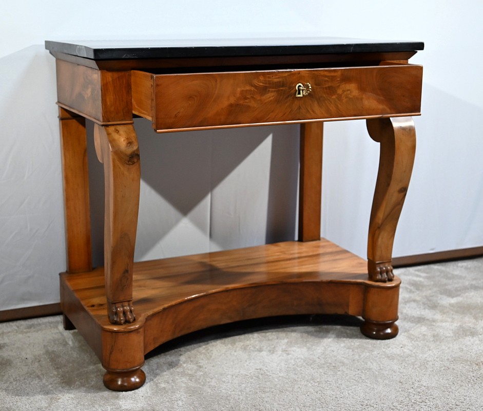 Petite console en noyer blond sommée d’un marbre noir français.