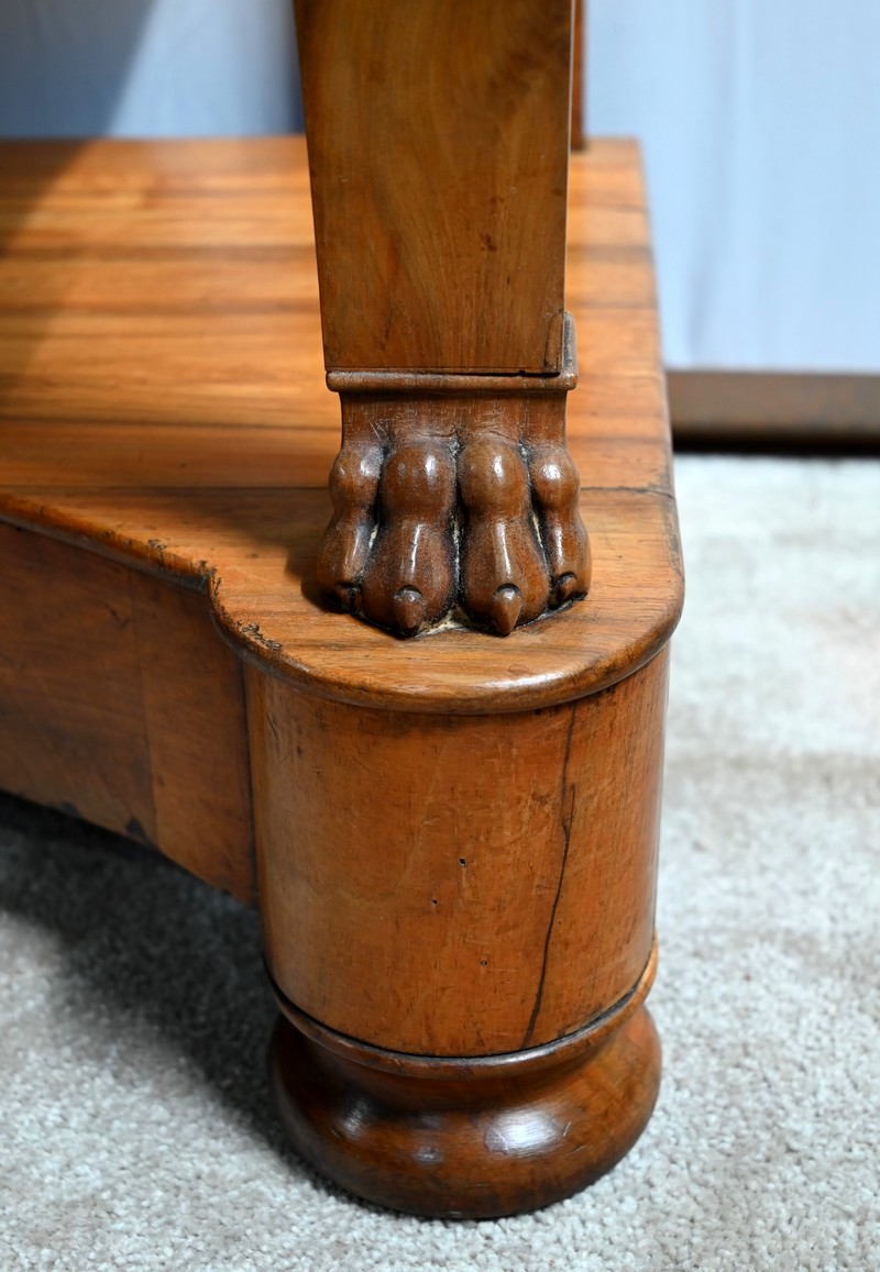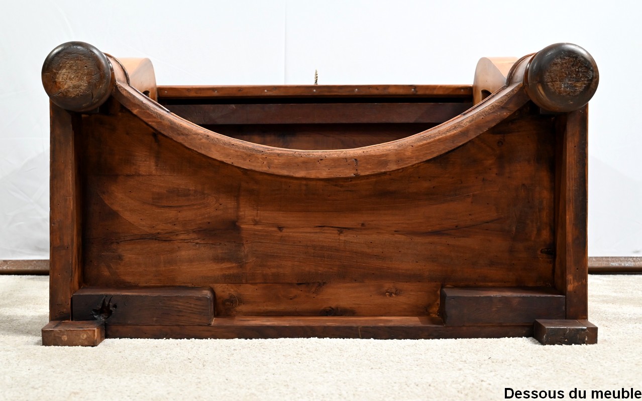 Cette partie est soutenue en façade par deux pieds galbés en partie haute à crosse intérieure s’affinant légèrement vers le bas et se terminant par des pieds griffe à l’avant. Les montants arrières sont droits. L’ensemble repose sur une base d’entretoise au dessus en noyer massif à débordement, concave en façade et à demi-rond aux angles. Cette base se termine par deux pieds « galette » tournés de l’époque sur le devant.