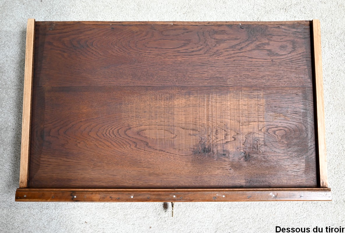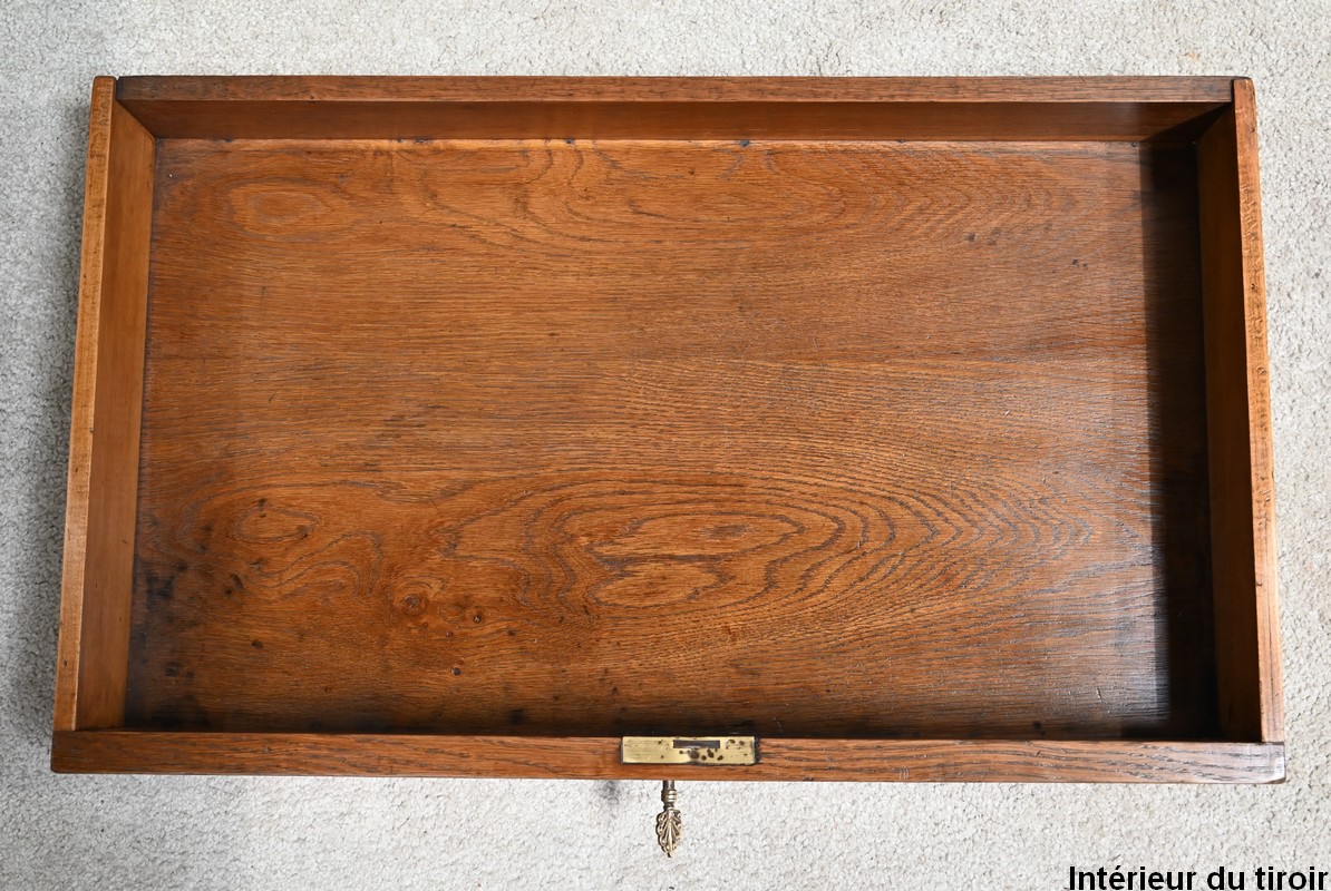 Elle ouvre en ceinture par un tiroir équipé d’une serrure fonctionnelle d’origine avec clé ajustée et entrée filet laiton.