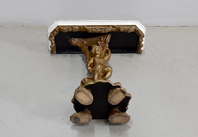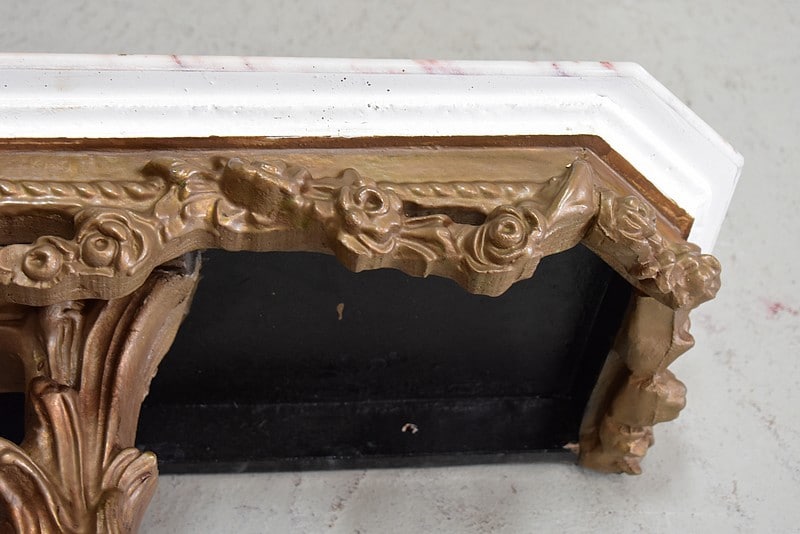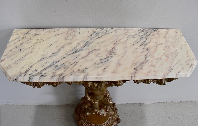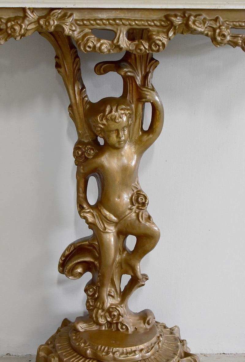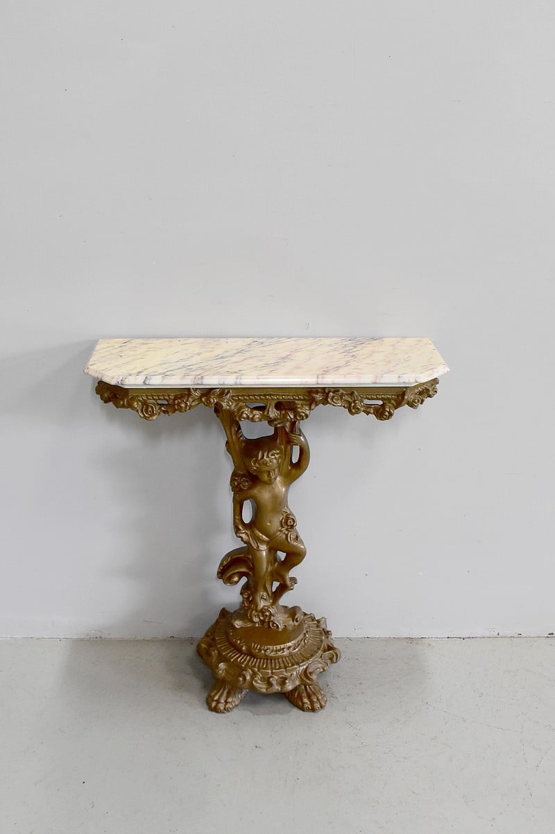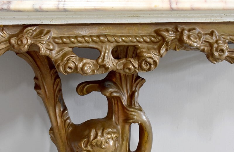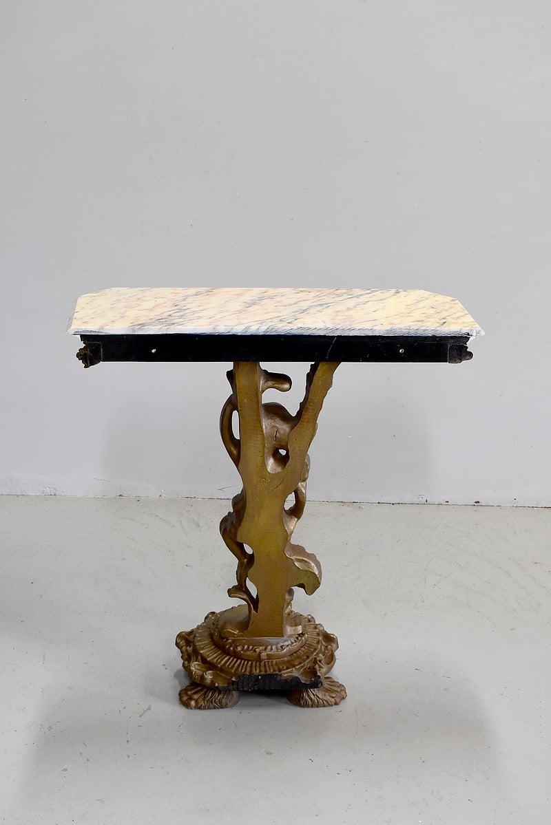 Petite console en bois sculpté et patiné vieux bronze avec son dessus en marbre couleur crème veiné de gris et rose.