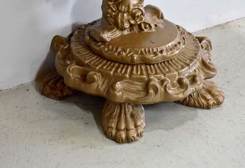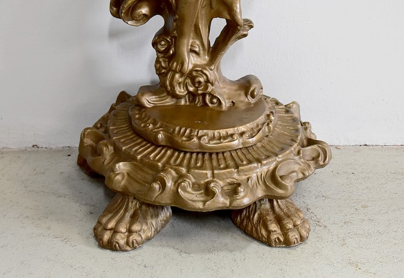 Le pied est sculpté d’un enfant à demi-nu entouré de fleurs reposant sur 2 socles circulaires sculptés et moulurés.