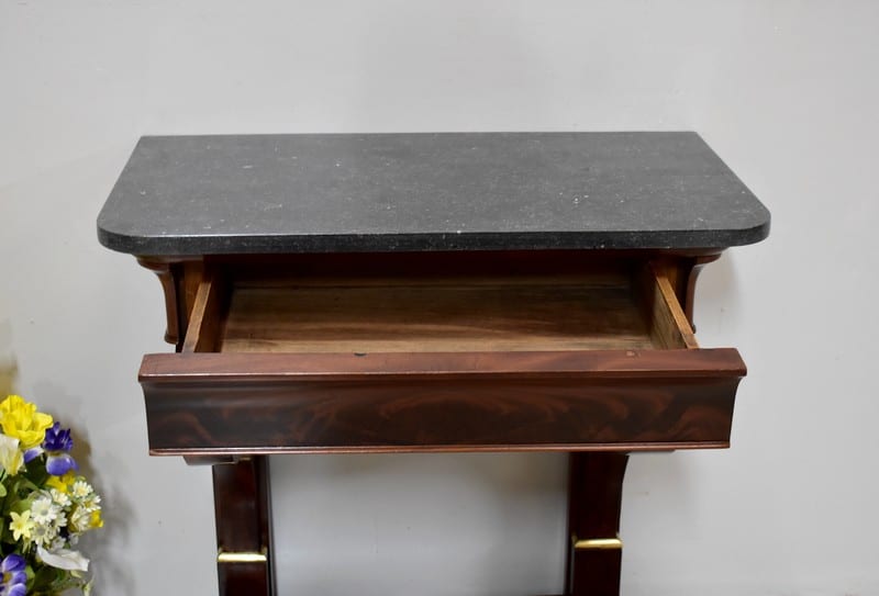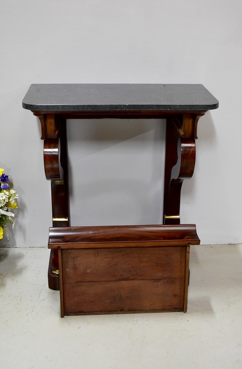 Rare petite console Restauration en placage de Ronce d’Acajou de Cuba avec son dessus en marbre Granit Belge Anthracite de 20 mm d’épaisseur.