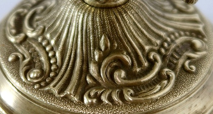 Cette coupe repose sur un piédouche circulaire, ouvragé, mouluré à sa base, et pourvu de quatre petits pieds découpés en motifs feuillagés.