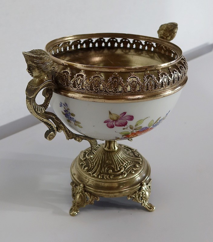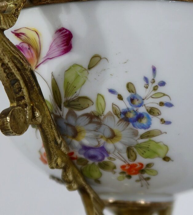 Petite coupe, dont la panse en porcelaine est enjolivée de fins décors de fleurs polychromes sur fond crème.