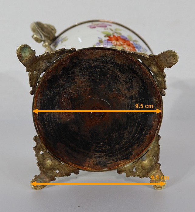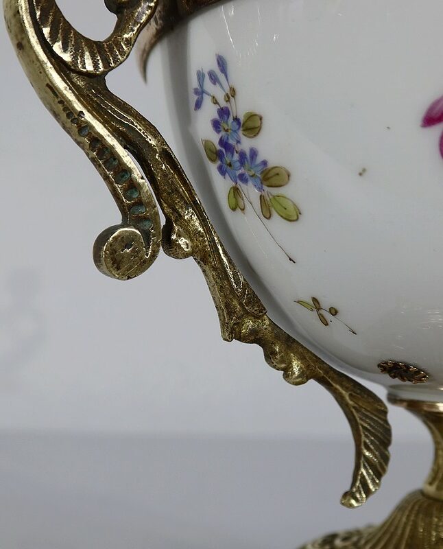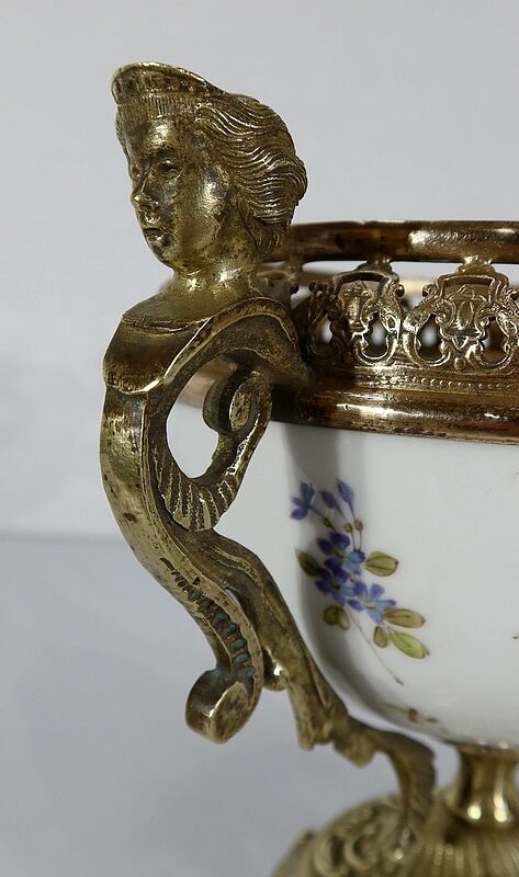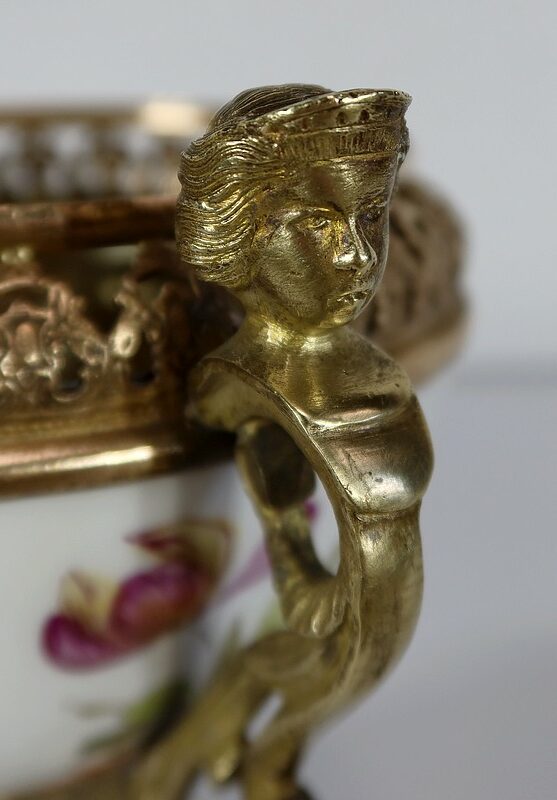 Elle est montée sur bronze, avec en partie haute une large galerie ajourée. De là partent deux anses formant des bustes de femmes terminés en enroulements.