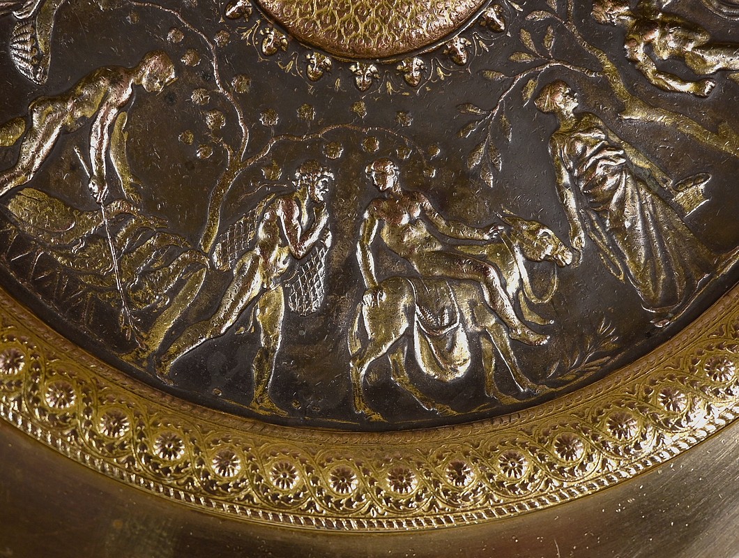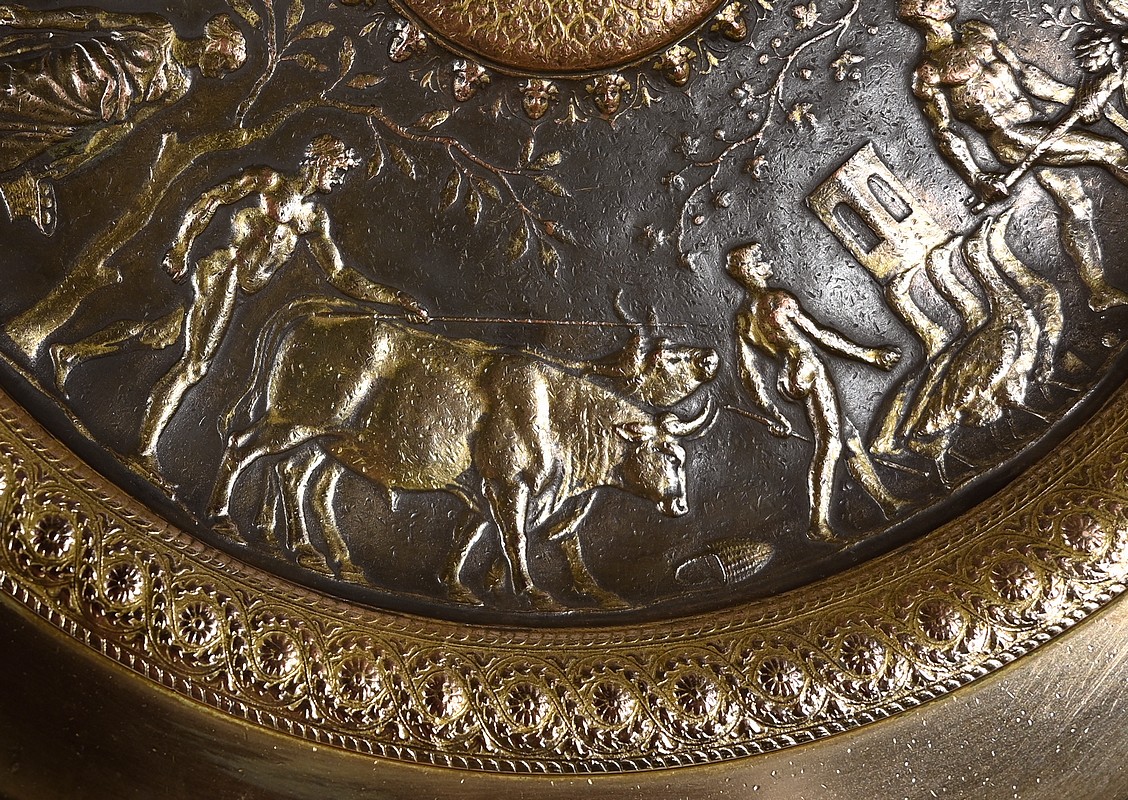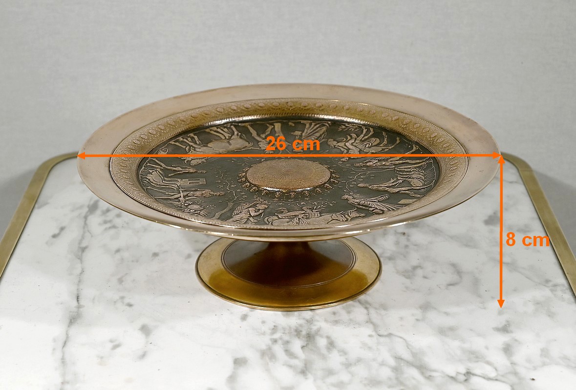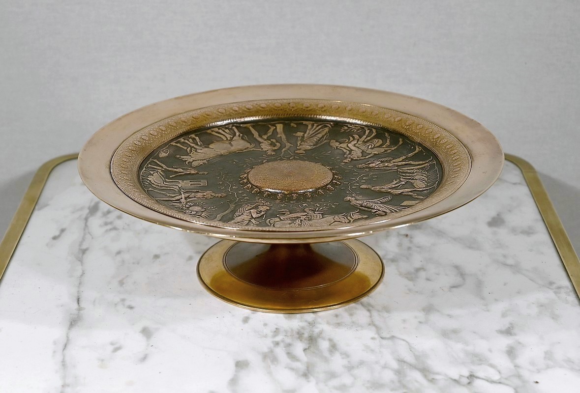 Coupe sur pied Tazza en bronze doré et patiné à décor néo-classique en bas relief à l’antique.