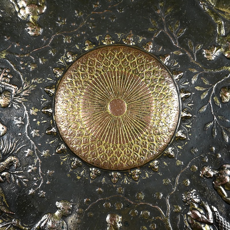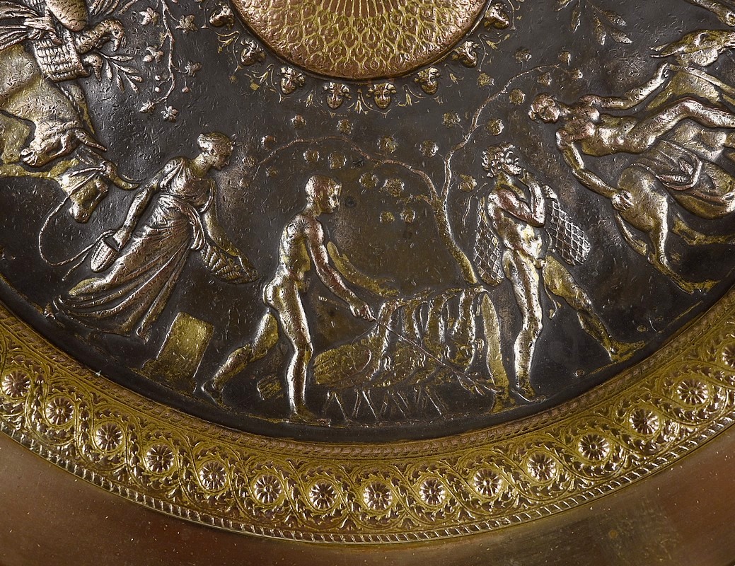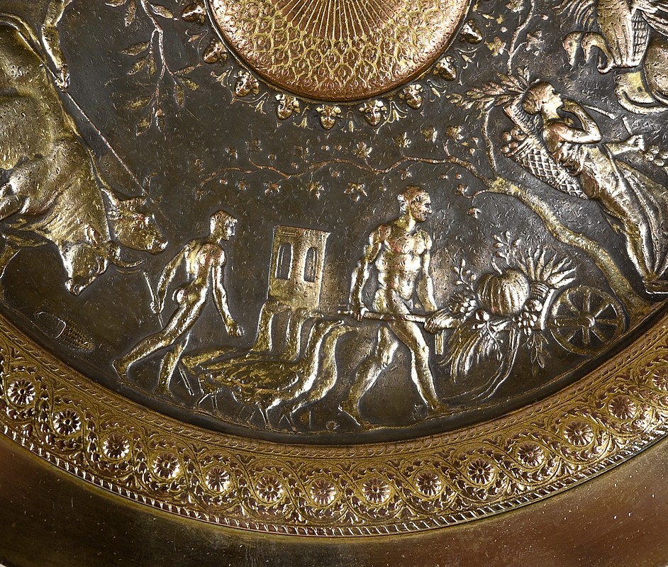 Cette œuvre de Ferdinand Levillain (1837-1905) figure une procession de personnages gréco-romains menant des animaux de la ferme et des victuailles. De fins et longs branchages formant des guirlandes, courent aux dessus de leurs têtes. Au centre, un soleil stylisé rayonne, entouré de masques décoratifs. L’ensemble est encerclé d’une frise alliant arabesques, fleurs et feuilles.