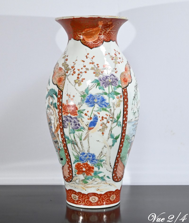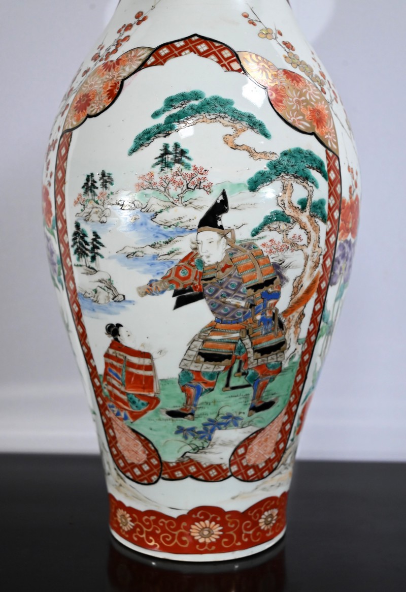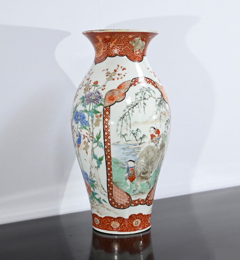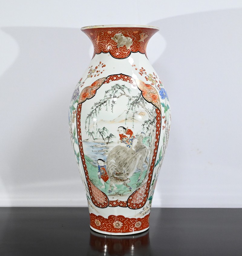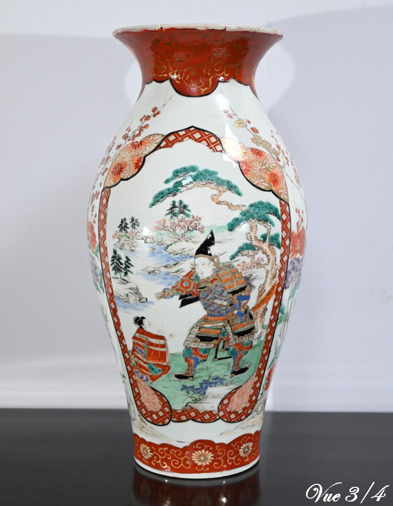 Ce vase, à col évasé, à décors de branchages accompagnés d’oiseaux colorés sur fond de paysages stylisés est illustré de frises de couleur rouge souligné d’or. Deux scènes en cartouches y figurent également. Sur une face, un samouraï représenté en disproportion, tant ses hommes sont importants pour la culture japonaise, tend un message à une femme agenouillée. Sur l’autre face une vache est guidée par deux enfants.