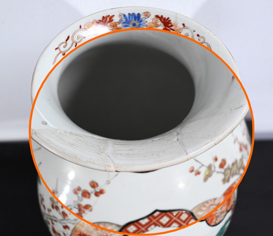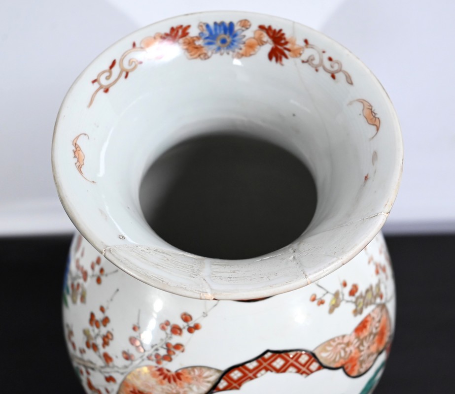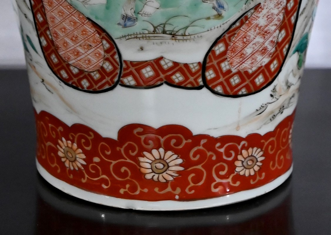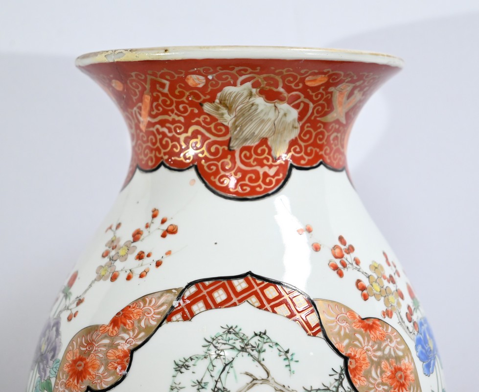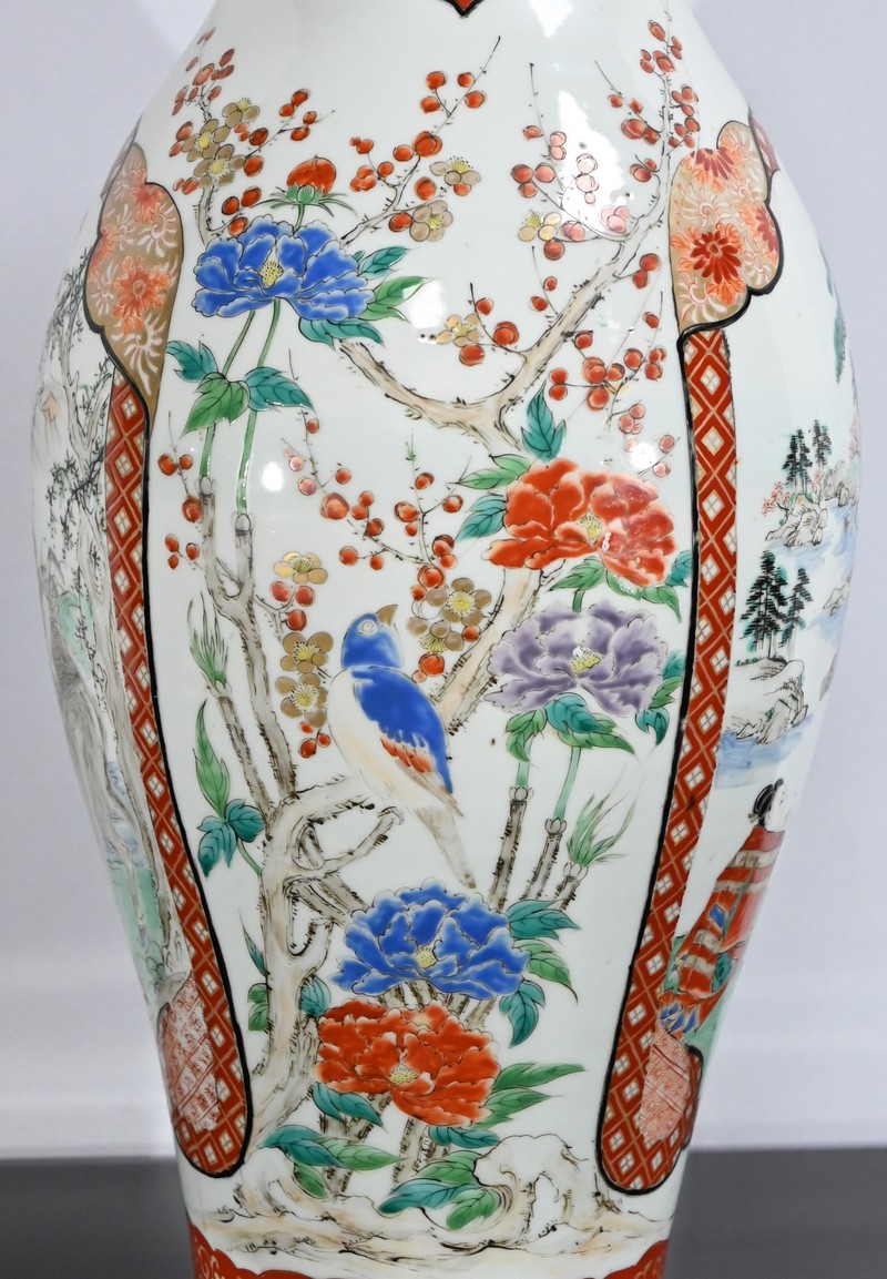 Ce vase, à col évasé, à décors de branchages accompagnés d’oiseaux colorés sur fond de paysages stylisés est illustré de frises de couleur rouge souligné d’or. Deux scènes en cartouches y figurent également. Sur une face, un samouraï représenté en disproportion, tant ses hommes sont importants pour la culture japonaise, tend un message à une femme agenouillée. Sur l’autre face une vache est guidée par deux enfants.