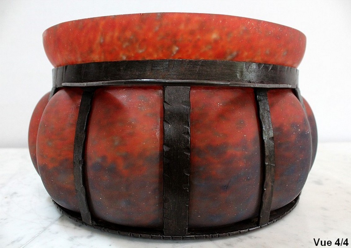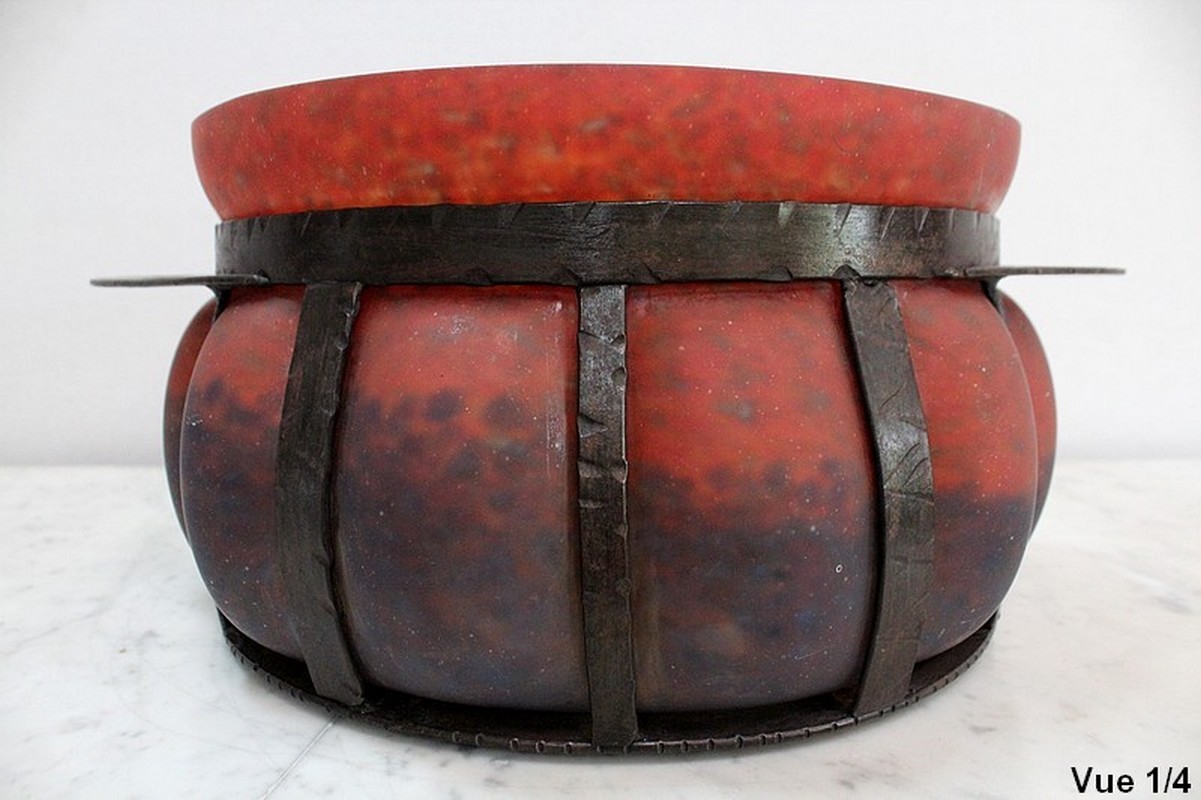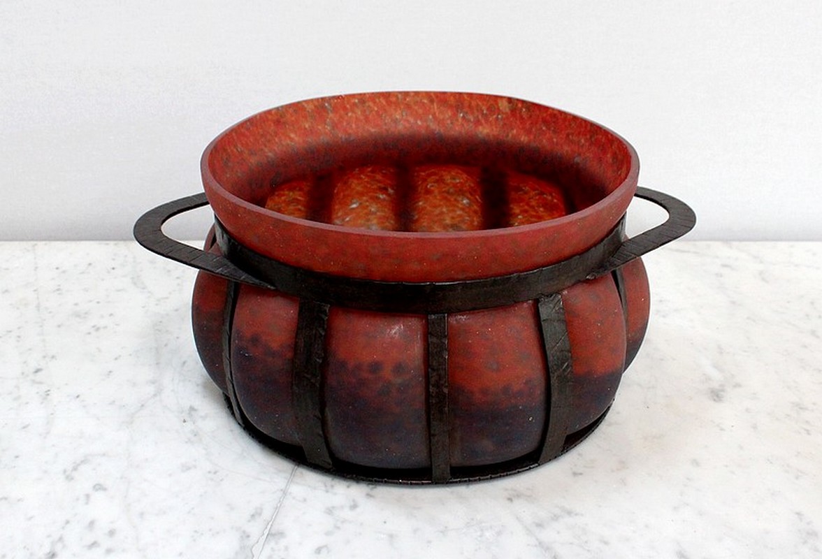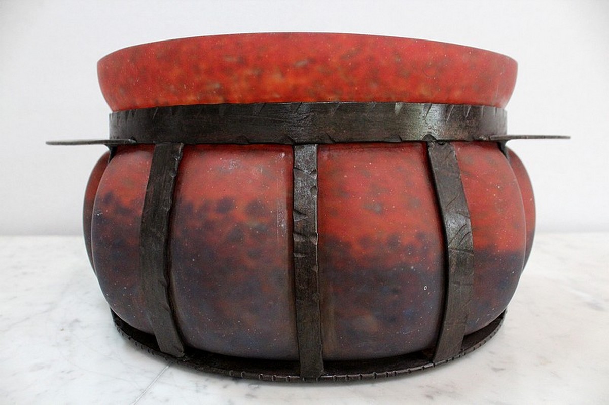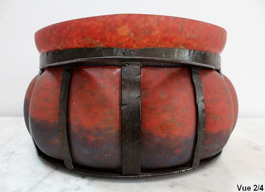 Coupe en Verre Marmoréen soufflée dans une Monture en Fer Forgé, signée Daum et Majorelle.