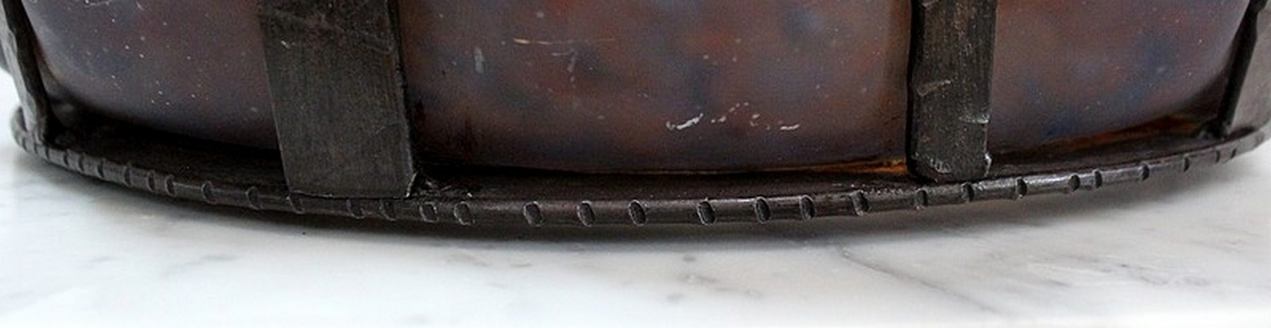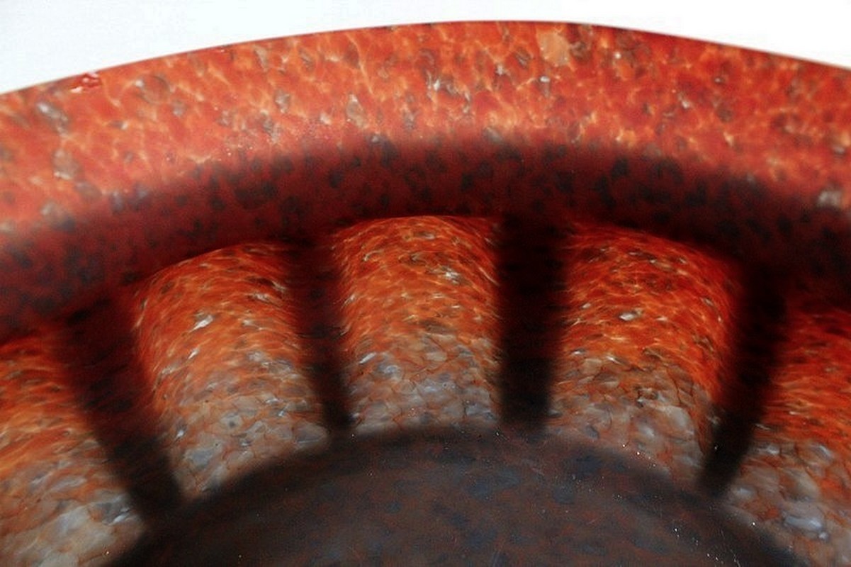 Cette Épreuve Circulaire Godronnée, réalisée par Vitrification intercalaire de poudres d’oxydes, bénéficie d’une riche Palette Chromatique : Orange, Jaune, Blanc et Bleu s’entremêlent et se superposent.
