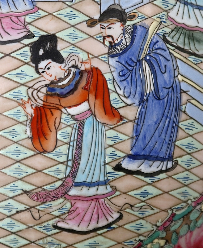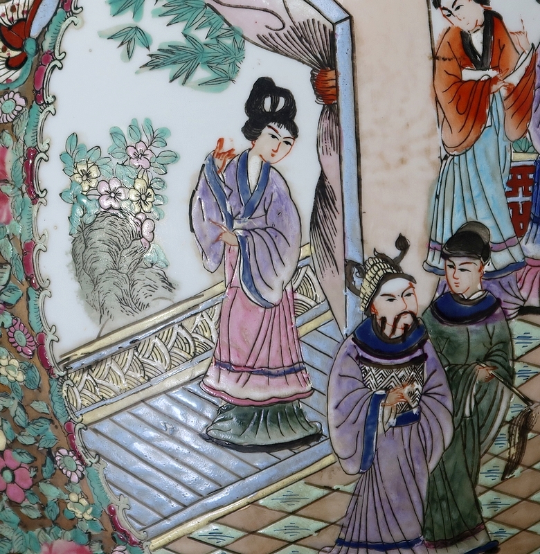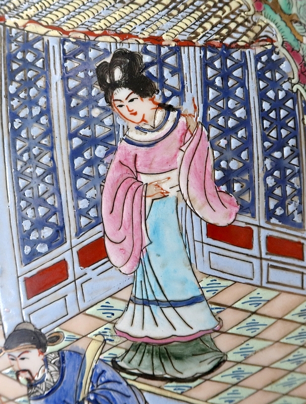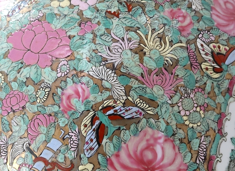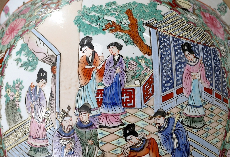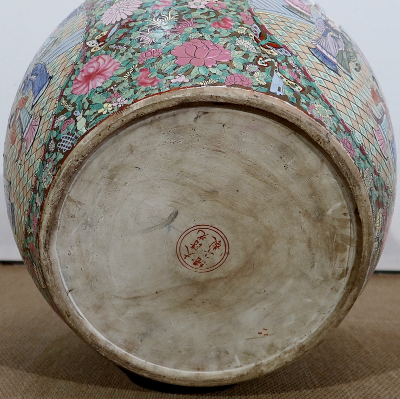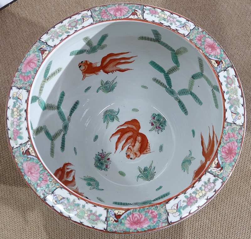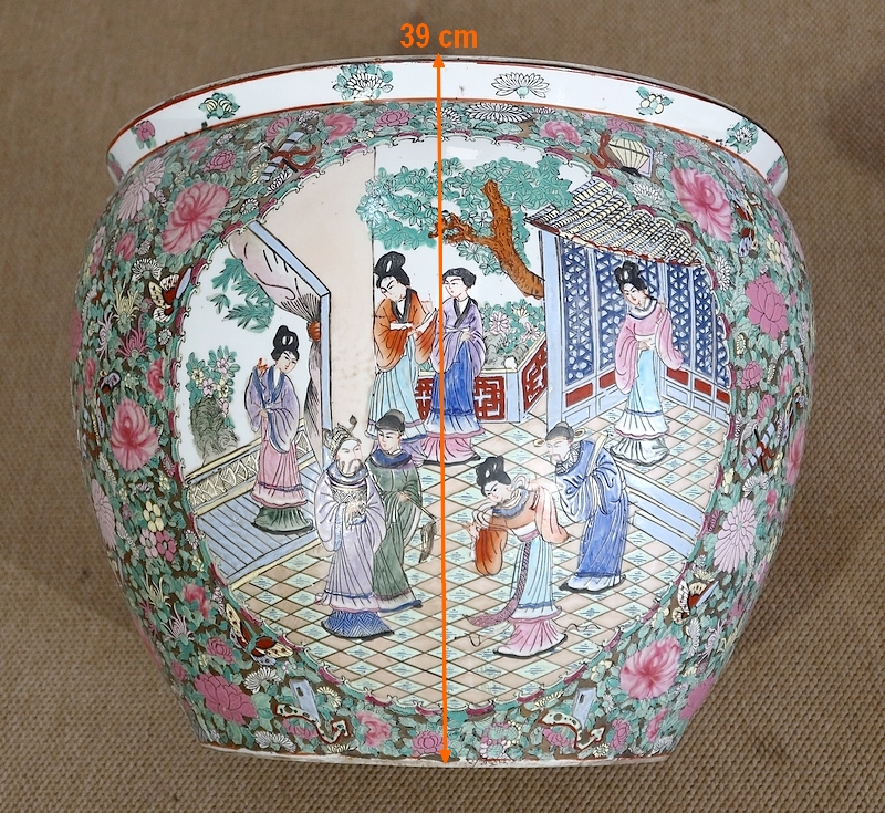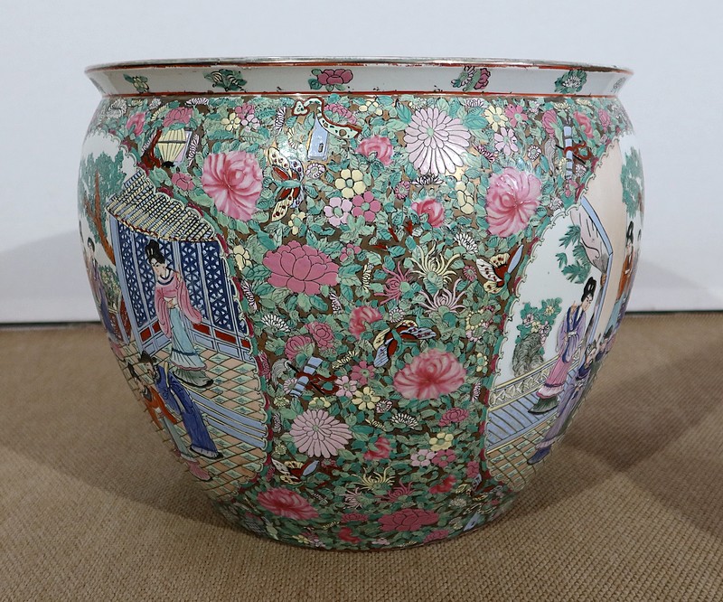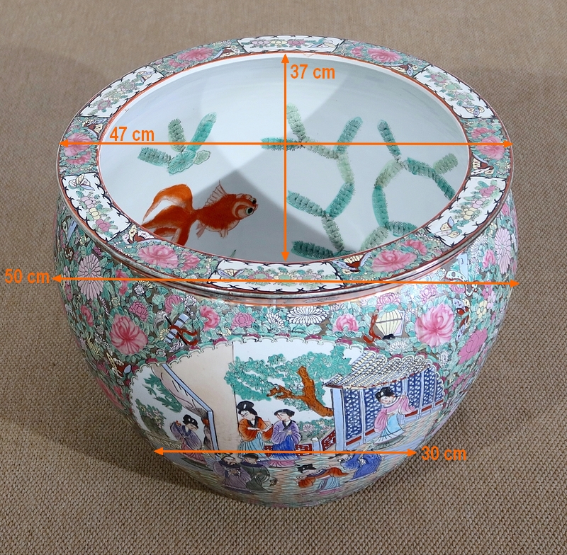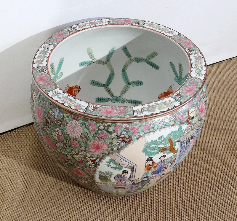 Grand aquarium en porcelaine de Canton polychrome émaillée à décor de fleurs sur fond or et orné de scènes traditionnelles dans des cartouches polylobés.