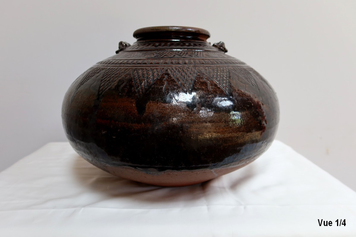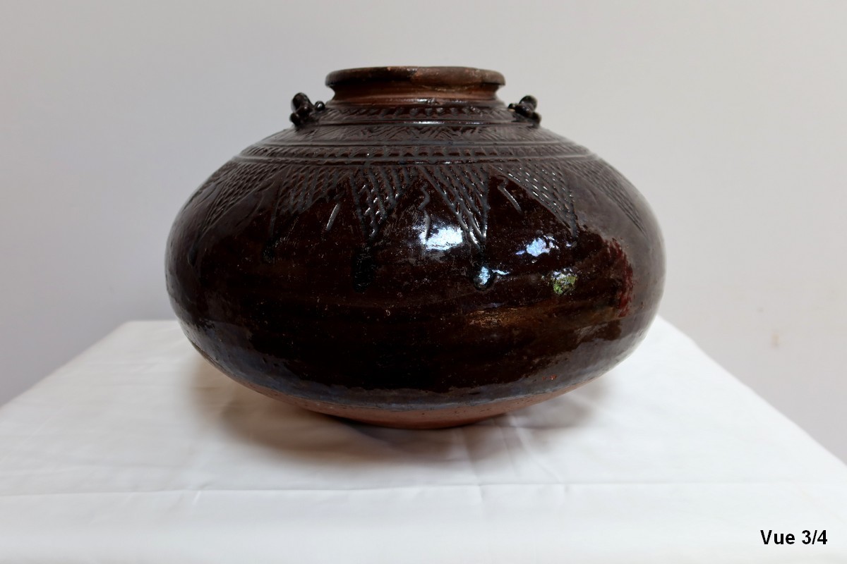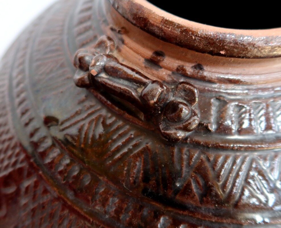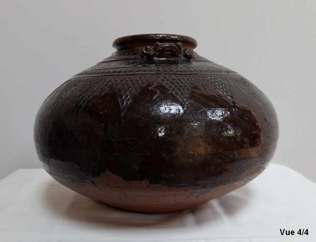 Ce vase très pansu, en terre cuite vernissée dans les tons marron vert, est décoré de motifs géométriques.