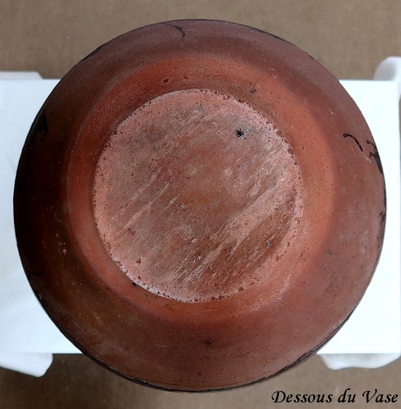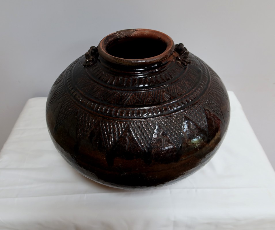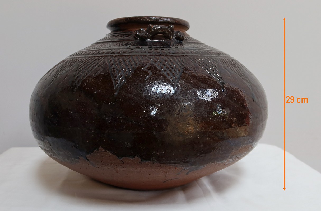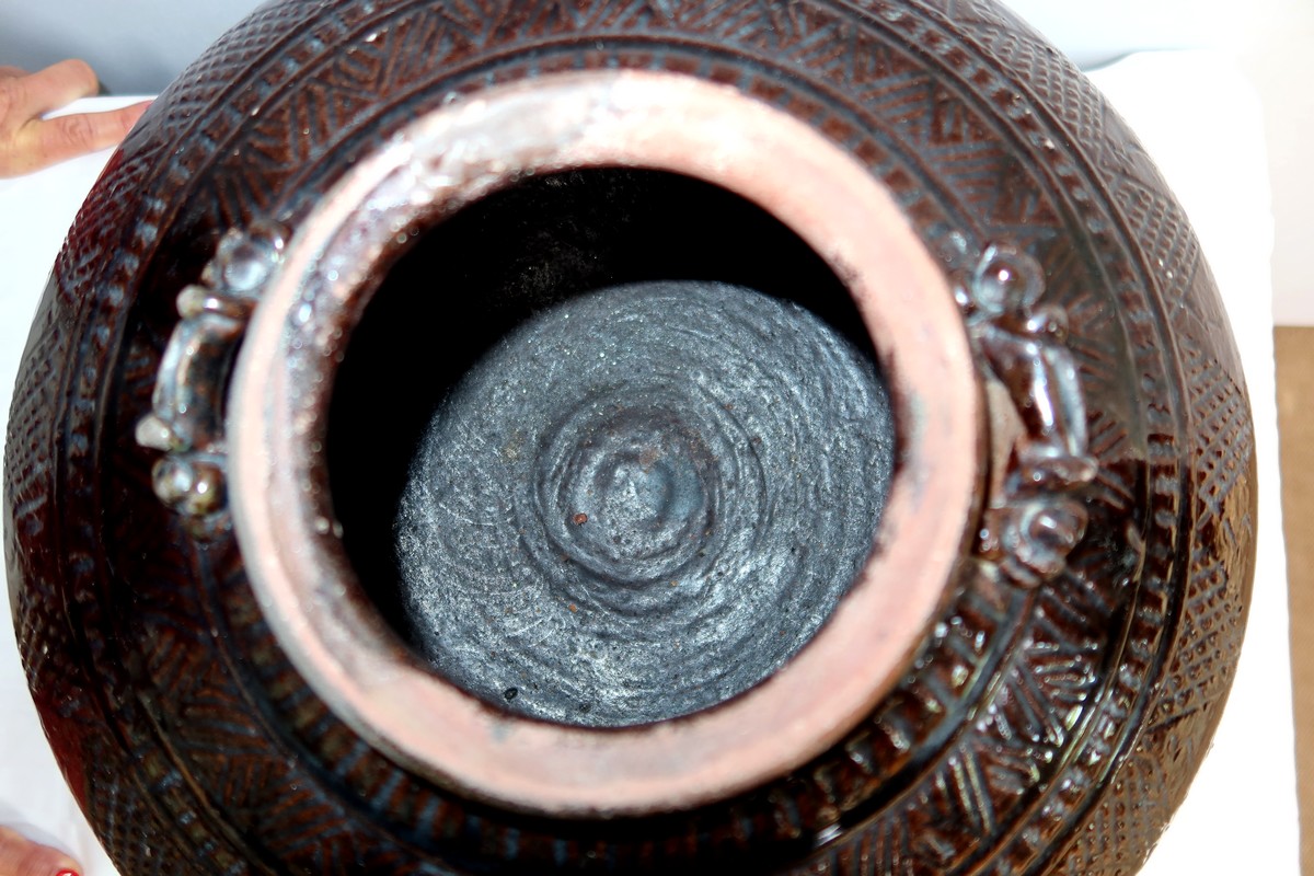 Ce vase très pansu, en terre cuite vernissée dans les tons marron vert, est décoré de motifs géométriques.