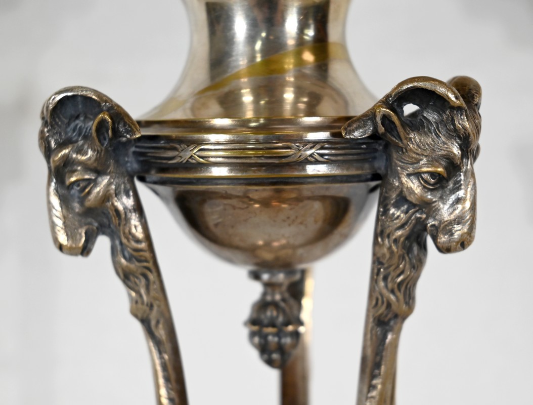Coupe en Verre à dégradé reposant sur un ensemble en laiton, composé de 3 supports. Ceux-ci représentent une tête de bélier en partie haute, et se terminent en partie basse par un sabot. Ils sont fixés sur une base en laiton festonné, avec en son centre un macaron en bronze, identique à celui à l’intérieur de la coupe.
