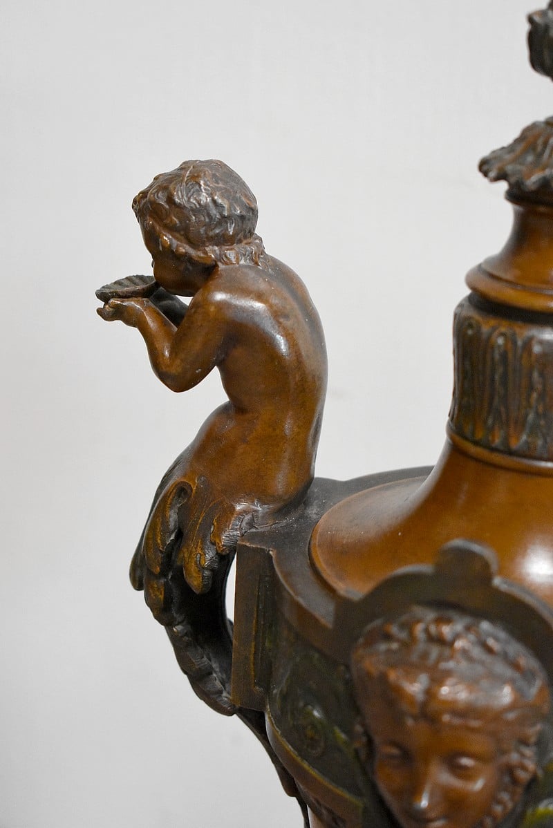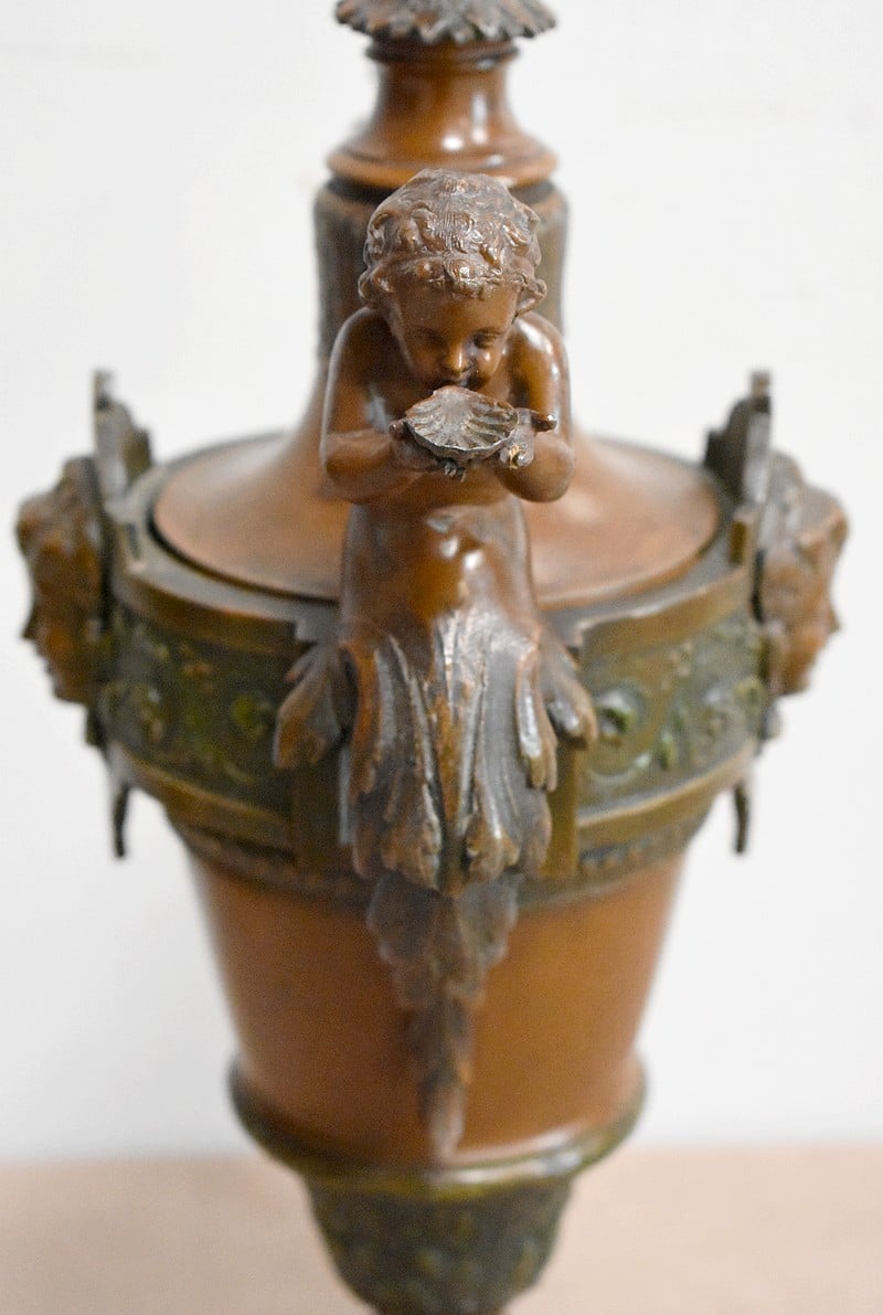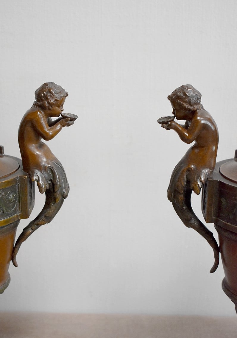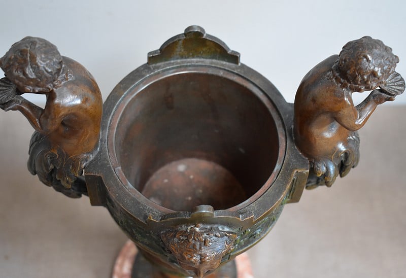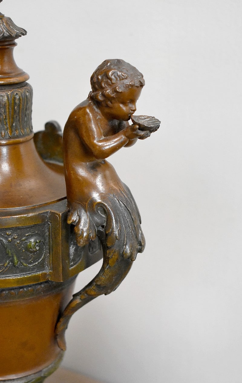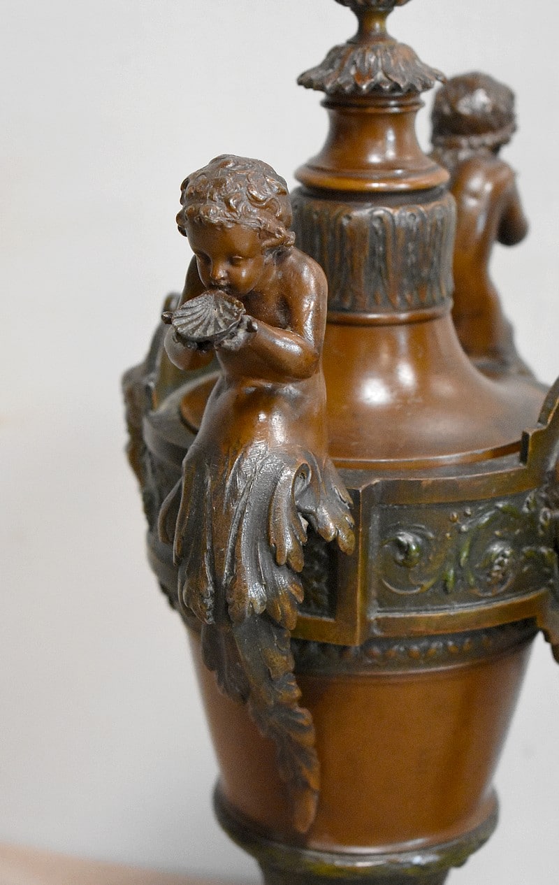 Les anses sont à décors d’enfants-tritons tenant en coupe dans leurs mains un coquillage porté à leurs lèvres.