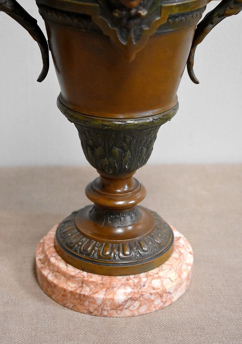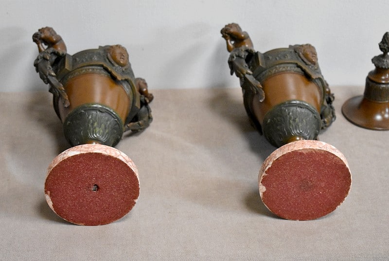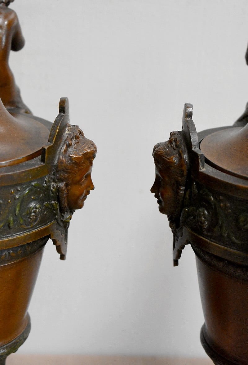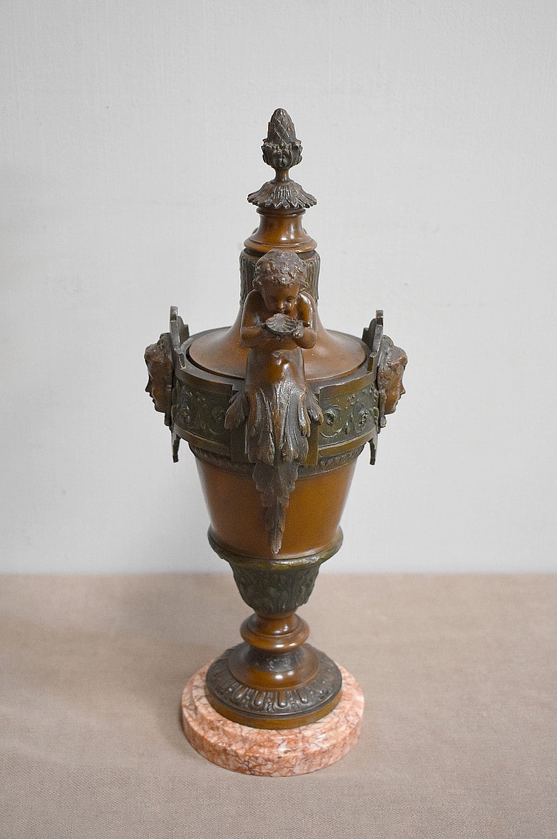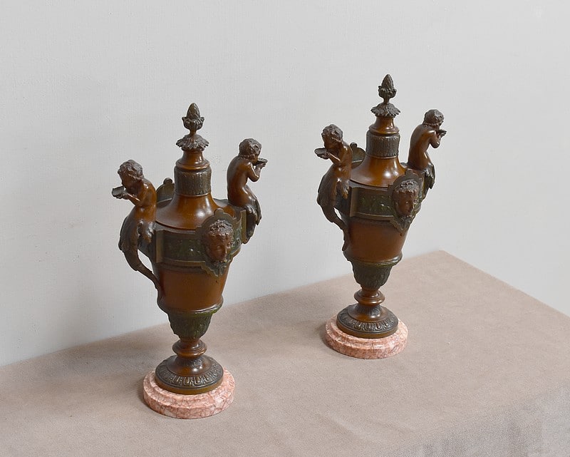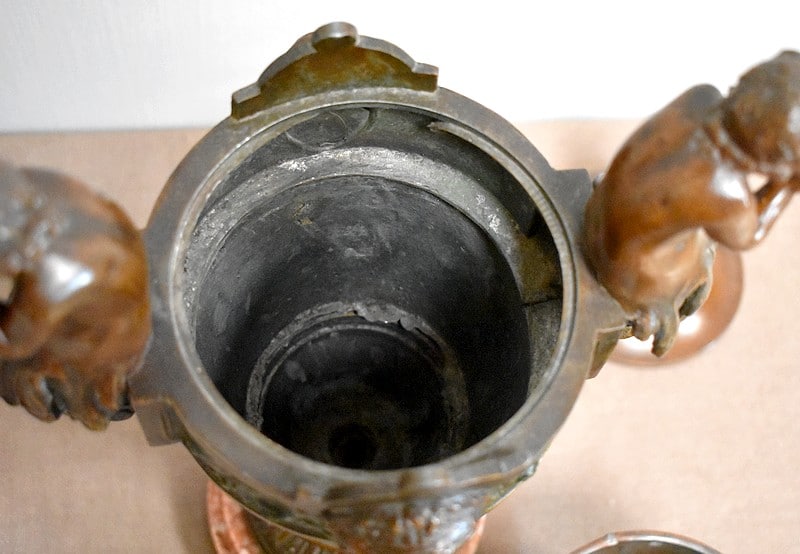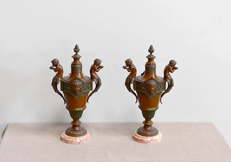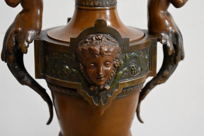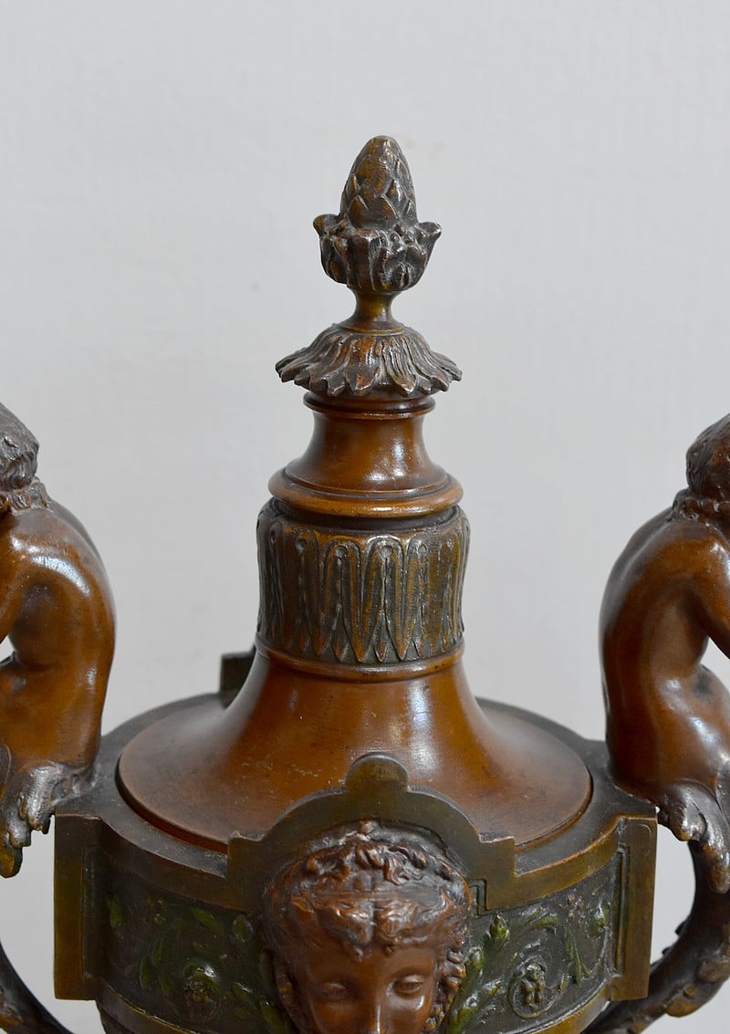Les anses sont à décors d’enfants-tritons tenant en coupe dans leurs mains un coquillage porté à leurs lèvres.