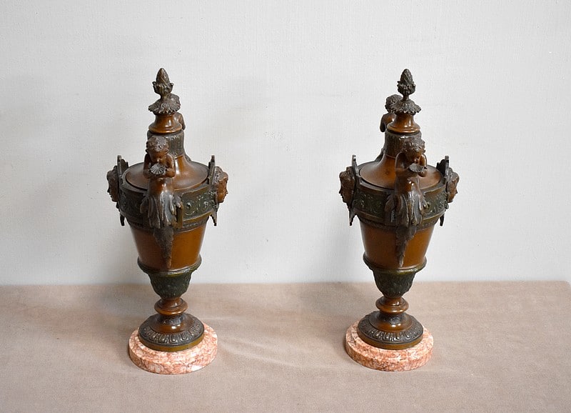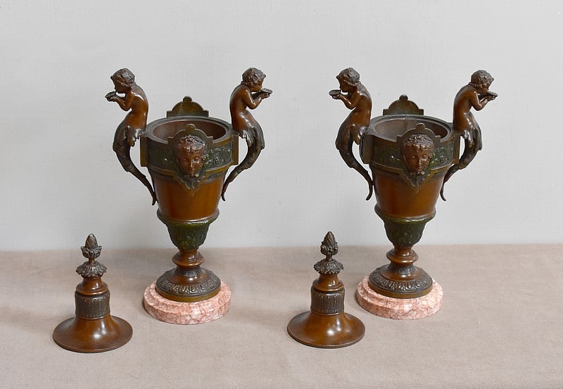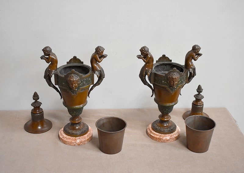 Les couvercles ornés d’une pomme de pin surélevée se retirent pour accéder à un récipient en zinc amovible.
