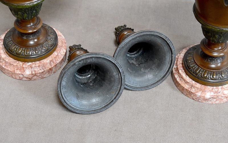 Le pied mouluré et à décors floraux repose sur un socle rond en marbre Rose vif des Pyrénées mouluré en gorge , le dessous est recouvert d’une feutrine rouge en l’état.