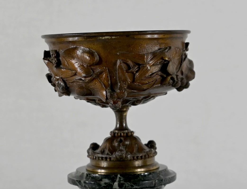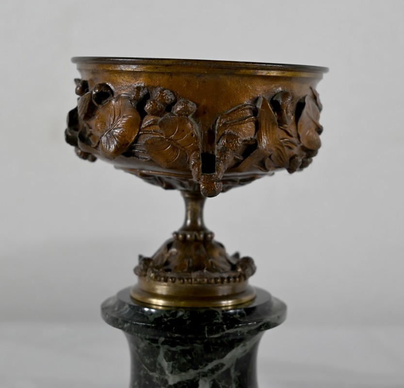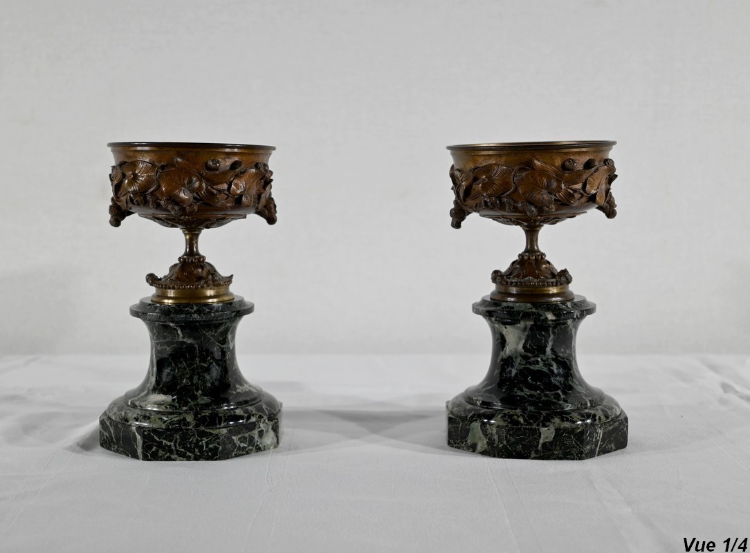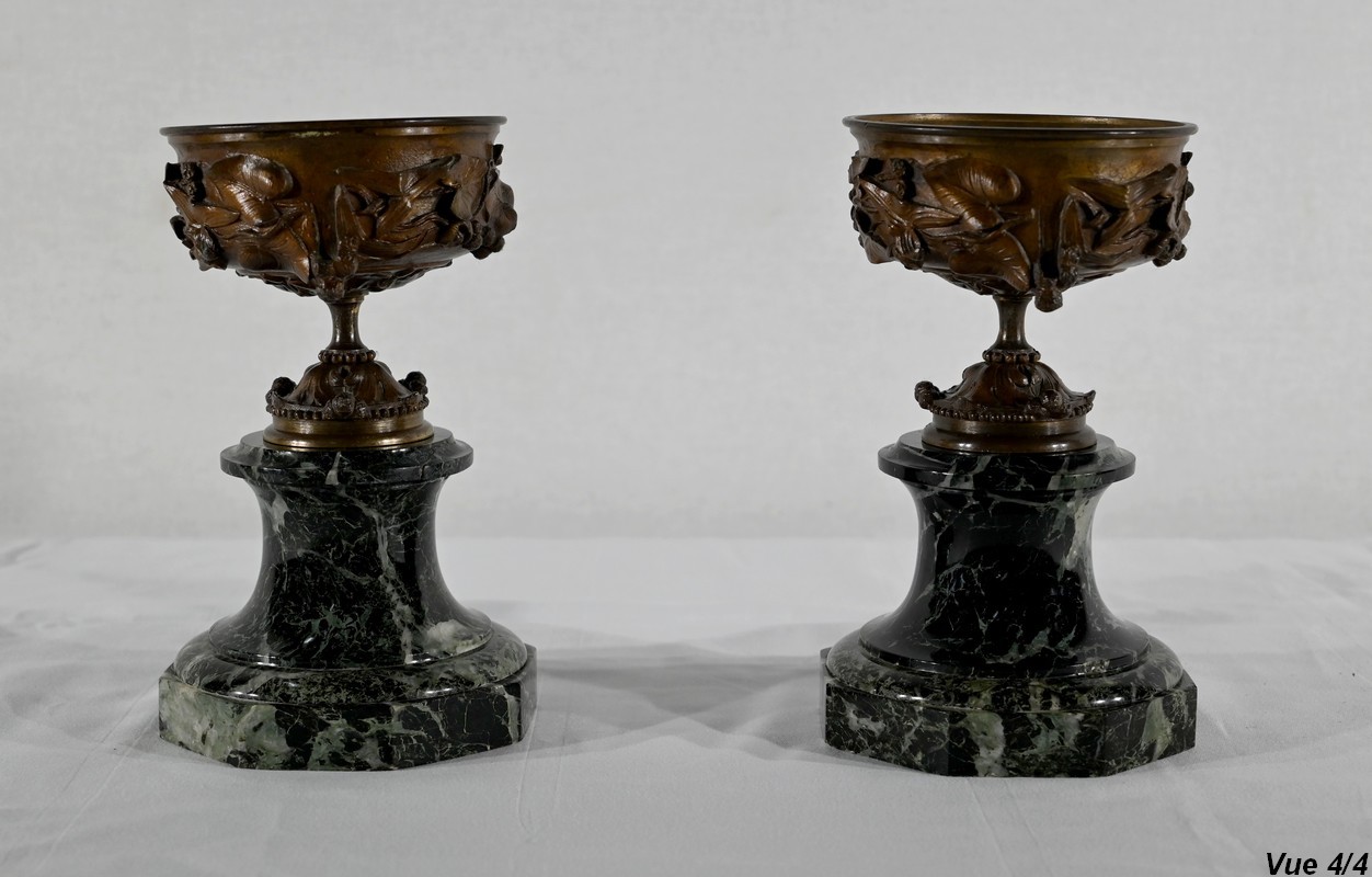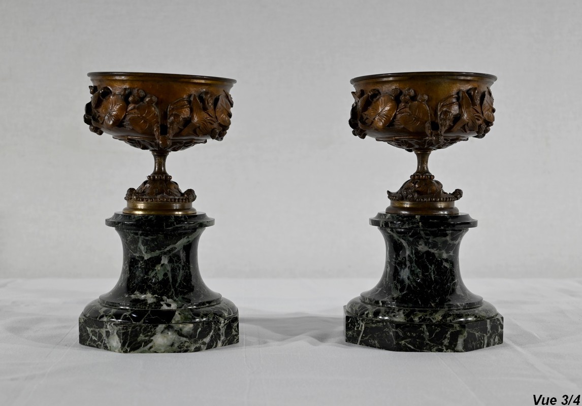 Paire de coupes en bronze à patine mordorée à décors en relief, dans le goût restauration, de feuillage, de baies et de fleurs sur le corps et le pied. Elles reposent sur un piédouche en marbre vert de mer à base moulurée et octogonale.