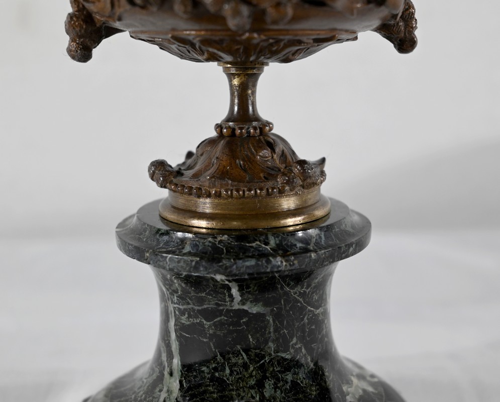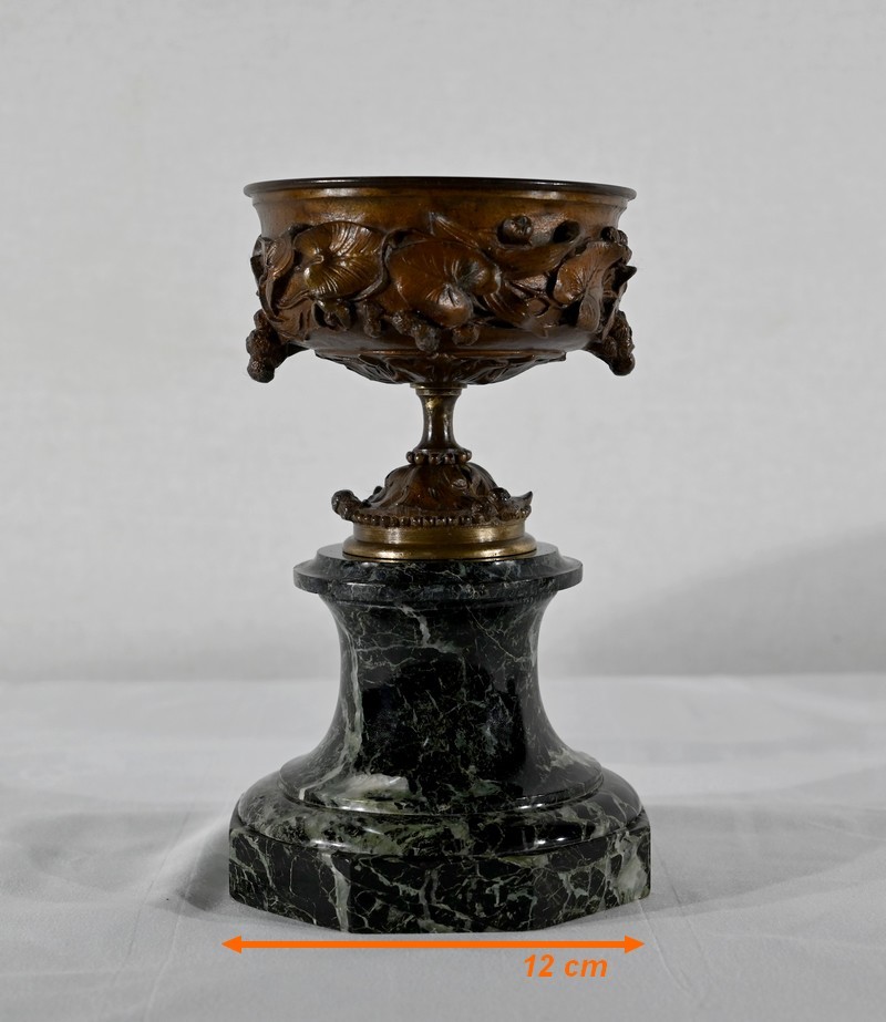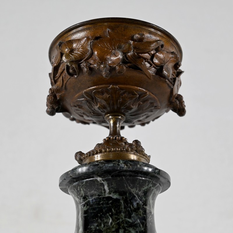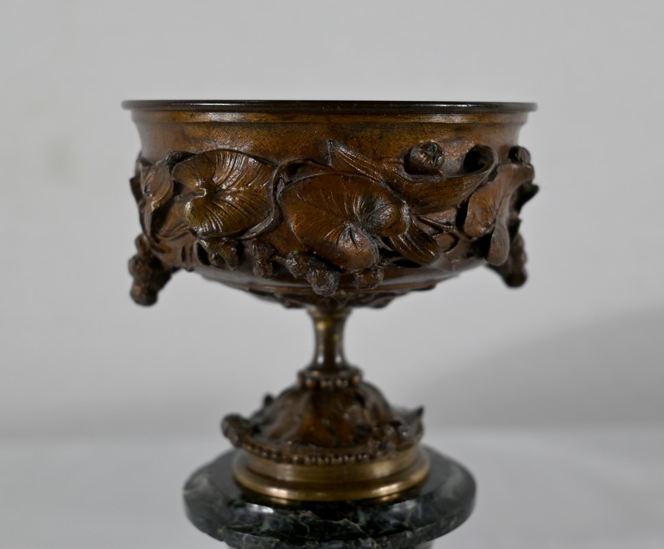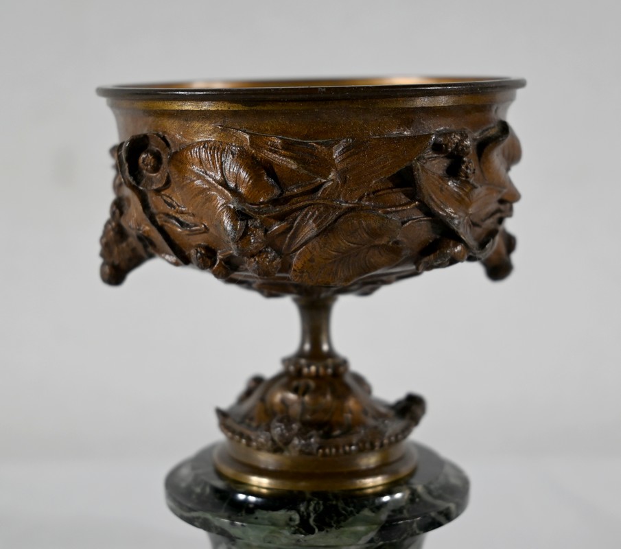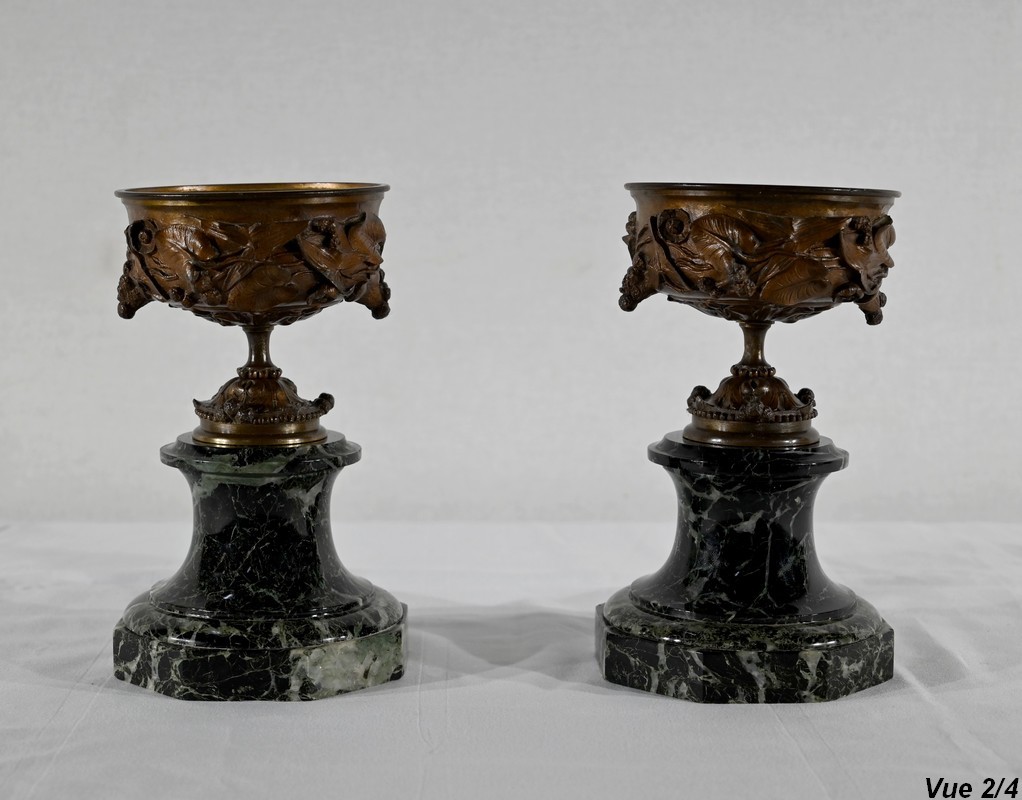 Paire de coupes en bronze à patine mordorée à décors en relief, dans le goût restauration, de feuillage, de baies et de fleurs sur le corps et le pied. Elles reposent sur un piédouche en marbre vert de mer à base moulurée et octogonale.