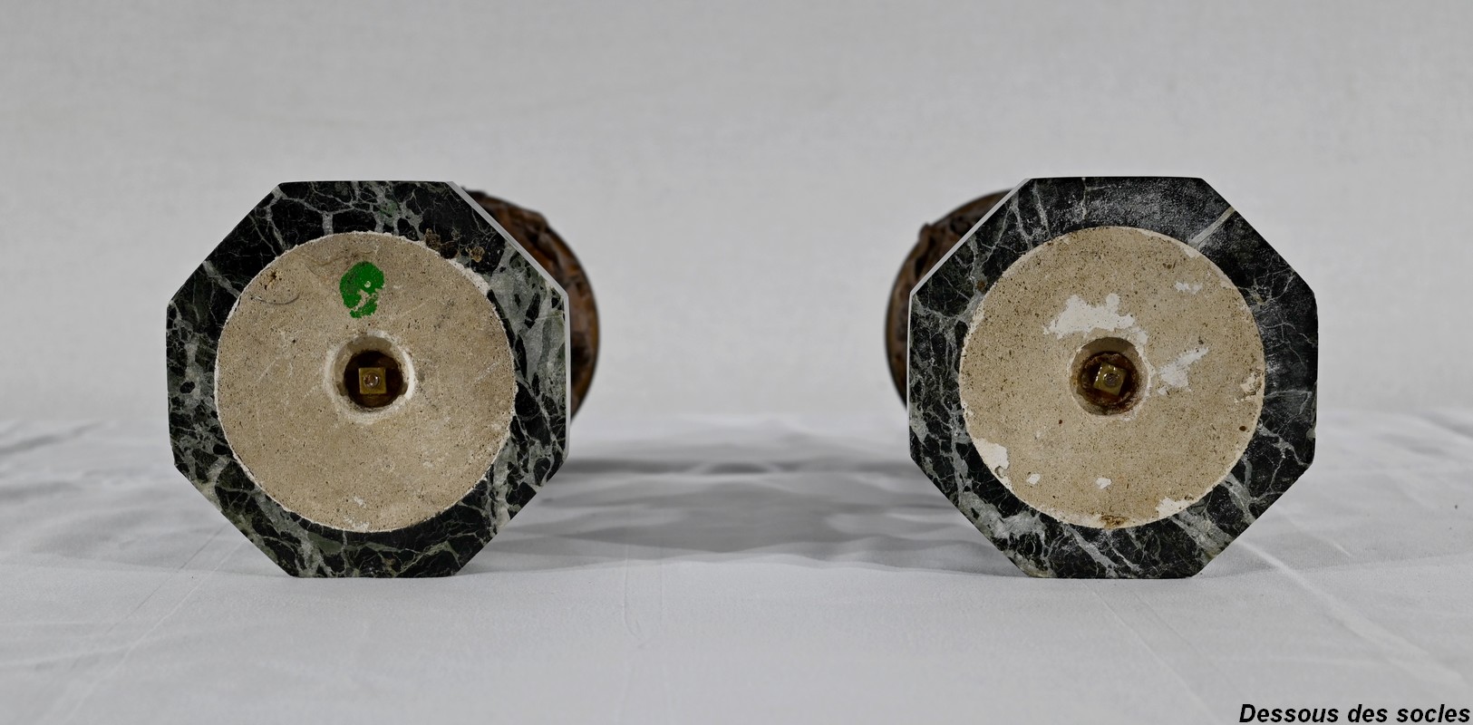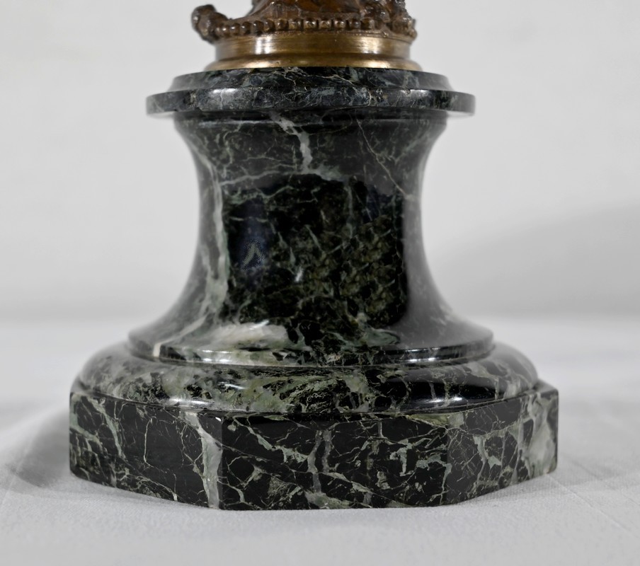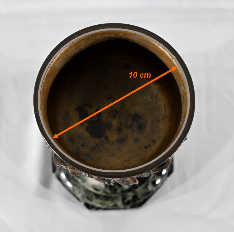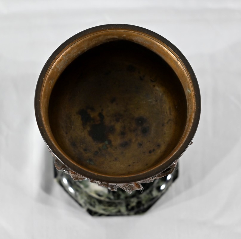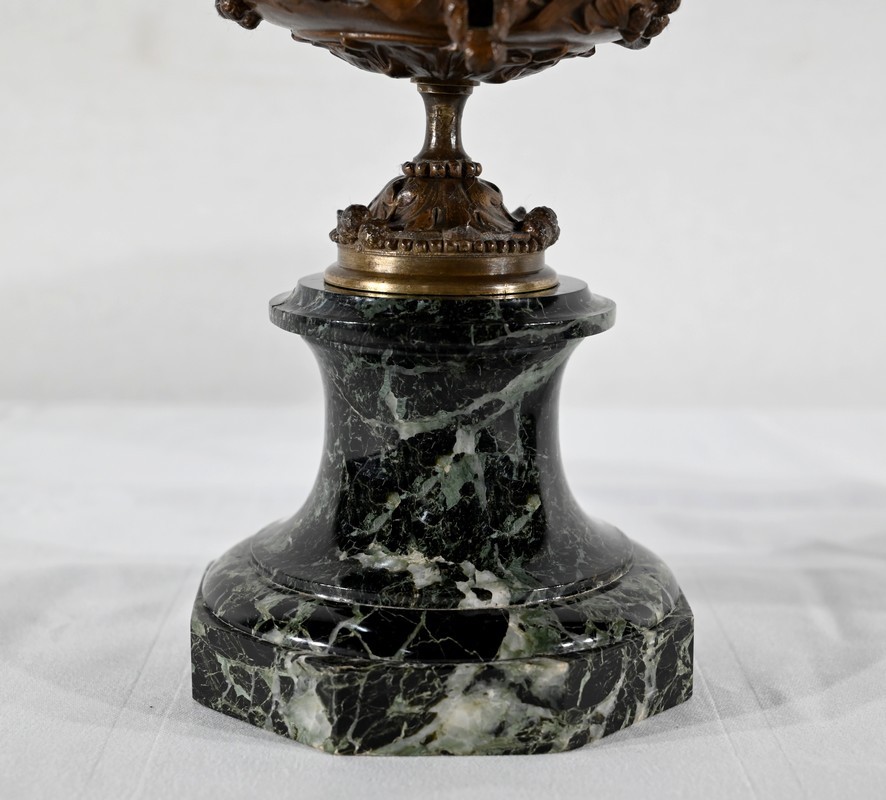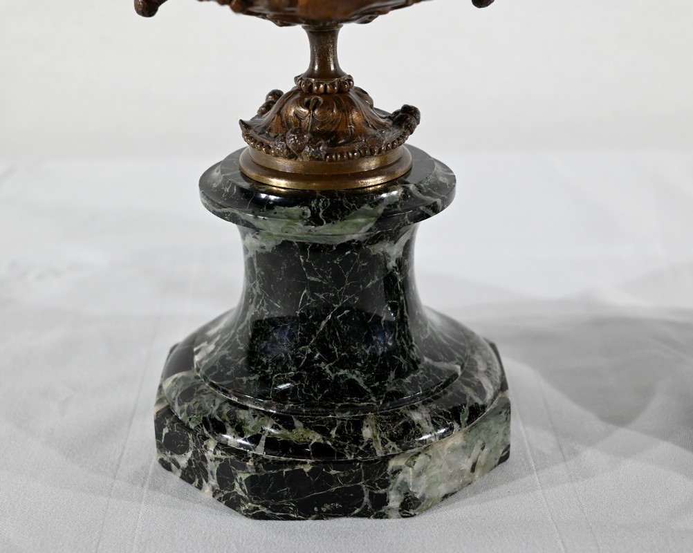 Paire de coupes en bronze à patine mordorée à décors en relief, dans le goût restauration, de feuillage, de baies et de fleurs sur le corps et le pied. Elles reposent sur un piédouche en marbre vert de mer à base moulurée et octogonale.