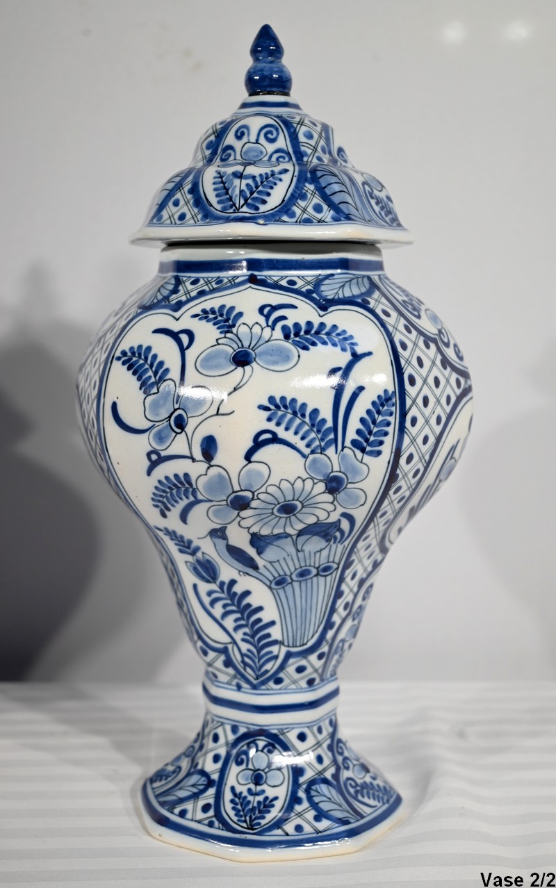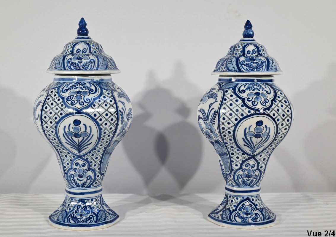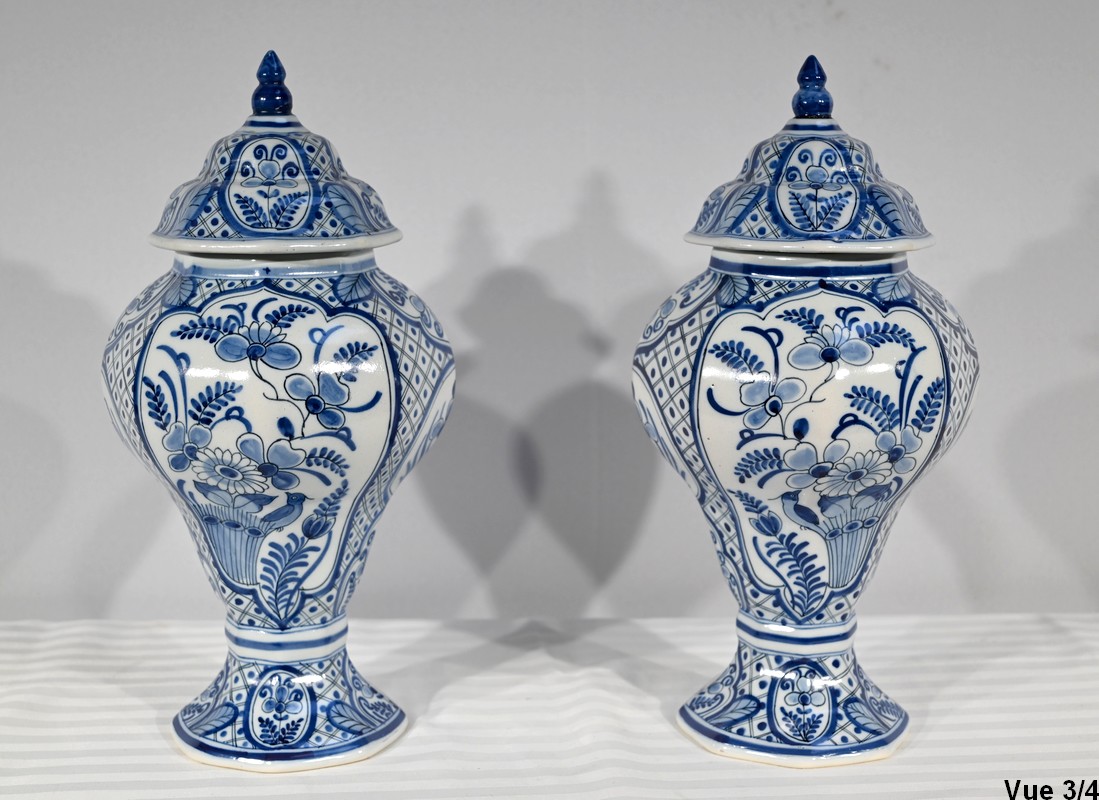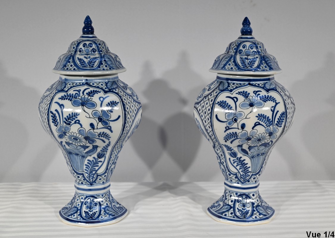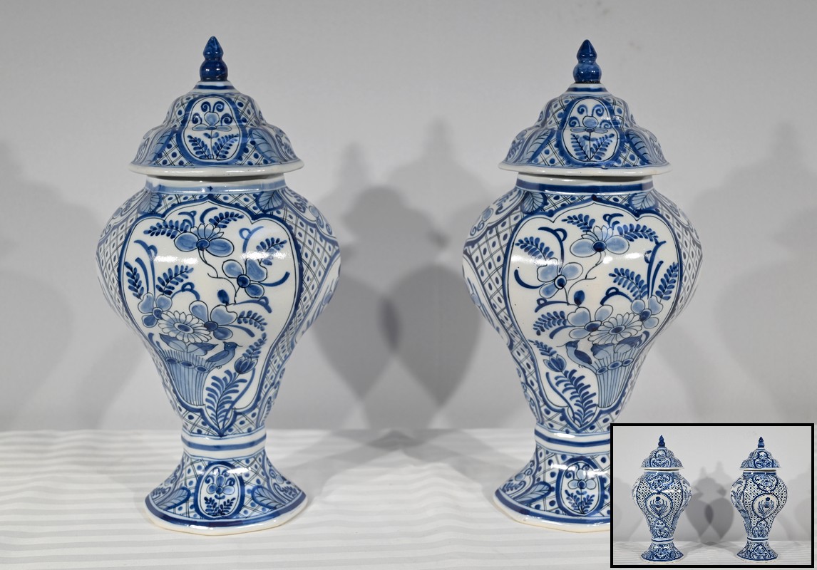 Ces vases, signés sous chaque fond, se structure d’un email blanc brillant et de motifs « bleu de Delft ». Ils sont illustrés de décors identiques mais inversés, de fleurs, de feuillage, et d’oiseaux en cartouche, entourés de quadrillage. Les couvercles sont sommés de boutons de préhension en pointe.