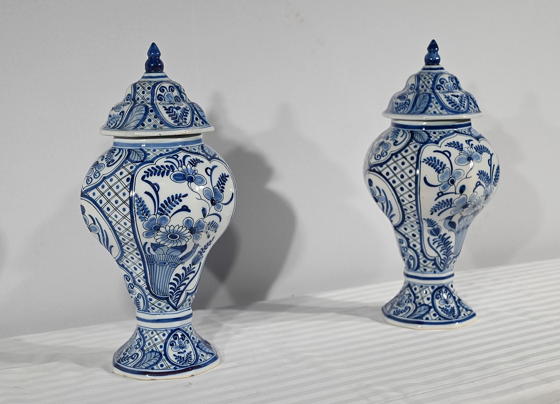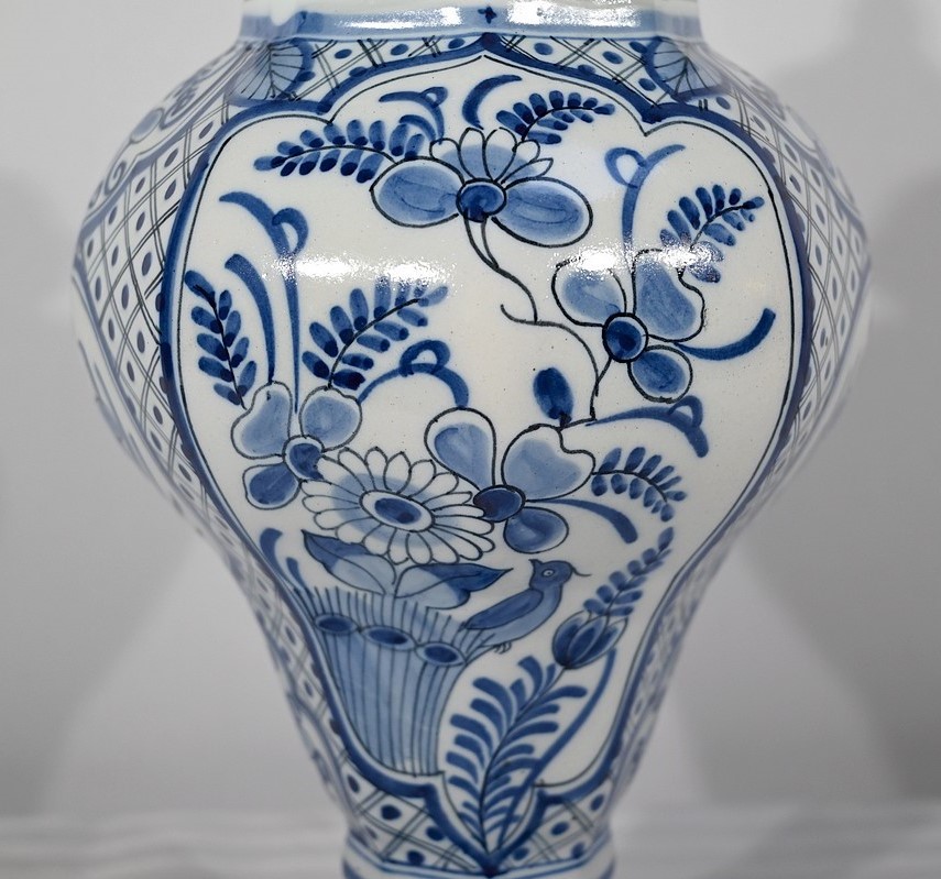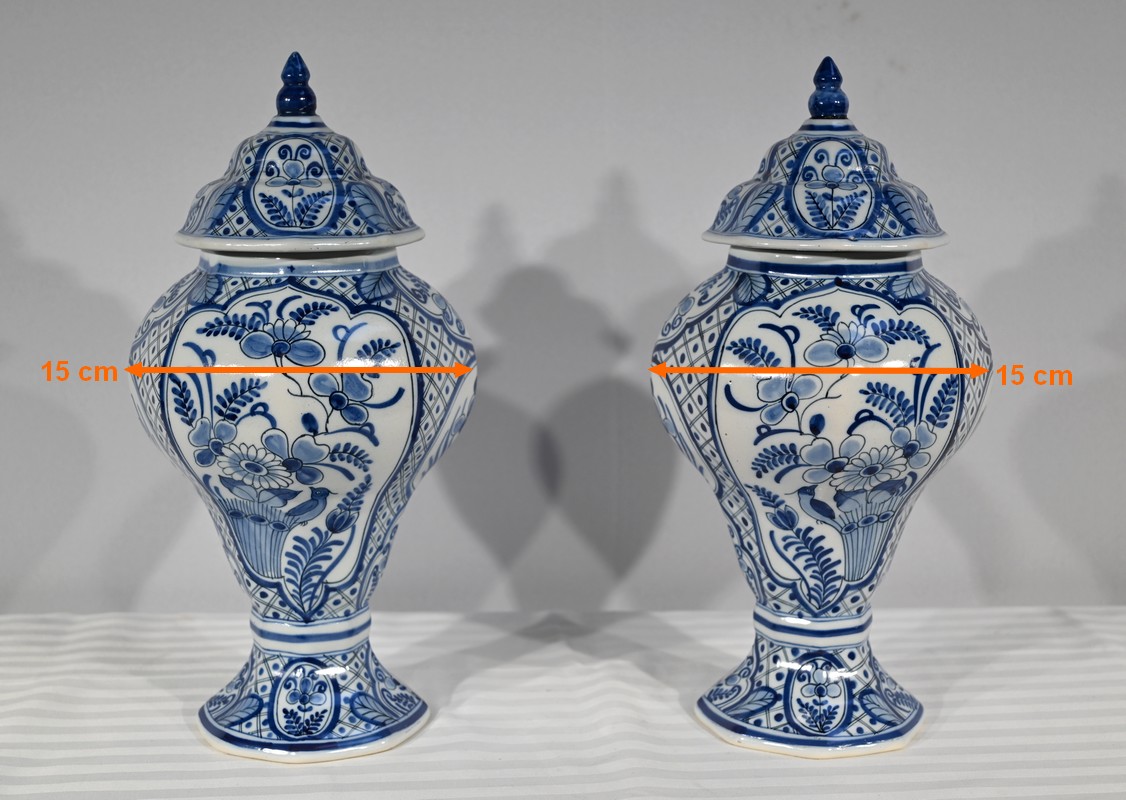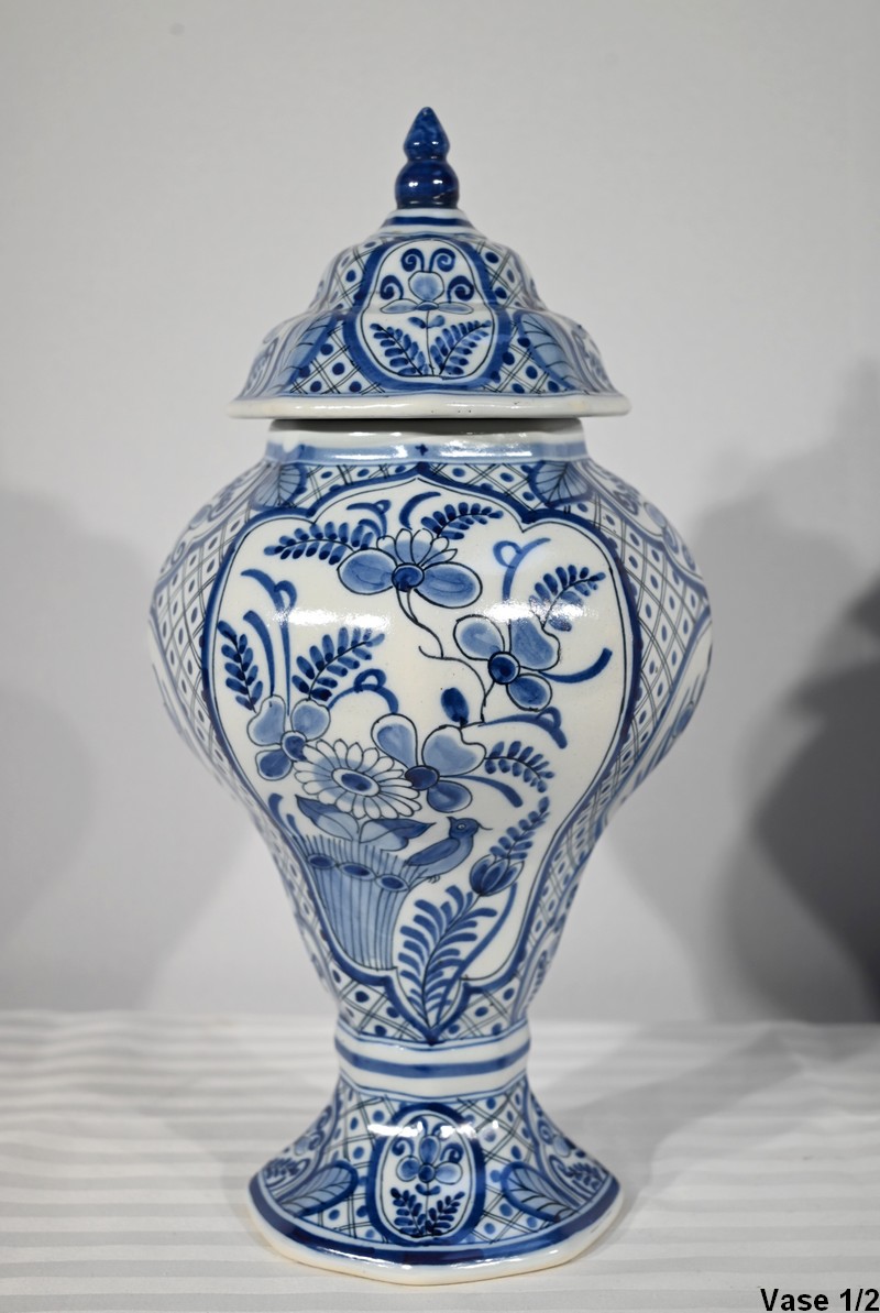 Ces vases, signés sous chaque fond, se structure d’un email blanc brillant et de motifs « bleu de Delft ». Ils sont illustrés de décors identiques mais inversés, de fleurs, de feuillage, et d’oiseaux en cartouche, entourés de quadrillage. Les couvercles sont sommés de boutons de préhension en pointe.