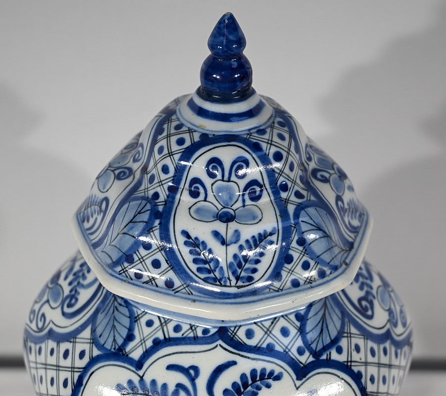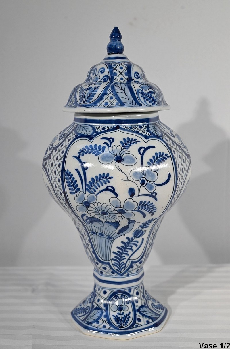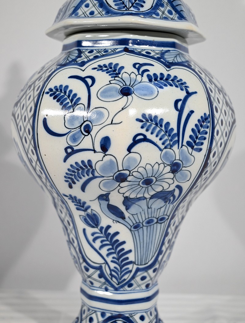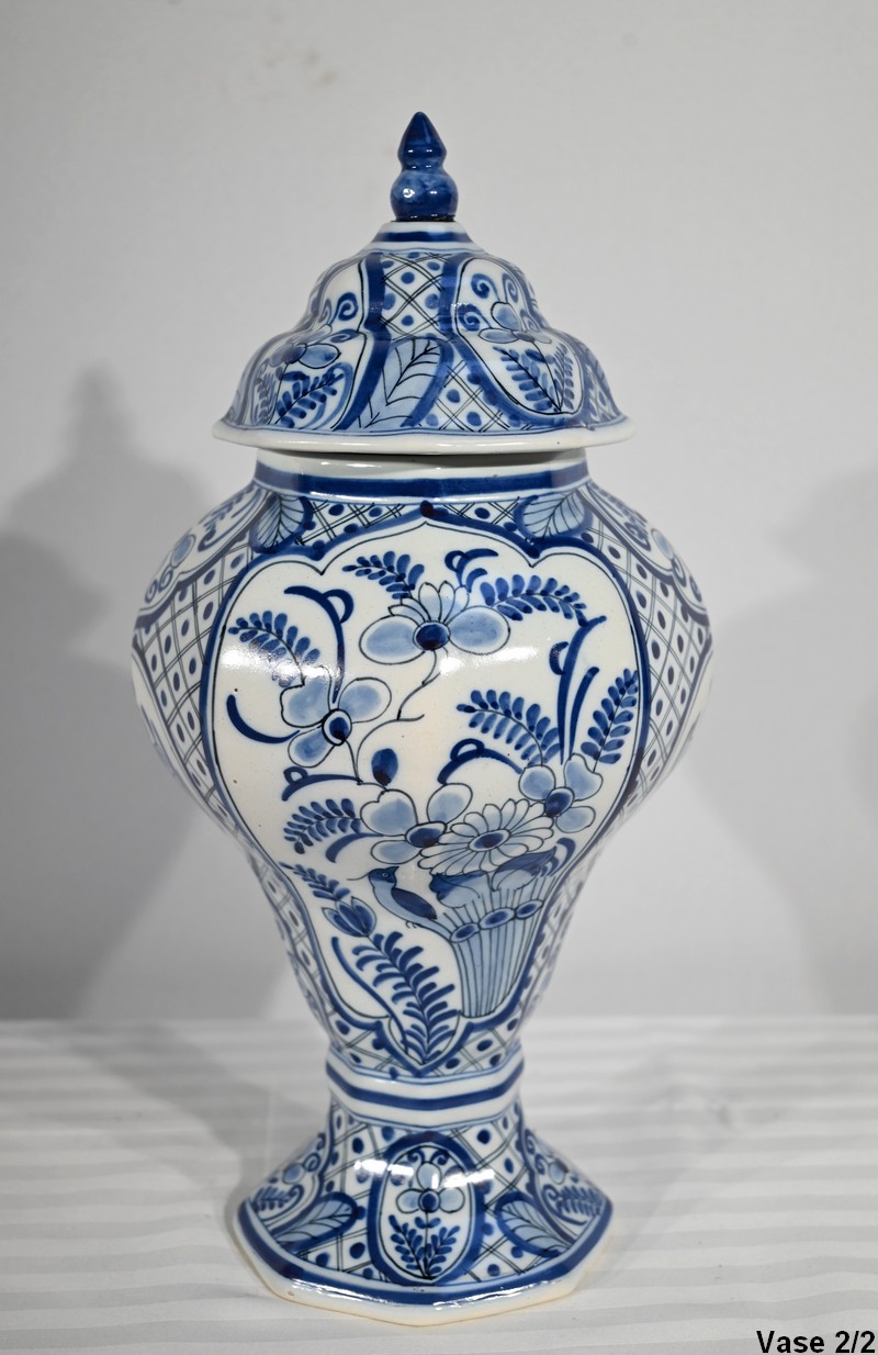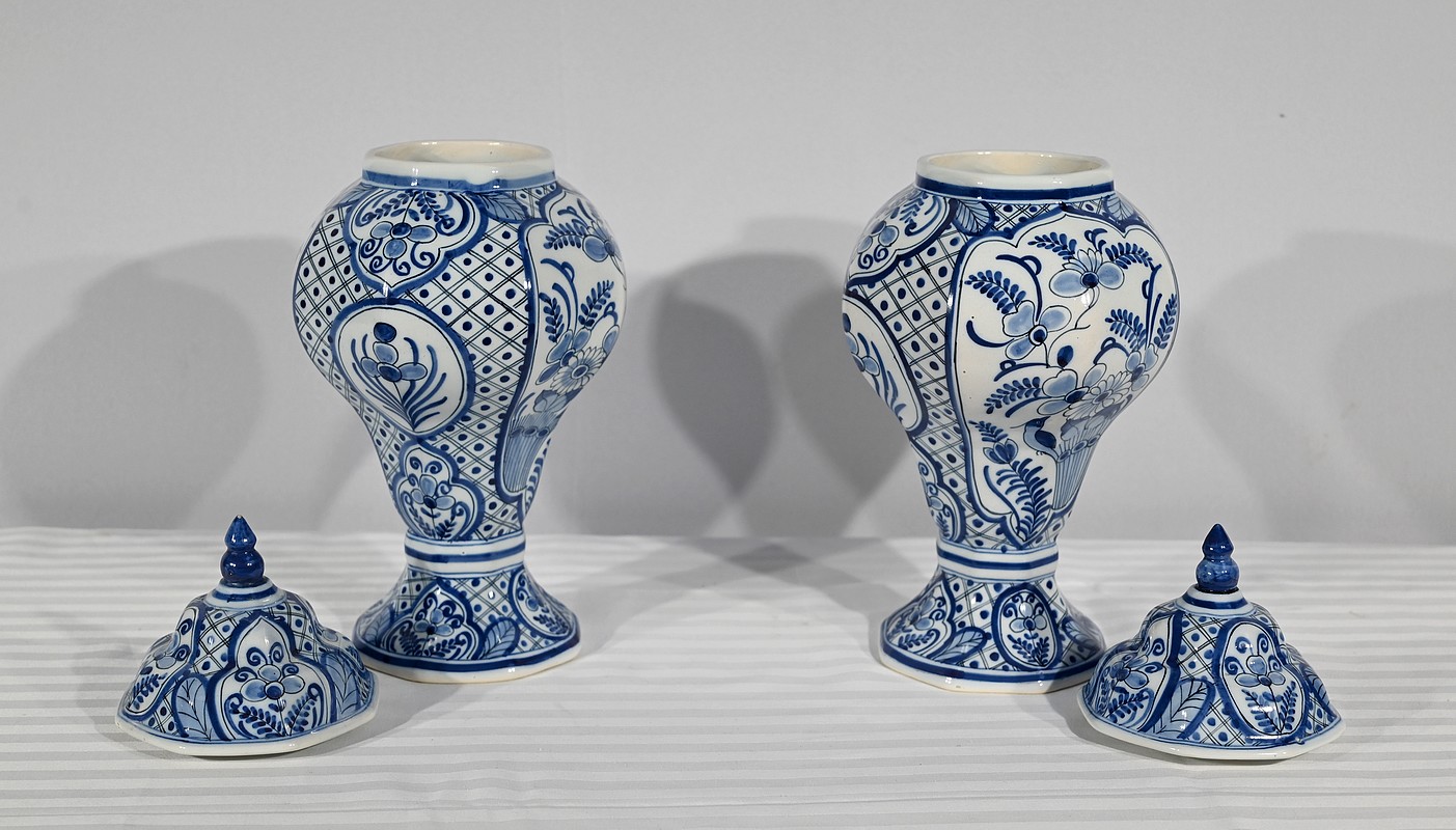 Ces vases, signés sous chaque fond, se structure d’un email blanc brillant et de motifs « bleu de Delft ». Ils sont illustrés de décors identiques mais inversés, de fleurs, de feuillage, et d’oiseaux en cartouche, entourés de quadrillage. Les couvercles sont sommés de boutons de préhension en pointe.