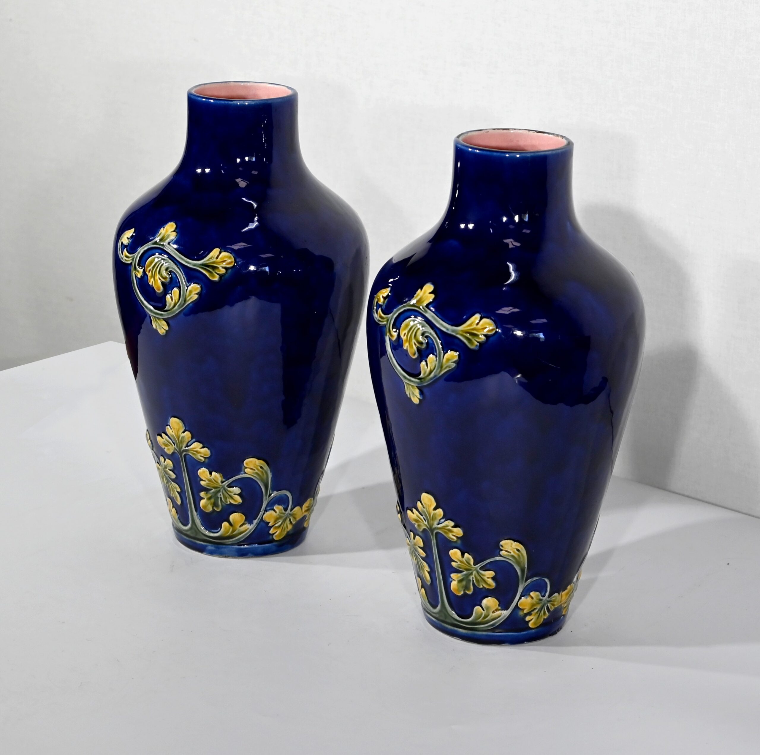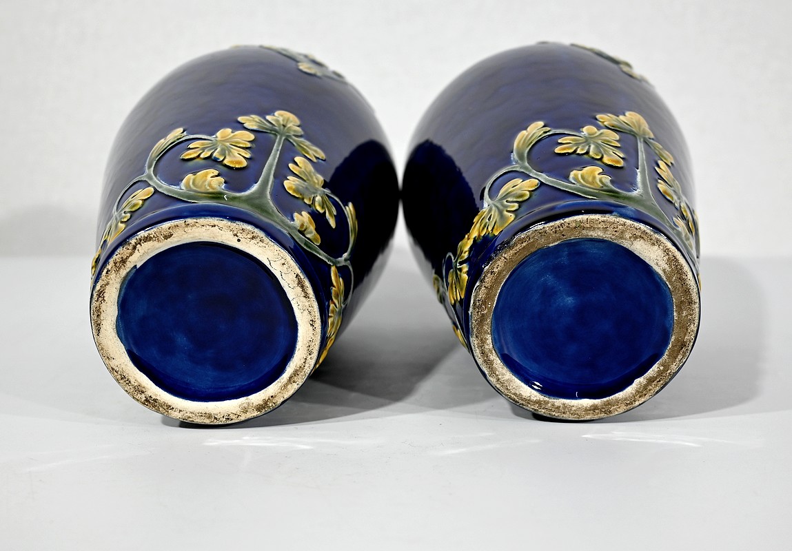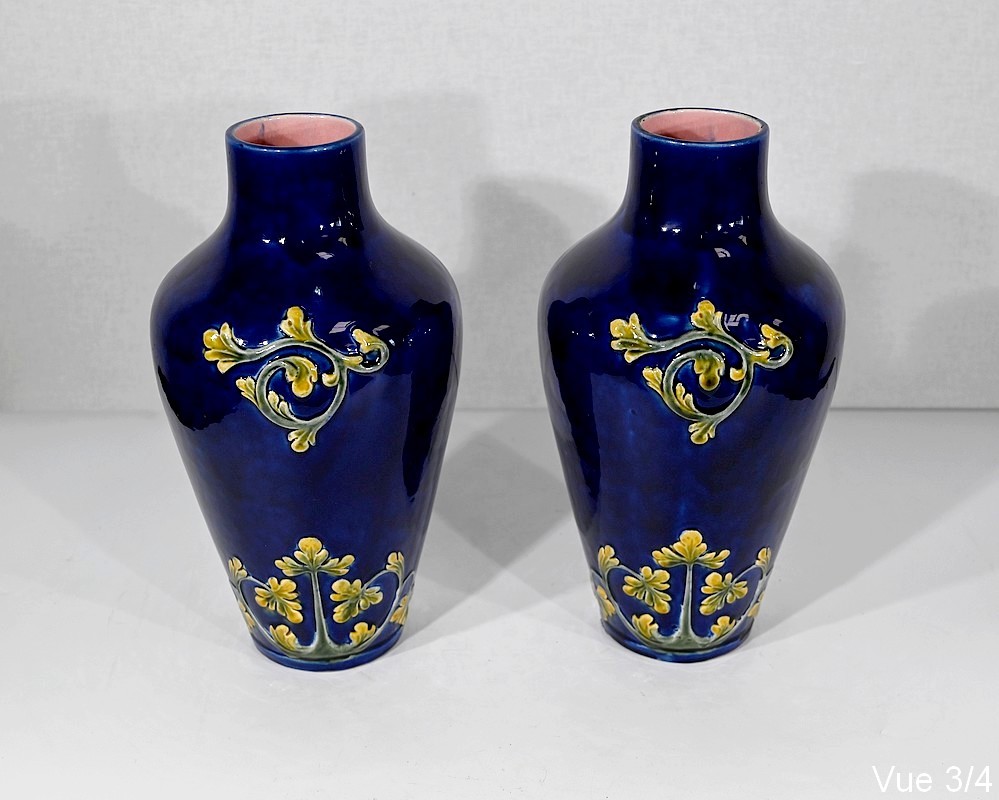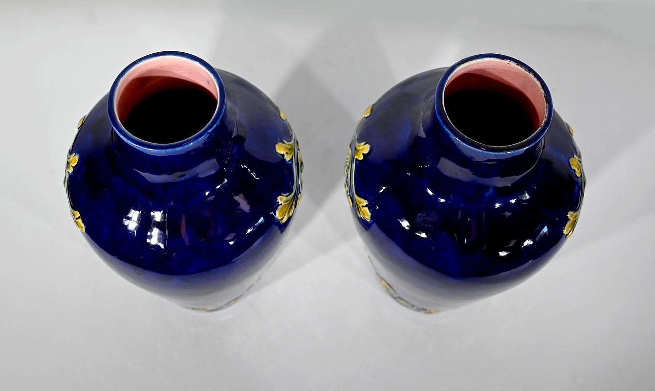 Paire de vases balustres Art Nouveau, en céramique de couleur bleu cobalt, décorés de fleurs jaunes et de feuillages.