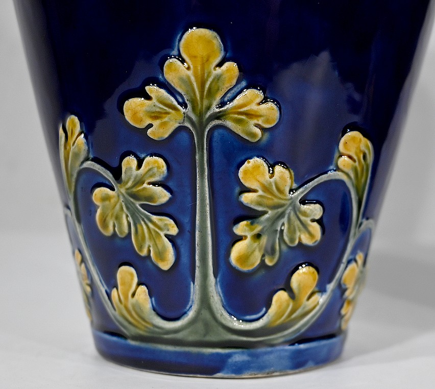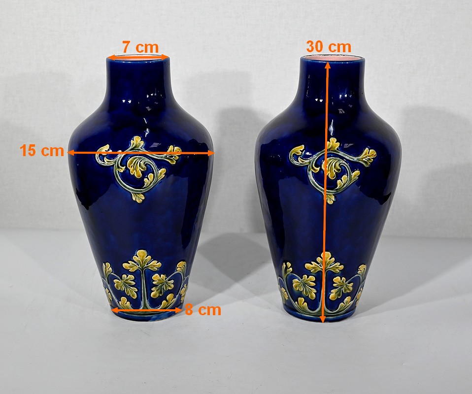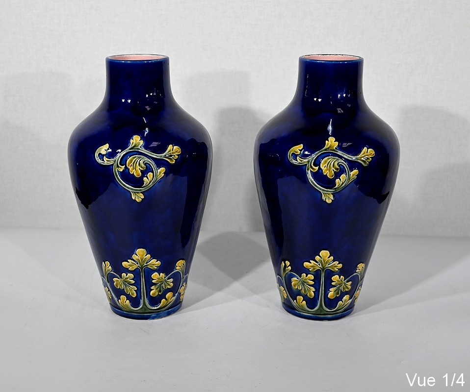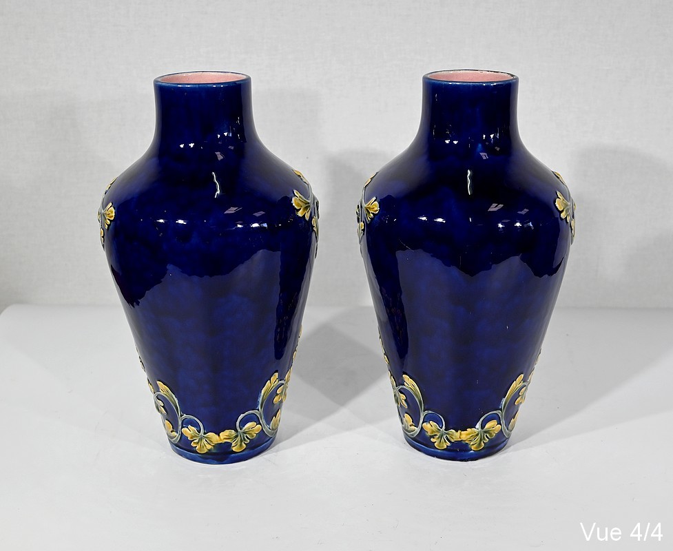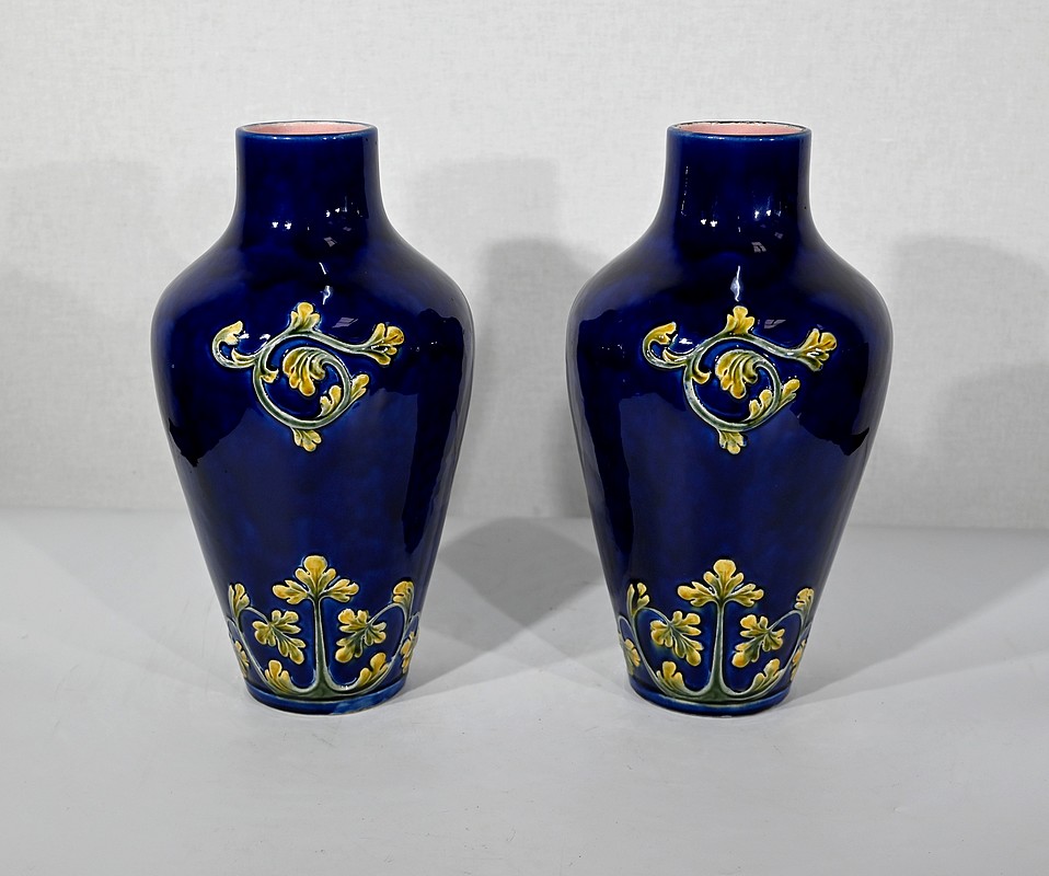Paire de vases balustres Art Nouveau, en céramique de couleur bleu cobalt, décorés de fleurs jaunes et de feuillages.