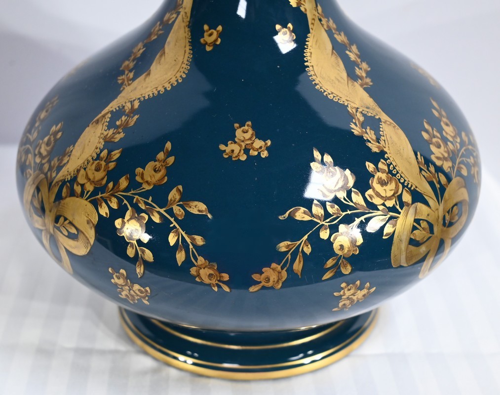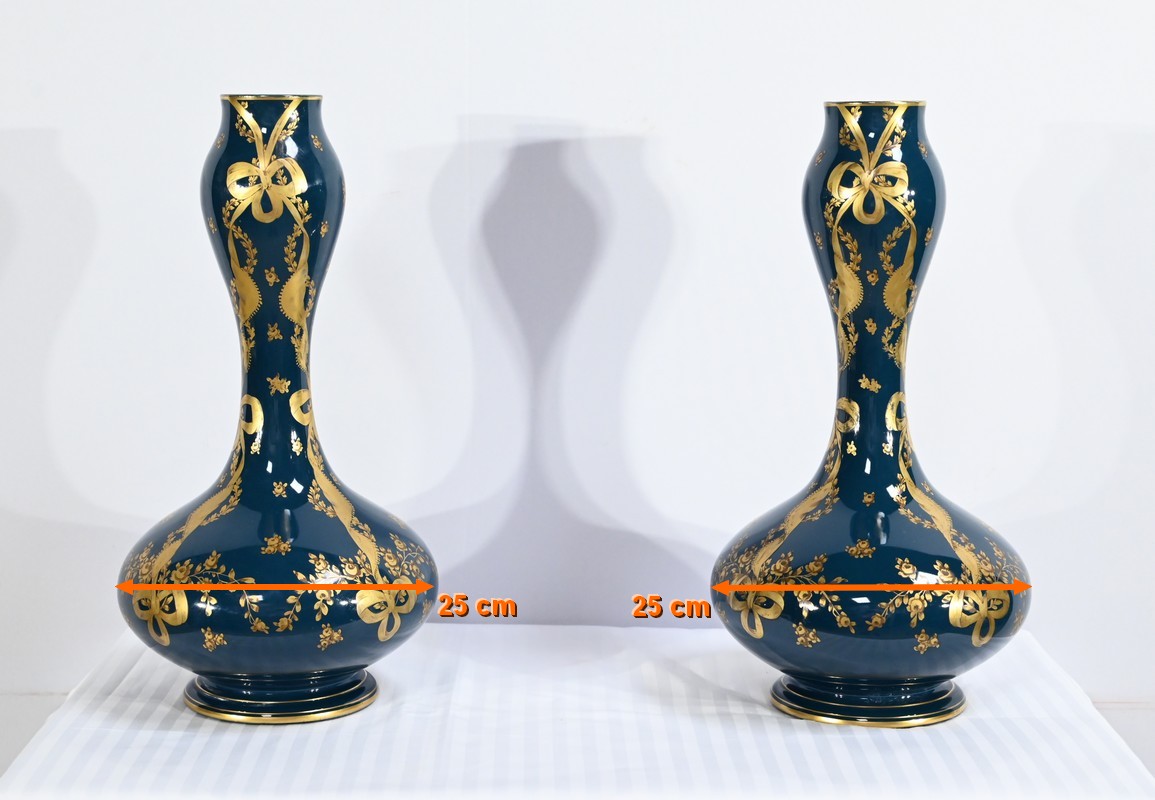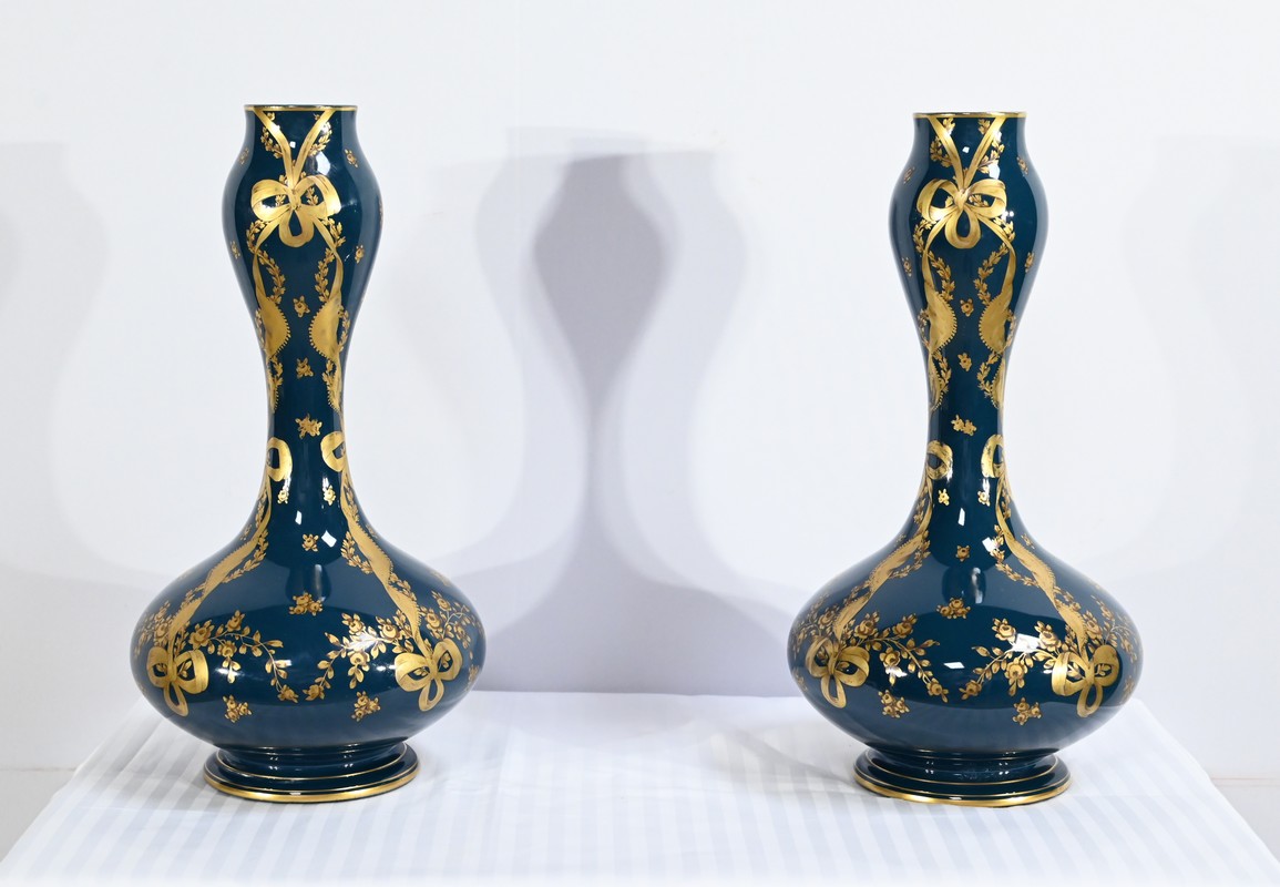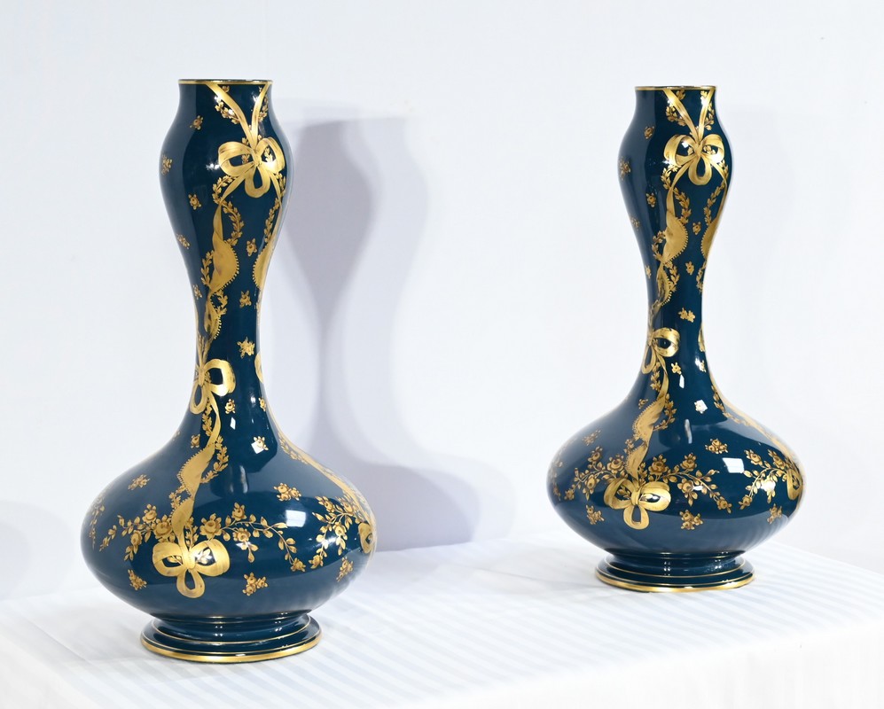 Paire de vases en céramique de Gien, datant de la fin du XIXe siècle, à décors dorés de rubans noués et de fleurs sur fond couleur bleu d’Anvers.