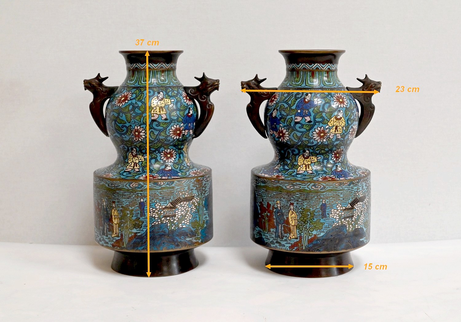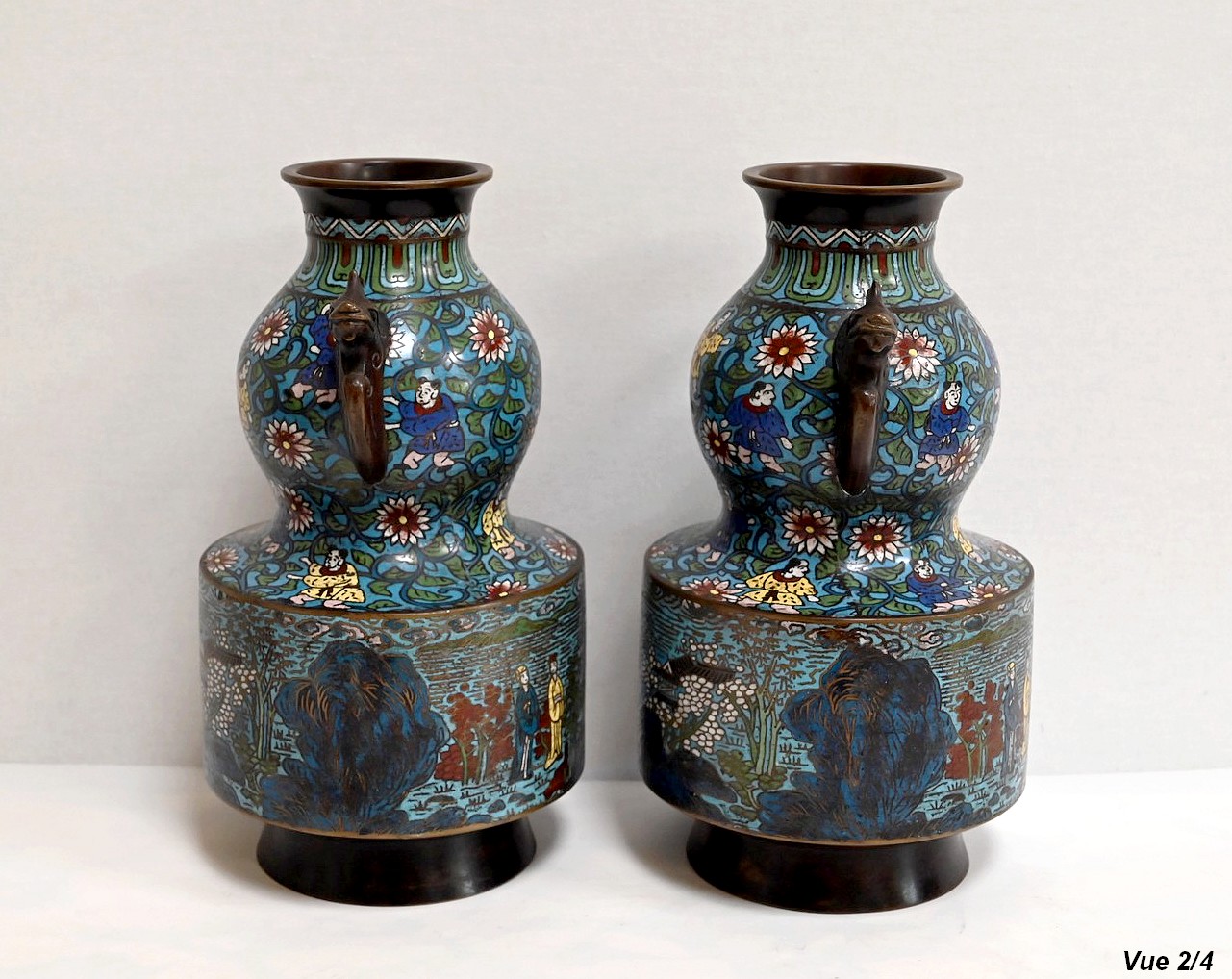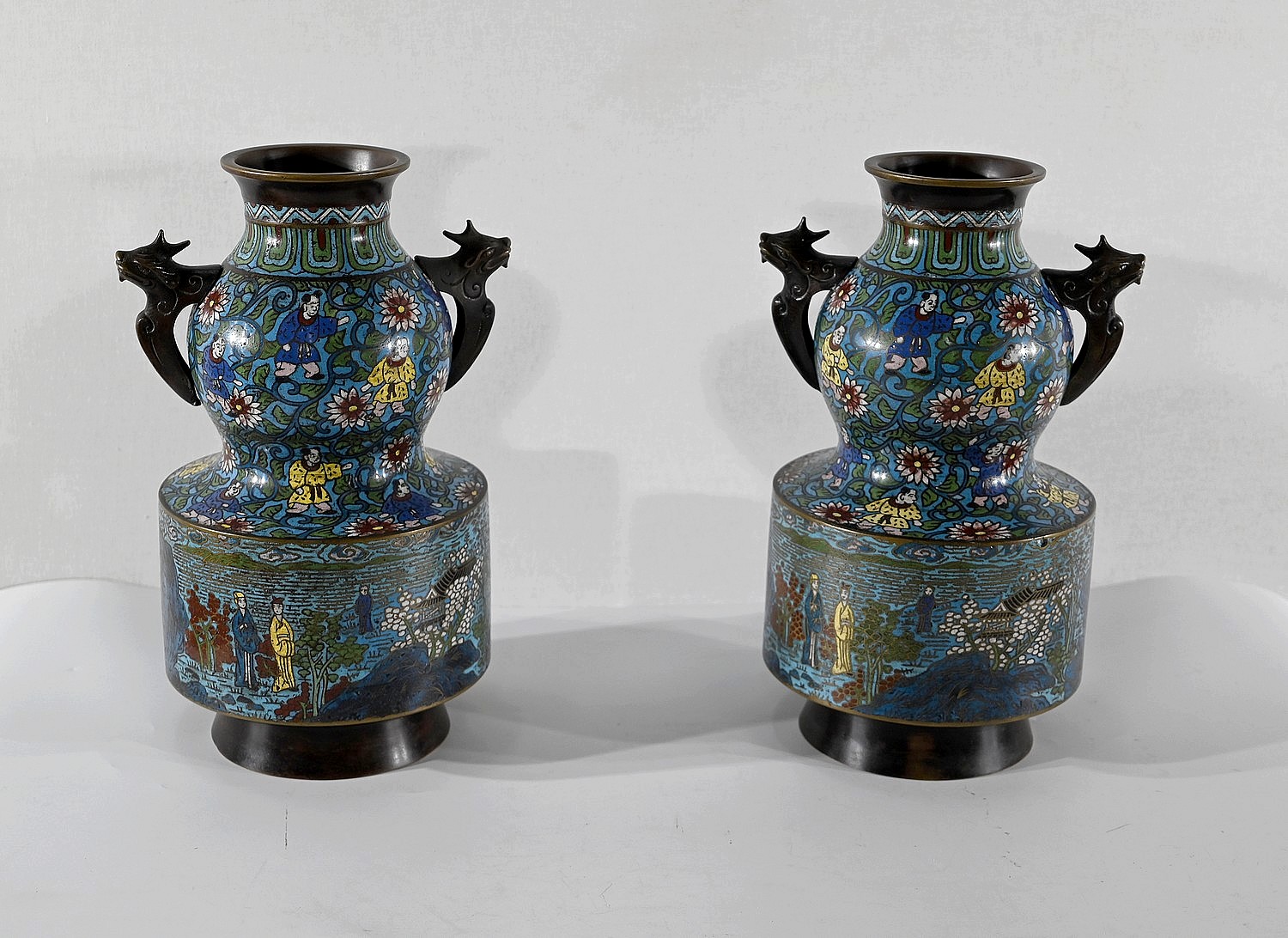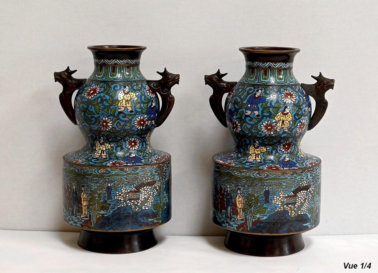 Cette paire de vase en émaux cloisonnés se compose d’une panse en deux parties. La plus basse, de forme cylindrique représente des scènes de vie japonaise, avec des personnages en kimonos et des pagodes. Différentes nuances de bleus parsemées de jaune, blanc, et vert, apportent de la profondeur à ces illustrations.